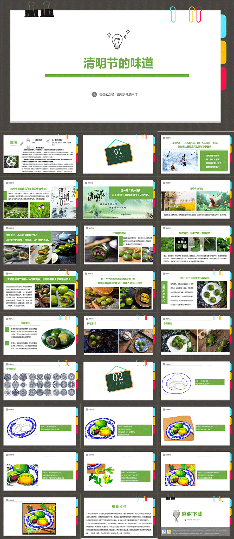 通过观察和参考图片素材和视频资料,了解清明节这一传统节日以及中国的传统文化知识,了解相关清明节的节日习俗。以青团这一清明节小食使得小朋友们对这一传统节日得到详细的认知,培养小朋友们认识了解传统文化的基础上激发小朋友们的创作兴趣。