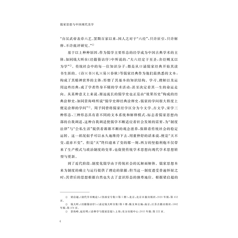 中国现代美学之所以是现代形态的中国美学,而非西方现代美学在中国,关键原因之一即对于传统学术思想的继承和转化,而儒学又是中国传统学术思想的主体。中国现代美学的早期代表如王国维、蔡元培、梁启超等,幼年至青年时期均接受正统儒家教育。出生于1890年代的朱光潜、宗白华在童年时期亦深受儒家思想之影响。儒家思想一方面构成了中国现代美学家接受西方美学的前理解结构,在其接受西学时不断与之化合,产生了“视域融合”的理论结果。另一方面,中国现代美学家不断利用其所理解的西方美学理论对传统儒家思想进行阐释,从而使传统儒学获得了适应现代语境的新生。以上两方面共同导致了独具形态与特色的中国现代美学的生成,进而构成了中华美学精神的重要组成部分。本书以王国维、蔡元培、梁启超、朱光潜、宗白华五位具有代表性的美学家为重点研究对象,探索其美学思想中的儒家思想因素。通过对其思想生成脉络的细致考察,寻绎儒家思想在此过程中所发生的推动效果和理论效应,进而揭示传统与现代之间的连续性以及中国现代美学的独特品质。