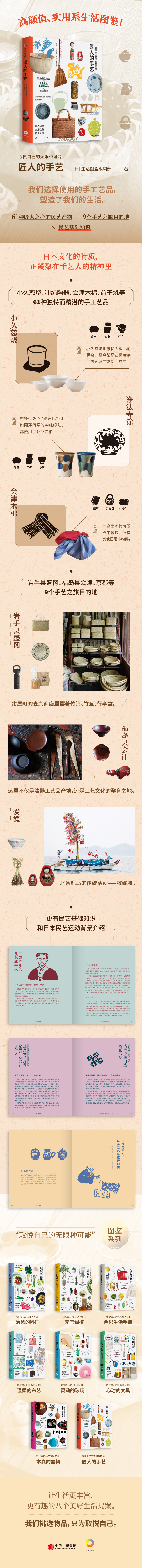 一套系列生活美学读物,取悦自我的美好生活提案。61种匠人之心的民艺产物:书中涵盖了来自不同地区、由61位匠人倾心创造的民艺产物。这包括了小久慈烧、净法寺涂、会津木棉、益子烧等61种独特而精湛的手工艺品,每一件都承载着匠人的用心和独特技艺。通过详细介绍这些产物,读者可以领略到日本各地不同文化传统的精髓。
