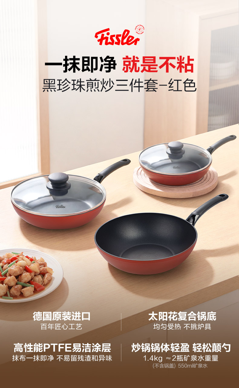 菲仕乐 德国进口黑珍珠煎炒三件套-红色赠盖铲