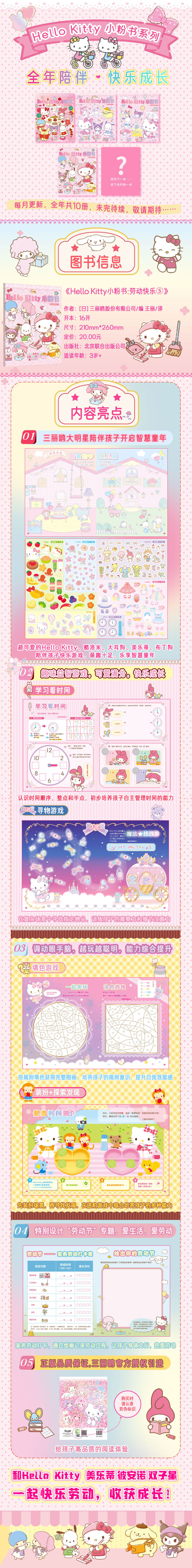 “Hello Kitty 小粉书” 系列按照时间顺序进行编辑、出版,每月更新一本,全年共 10 册,分别为《新年快乐①—②》《春天来了③》《一起阅读吧④》《劳动快乐⑤》《欢乐六一⑥》《快乐一夏天⑦—⑧》《开学新生活⑨》《收获的季节⑩》《快乐的 Kitty⑪》《冬天来了⑫》。本系列内容涵盖了迷宫、连线、画画、找不同、拼图、找相同、数字学习、折纸、手工、剪影、贴纸等思维训练游戏,让儿童在快乐游戏中动手动脑,提升专注力,综合培养创造力、审美力、观察力、想象力等多项能力。此外,为紧跟主题,增设了特别企划内容,贴近孩子日常生活和学习,让孩子眼前一亮的同时,提升游戏参与感和互动性。