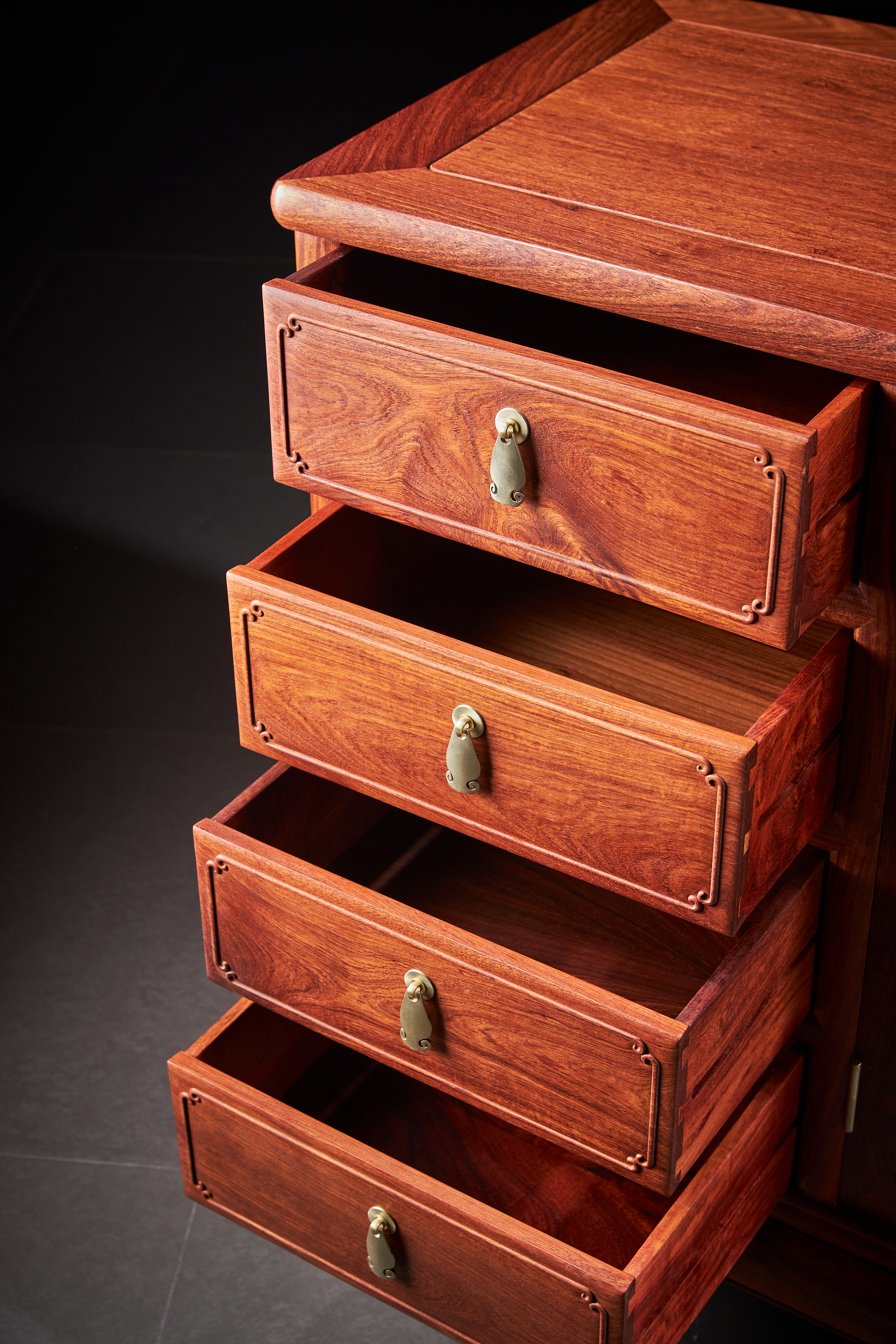 整体看似光素,仅柜门做对称如意纹,细看则处处讲究,云边包如意纹,内饰梅花,起六边格寓意和和美美,六六大顺,抽屉面板浮雕委角,简化如意纹,与柜门纹饰呼应,一曲卷云如意为生活增添诸多彩头。