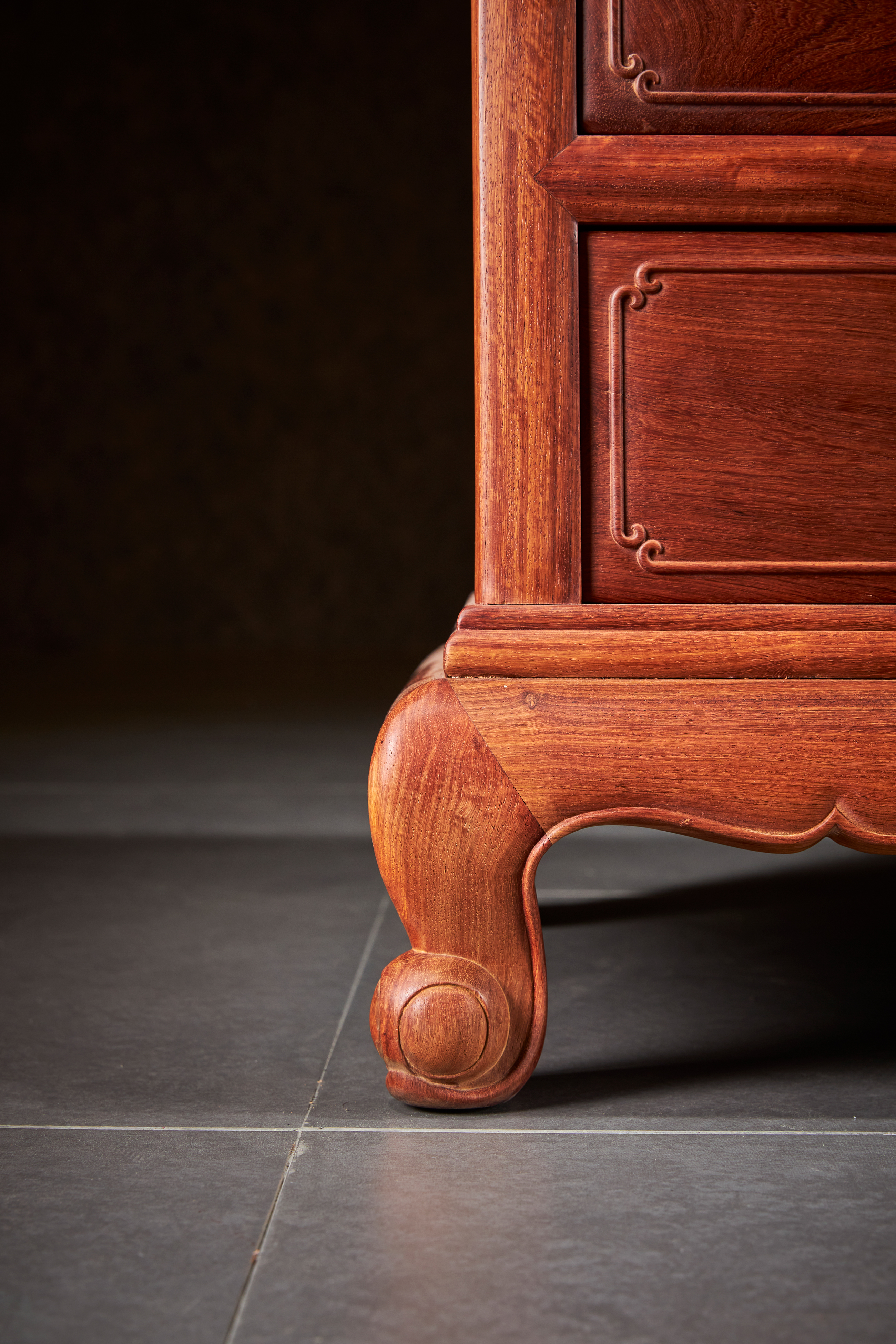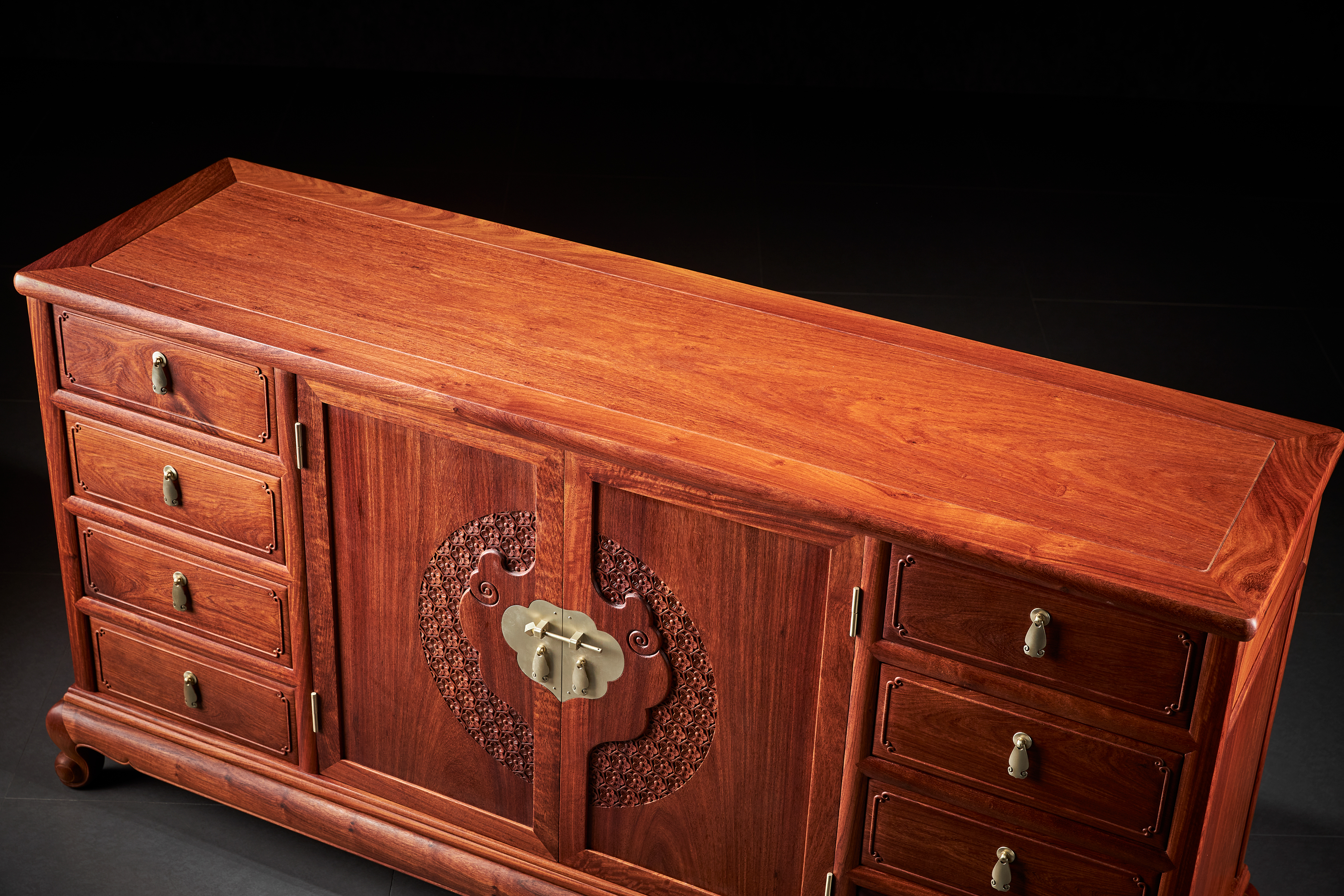 餐边柜是当代家居中的实用器物,此款缅甸花梨如意餐边柜,明式简约器型,于餐厅与餐桌共同使用,或作空间隔断,于客厅靠墙收纳陈设,于卧室做电视柜皆宜,款型原为托泥横枨式,后改为抱球弯腿,留出底部空间便于家庭卫生清理,也有团圆美满的寓意,传统榫卯结构精致,带八抽屉净深充足,柜体宏绰,有容乃大。