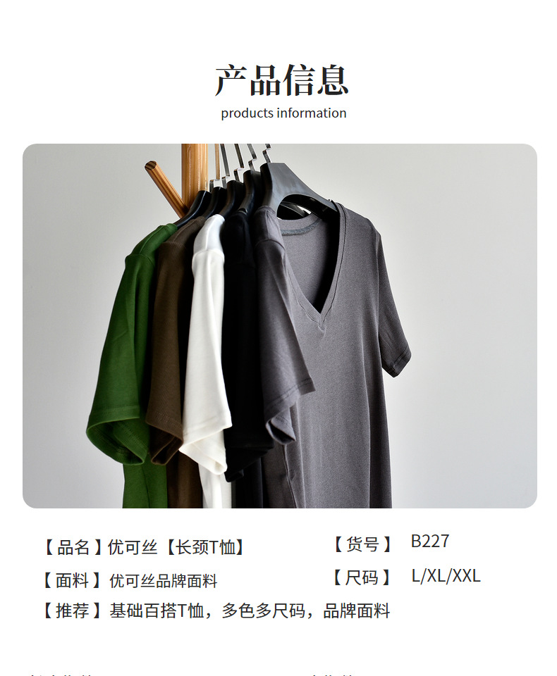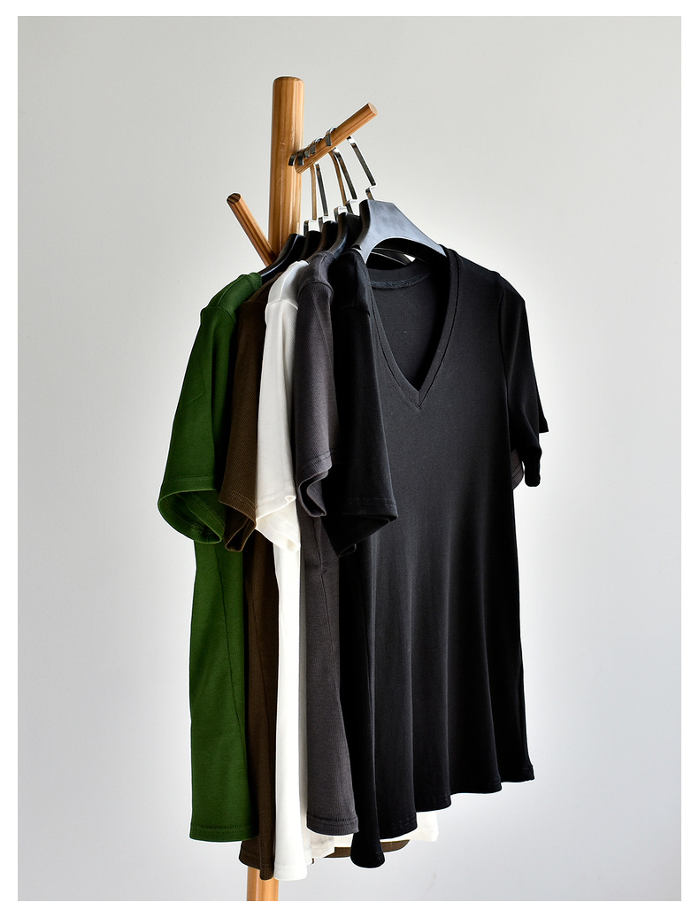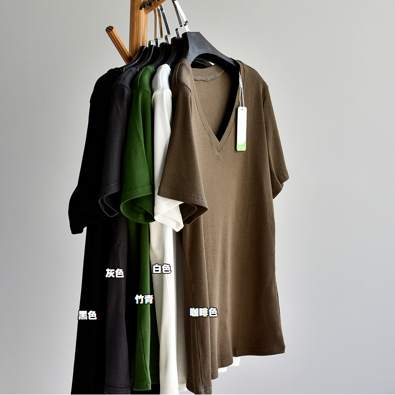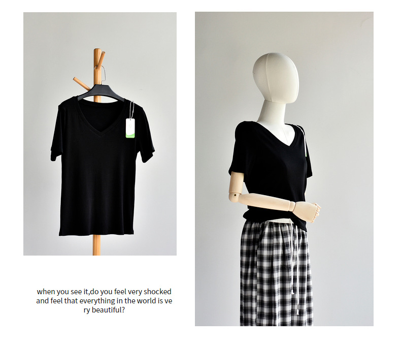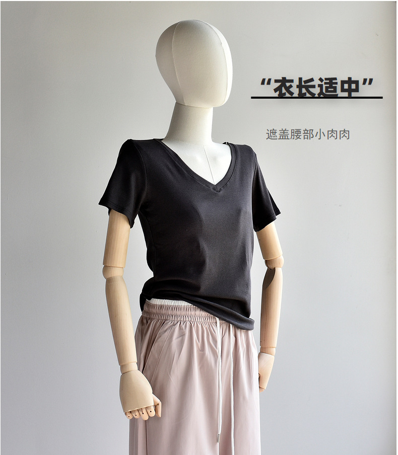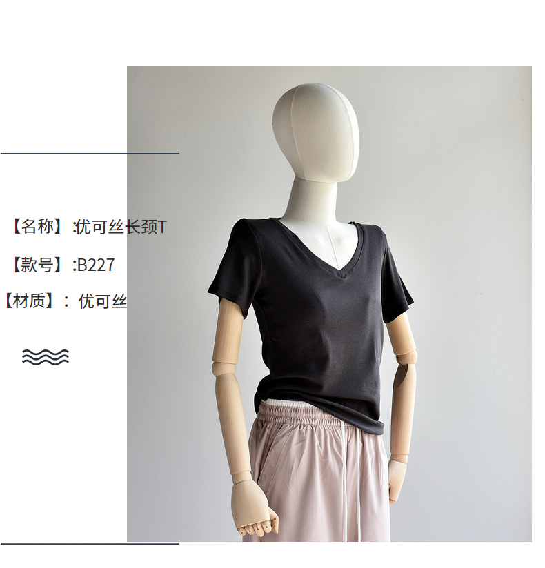 丁摩 【优可丝棉长颈T】黑色v领正肩女夏季半袖短袖t恤女大码上衣5ZF-B227