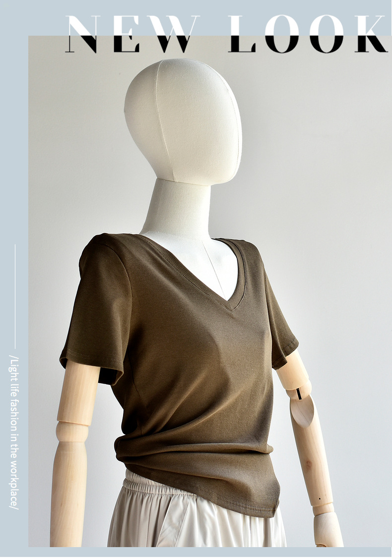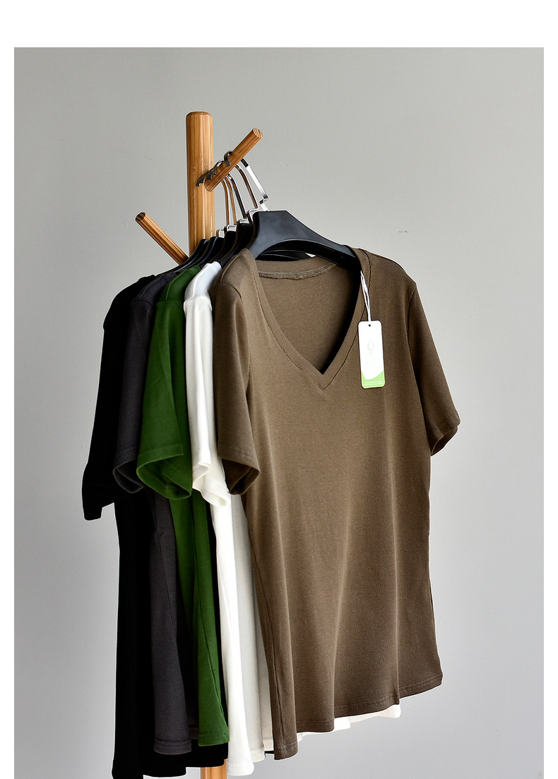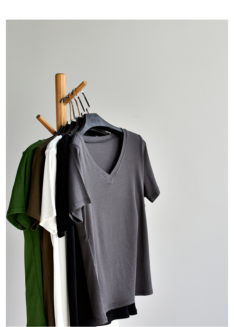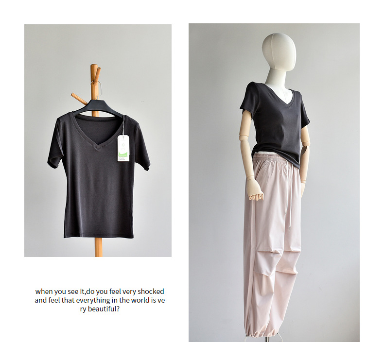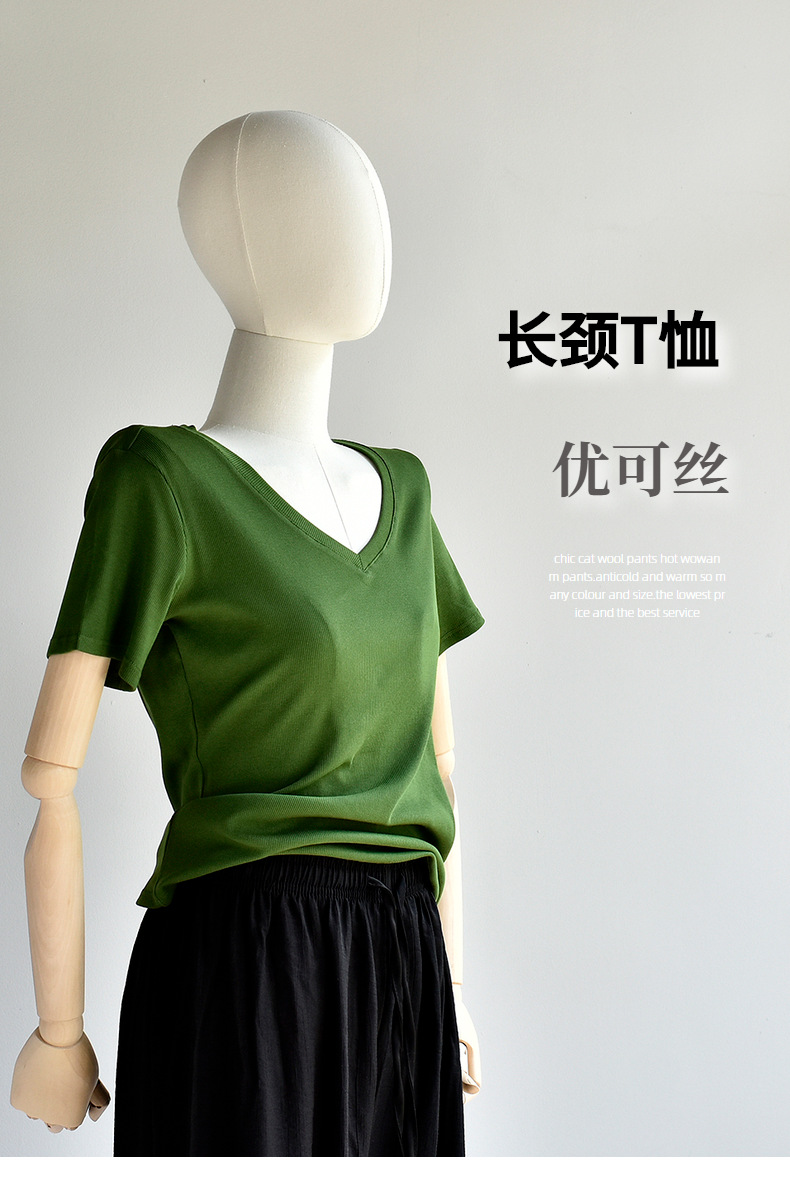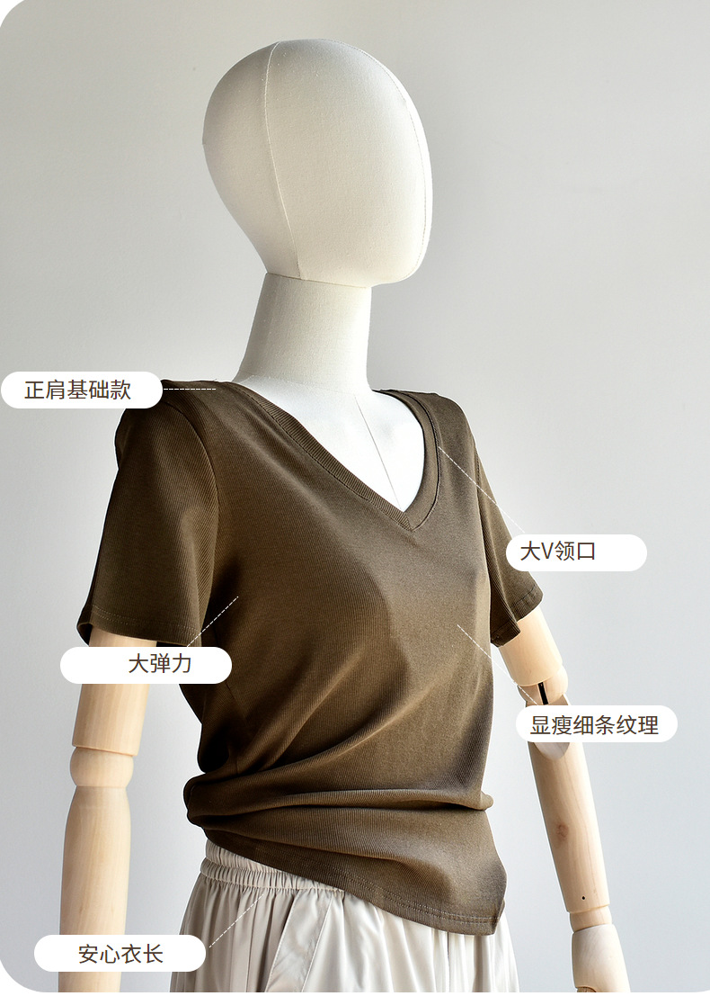 丁摩 【优可丝棉长颈T】黑色v领正肩女夏季半袖短袖t恤女大码上衣5ZF-B227