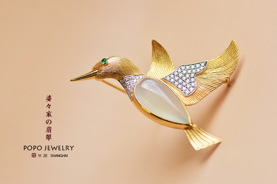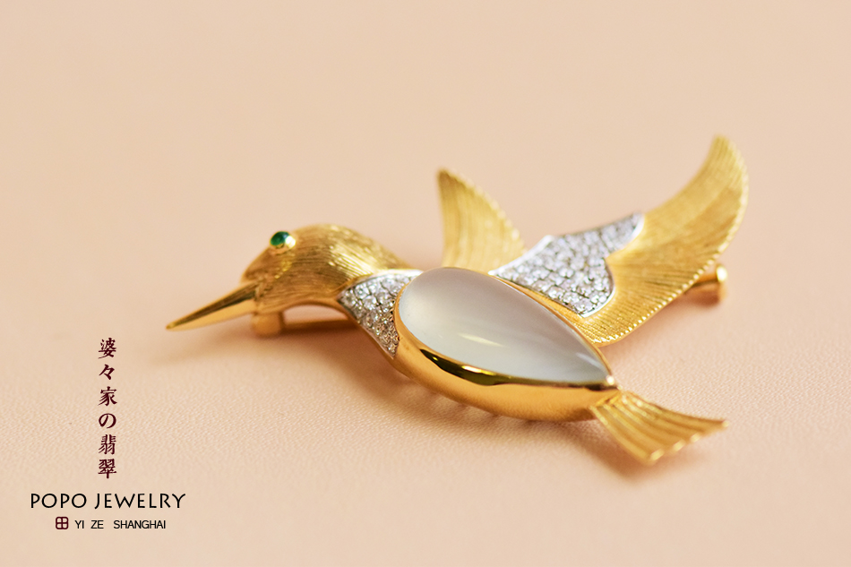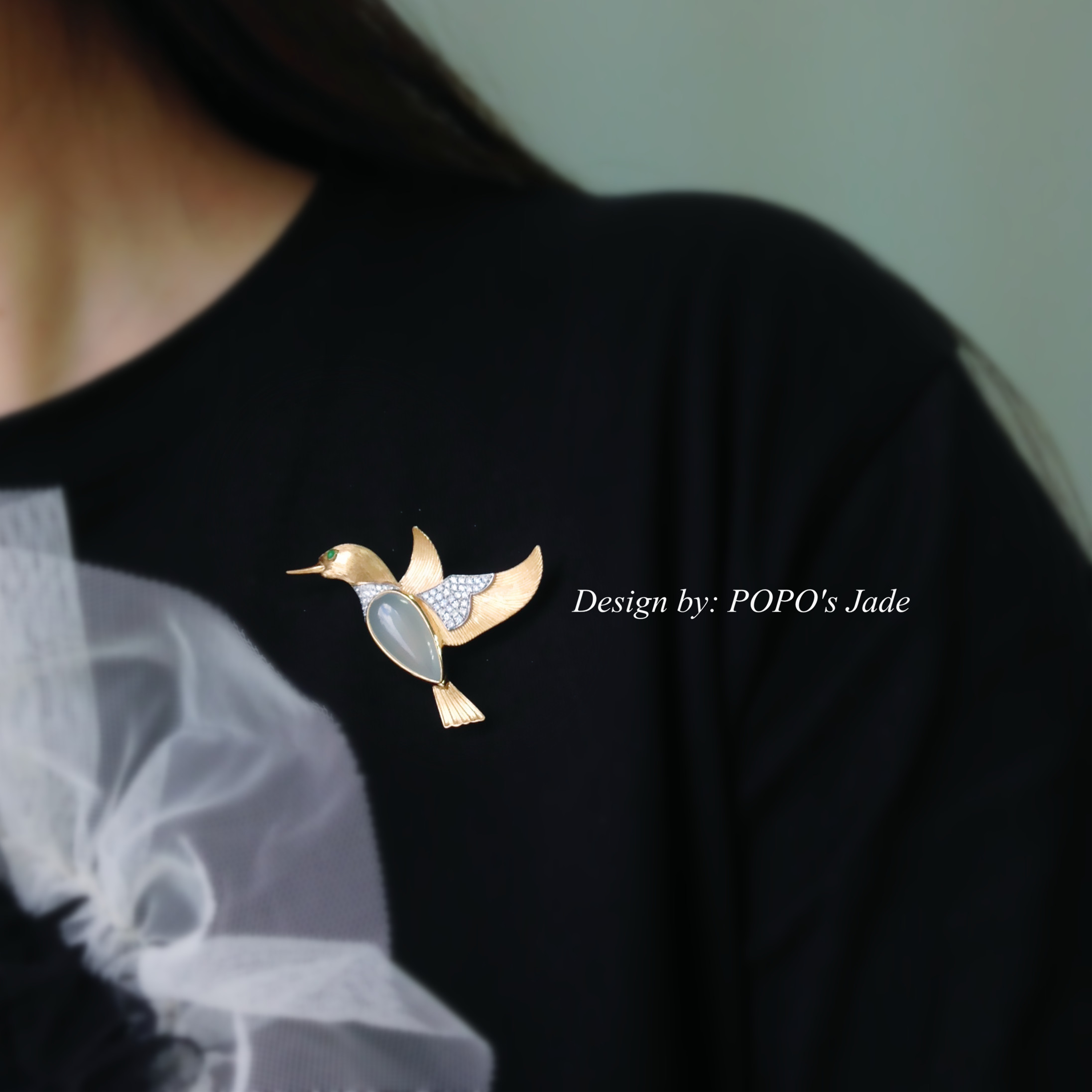 18K黄金翡翠冰种水滴蜂鸟造型胸针吊坠