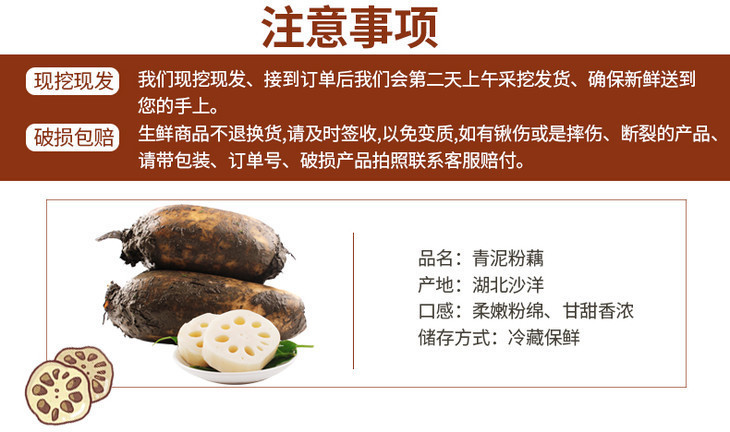 | 品名:湖北洪湖粉藕 规格1:3斤装(约3~5节;以重量为准) 规格2:5斤装(约4~6节;以重量为准);拍几份发几个包裹,不一定能同时到达,请耐心等待 发货地/产地:湖北洪湖 包装方式:箱装 物流信息:默认中通/邮政快递,不支持指定快递 发货区域:新疆、西藏、内蒙、甘肃、宁夏、青海、海南、东3省不发; 物流详情:周六、周日及节假日除外,正常48小时内发货,到货时间约为2~5天,请耐心等待 售后说明:收到货后有质量问题,在24小时内都可以拍照(坏品+快递单面箱子一起拍)上传,申请按坏品比例理赔或联系客服;生鲜食品性质特殊,不支持7天无理由退换货;饼干部分小碎,个人口味等不是售后标准,请理解; |