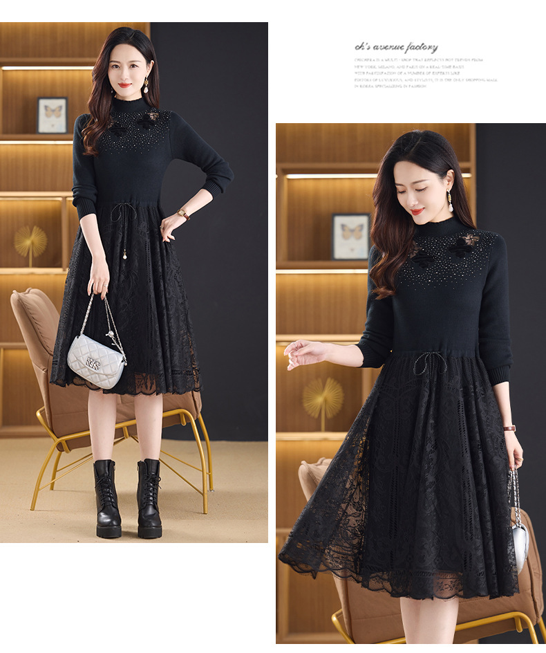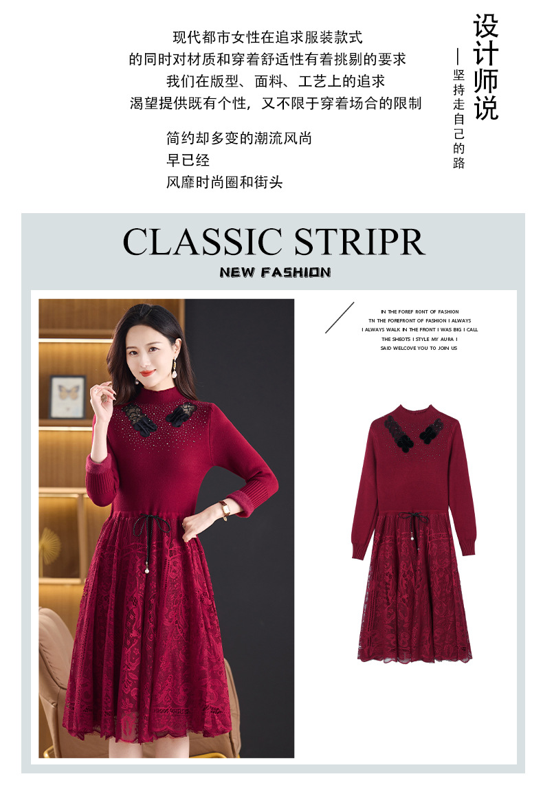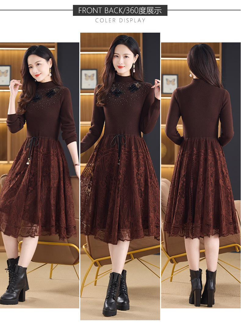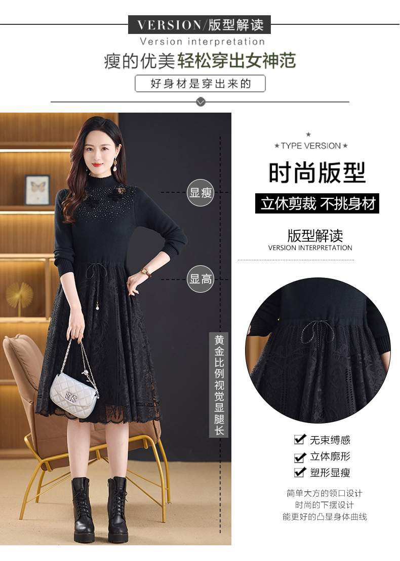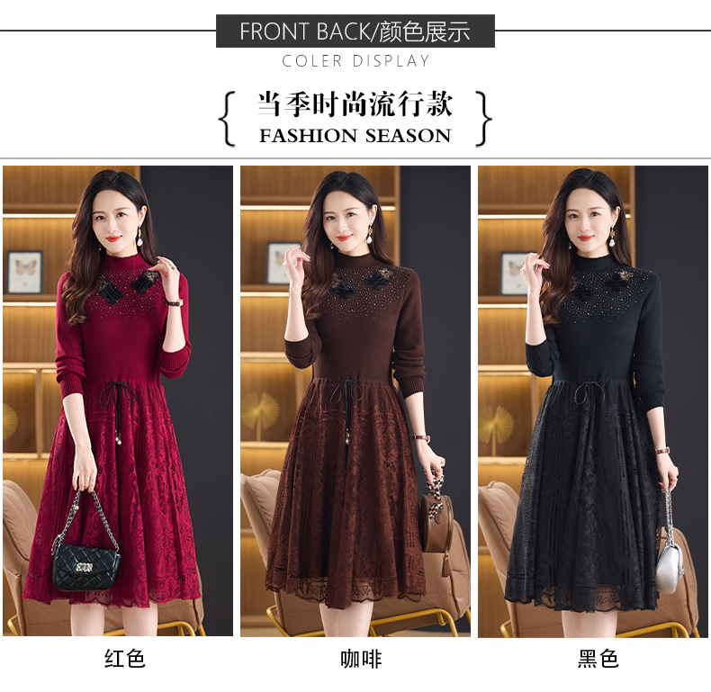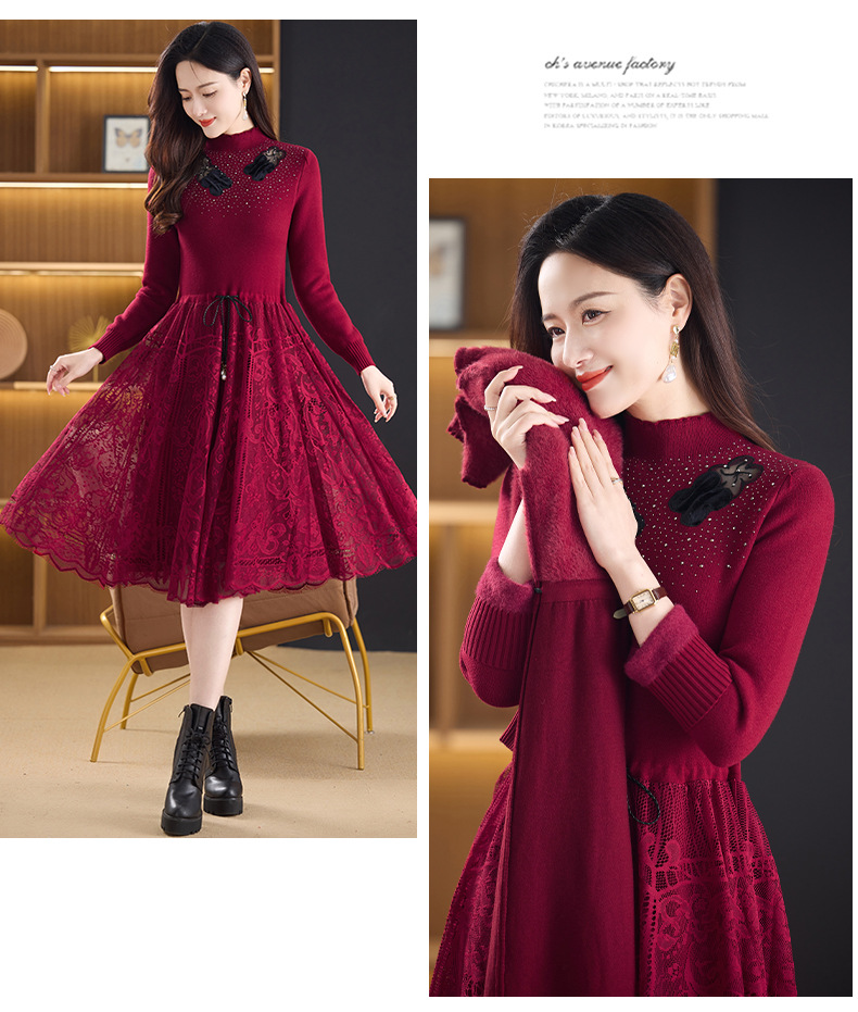 加绒保暖针织连衣裙,洋气内搭蕾丝打底毛衣裙CC576