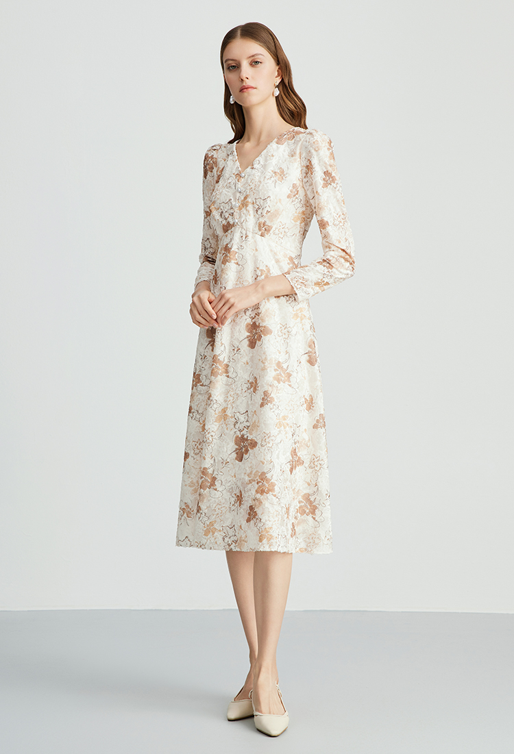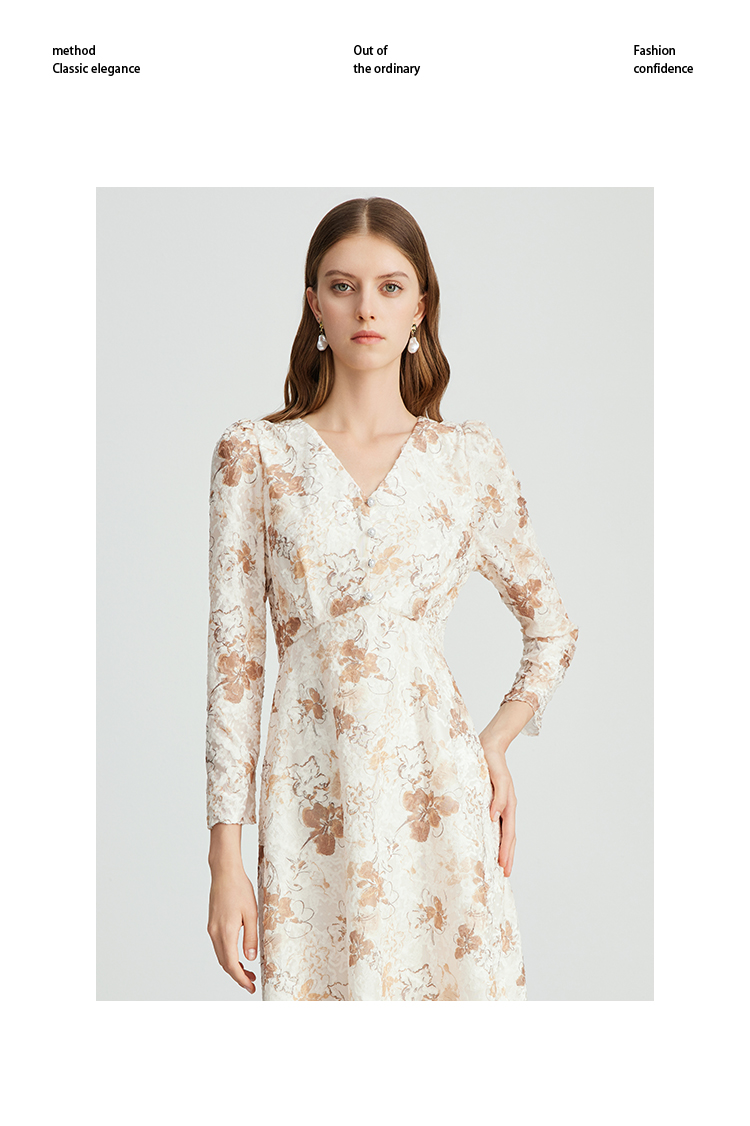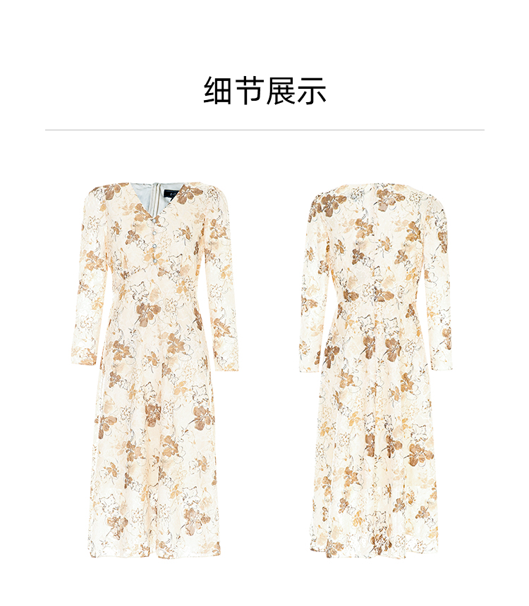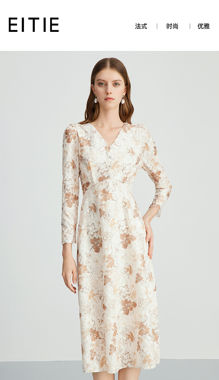 EITIE爱特爱法式复古秋日氛围感印花肌理感V领连衣裙秋季新款C2407426