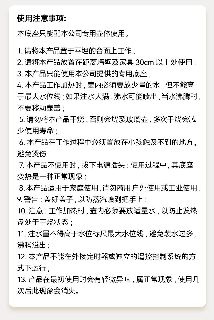 1.非人为导致的质量问题,壶盖、壶体质保3个月,底座质保1年
