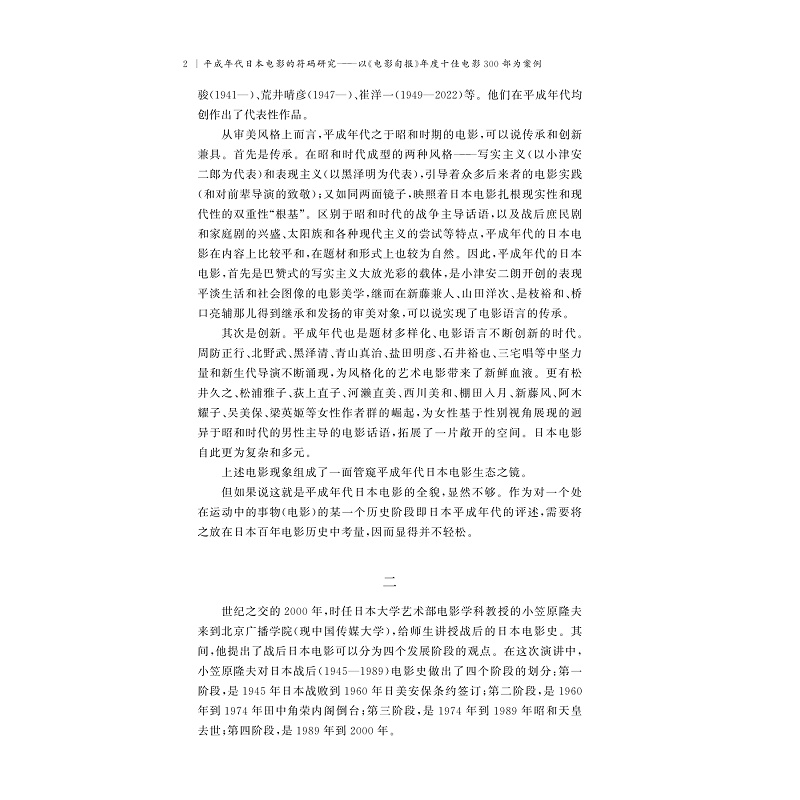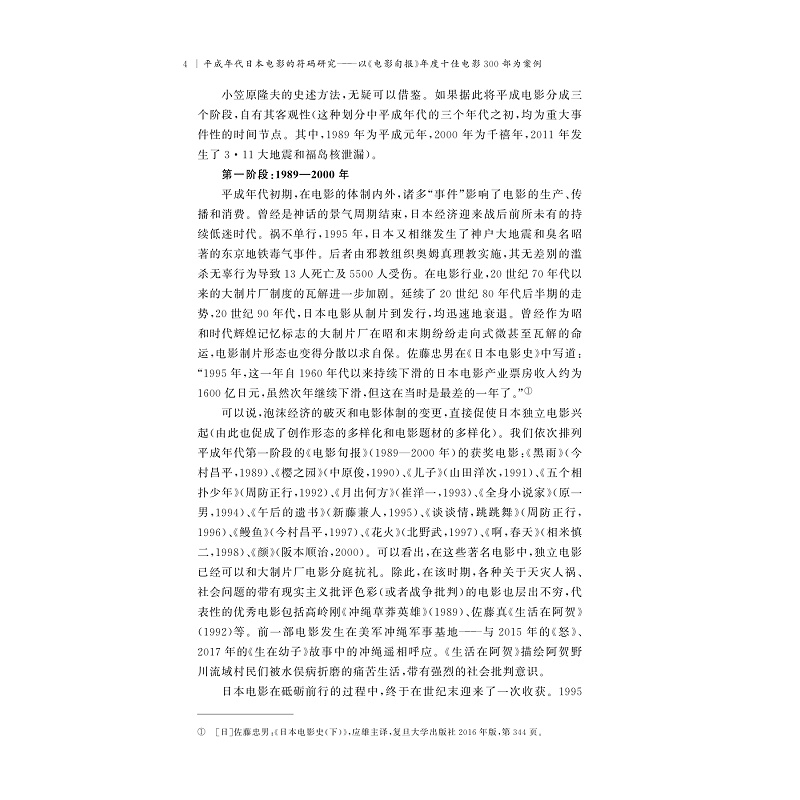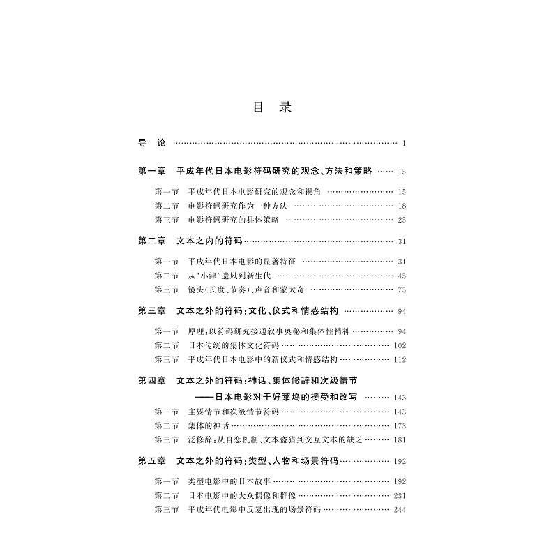 本书为中国社会科学基金后期资助项目成果。本书采用符号学家帕特里斯·帕维斯(Patrice Pavis)、乌伯托·艾柯的研究成果,用“史论类型符码”关联法,探究日本平成年代电影的意义生产范式,揭示其电影内部的情节、风格符码和集体文化之间的多元关系。理论方法包括:电影史论和类型理论结合、符码三分法(以乌伯托·艾柯为代表)、史论、类型理论和符码理论的混合(原创性的学术尝试)。具体分为七个章节(包括《平成年代日本电影符码研究缘起、对象和方法》、《文本之内的符码》《文本之外的符码(1):文化、神话和情节》、《文本之外的符码(2):神话、集体修辞和次级情节》《文本之外的符码(3):类型、人物和场景符码》等)。