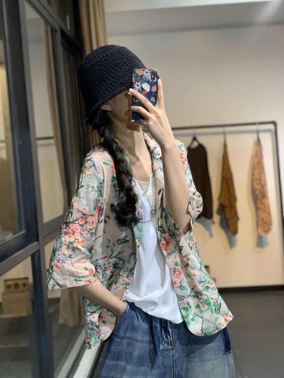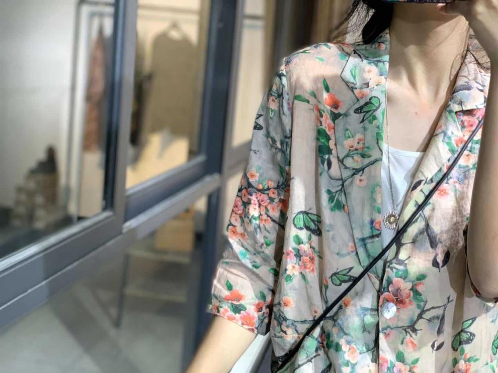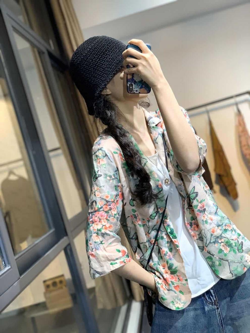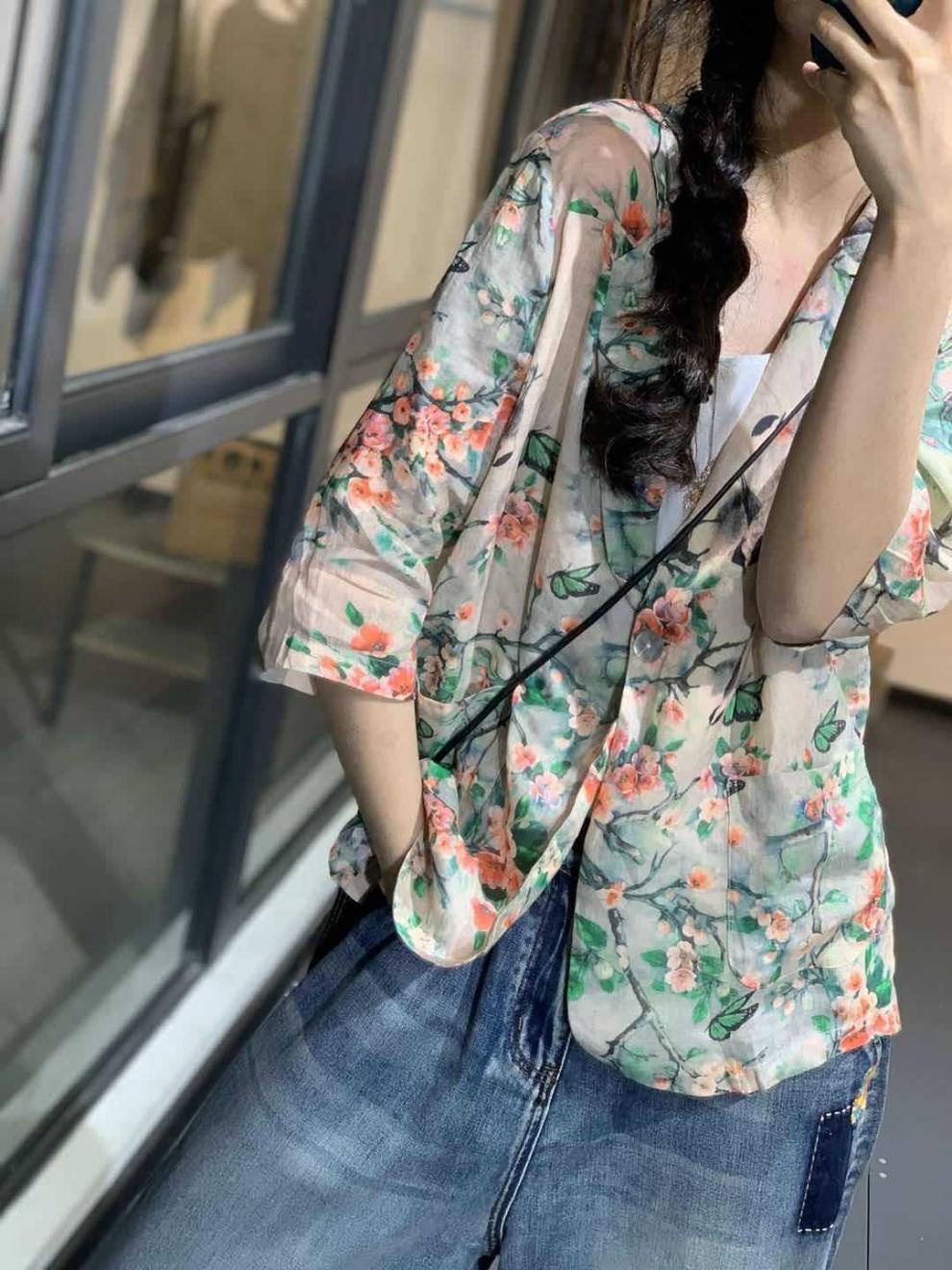雀说新款宽松显瘦苎麻印花西装领一粒扣小西服外套上衣AL1356