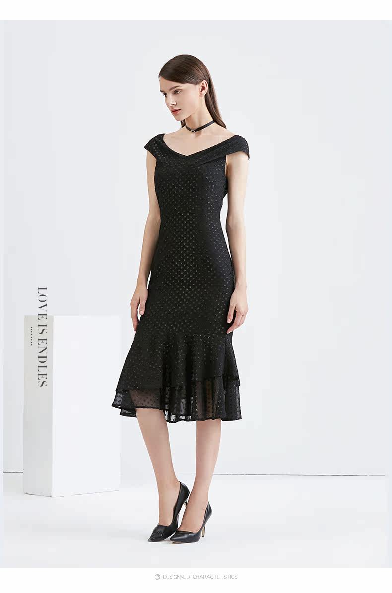 EITIE爱特爱女装早秋新款性感包袖一字领包臀钉珠鱼尾礼服裙5677305