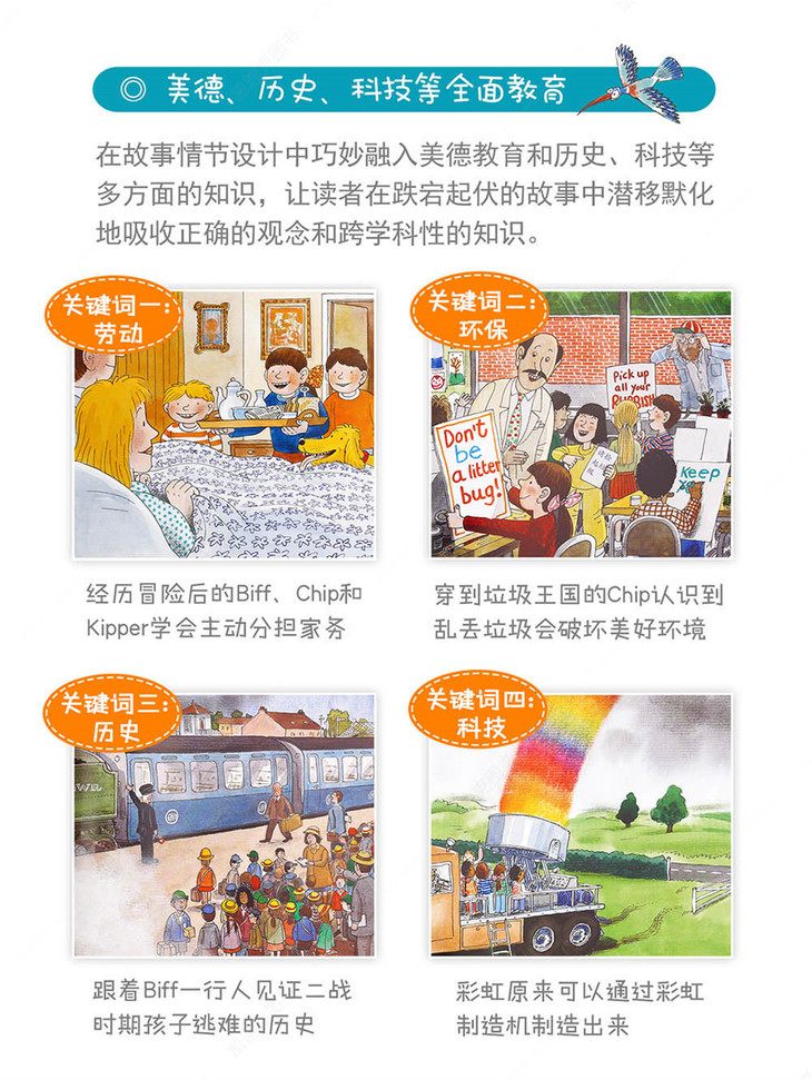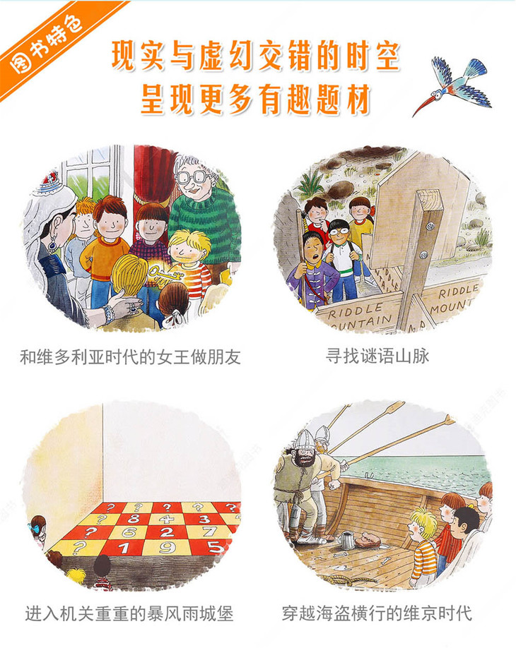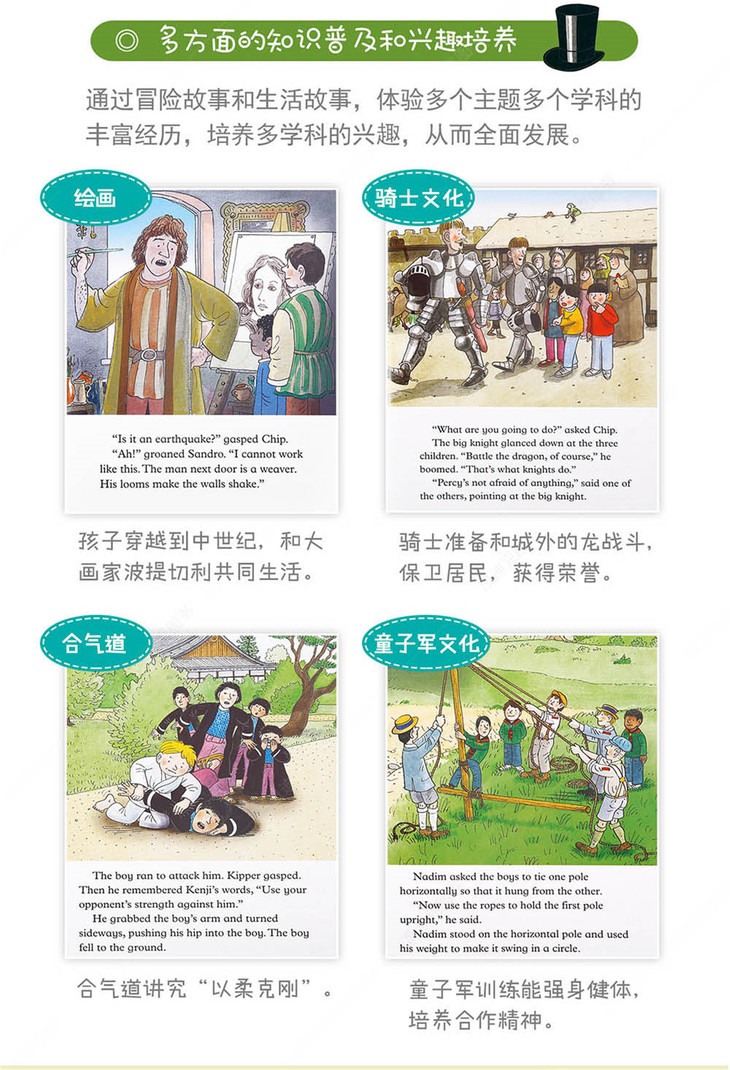 一个个生动的冒险故事中,国外的生活、习俗在故事充分展现,让孩子深入到英语国家普通人的生活中,体味地道的文化和思维,同时接触跨学科的知识。