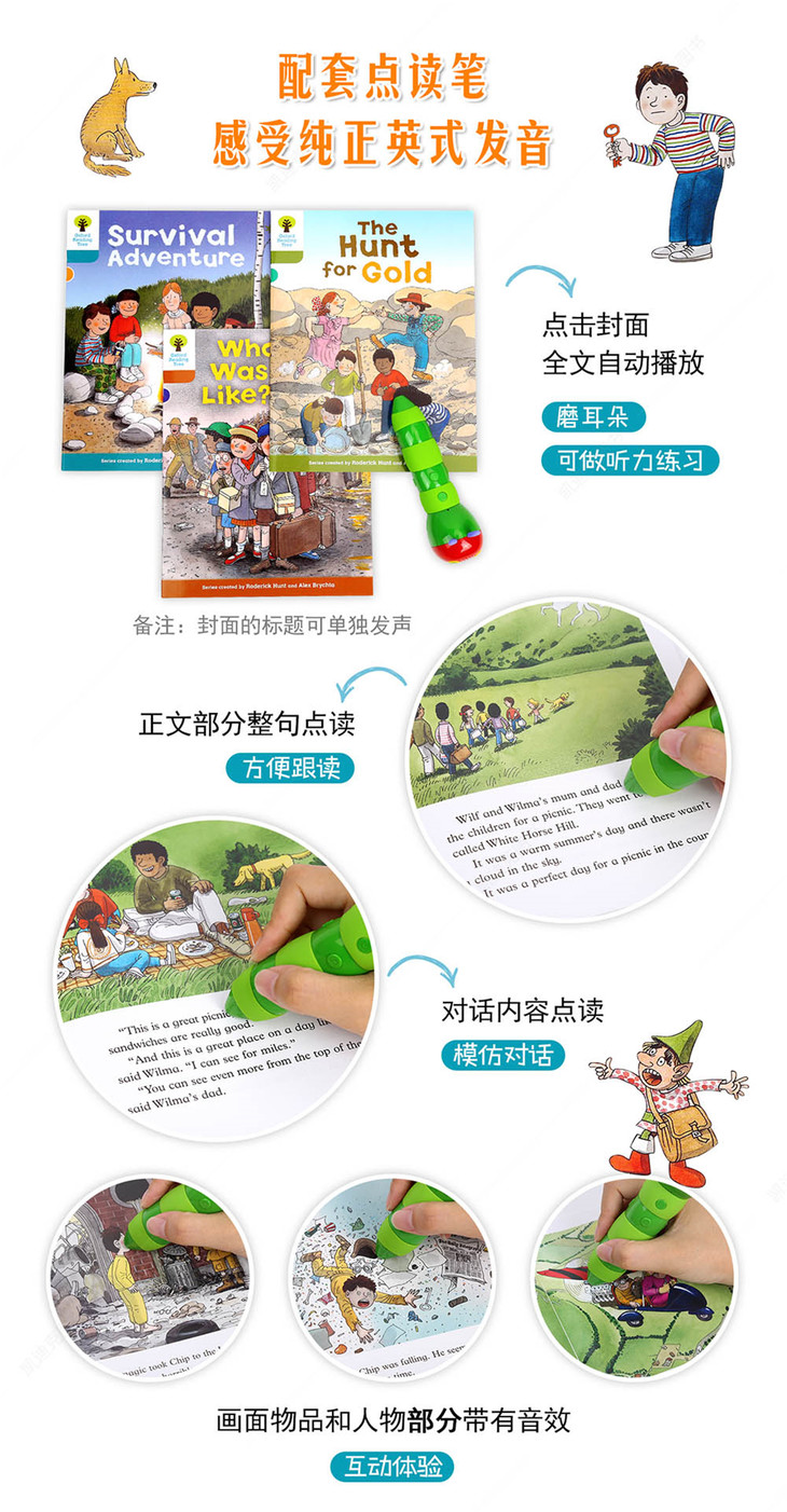事实上,“牛津树”是英国孩子在学校里会用到的阅读教材,体系非常庞大。好消息是,今年牛津出版社将牛津树全系列引进了国内,并且考虑到我们孩子学英语的实际需求,专门配备了点读功能,适配的就是之前介绍过的“毛毛虫点读笔”。