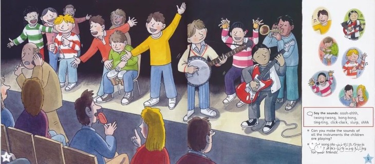 这是正式学习“认字”之前的预备级,整套书是无字书,以生活中常见的声音为主,学习大约70个不同动作和音效的拟声词,比如各种乐器的声音...