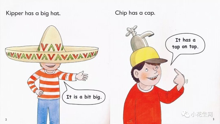 还会学一些用这些字母拼写的单词,比如在 Hats 这本书中,就有 hat、cap、tap、top、bit、big等等。