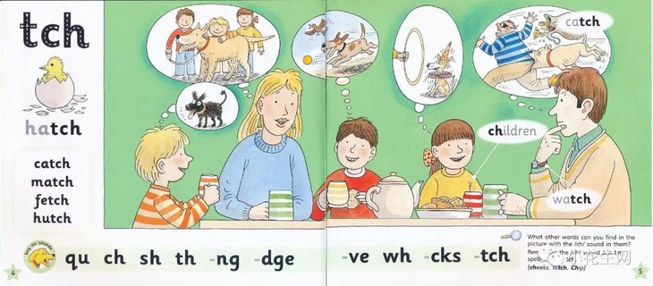 单词也更长了,一般是4个或5个字母组成的单词,比如和 tch 相关的catch, watch, fetch, hutch。