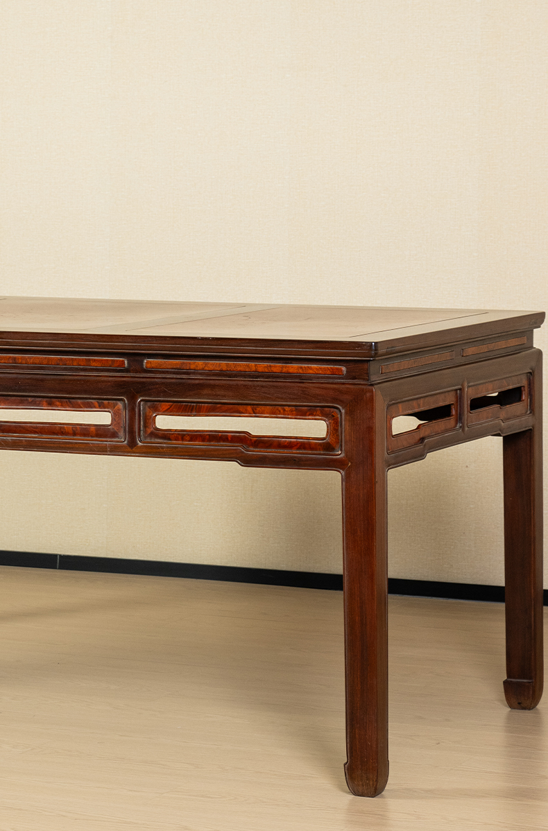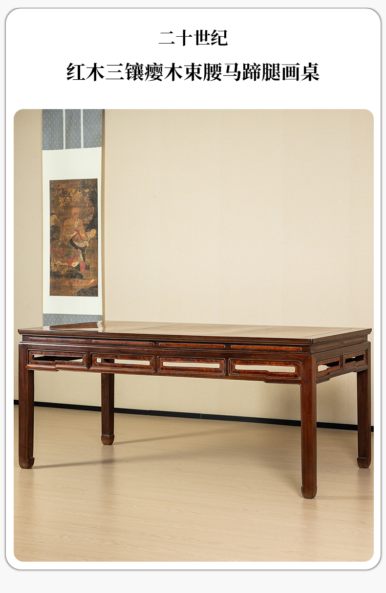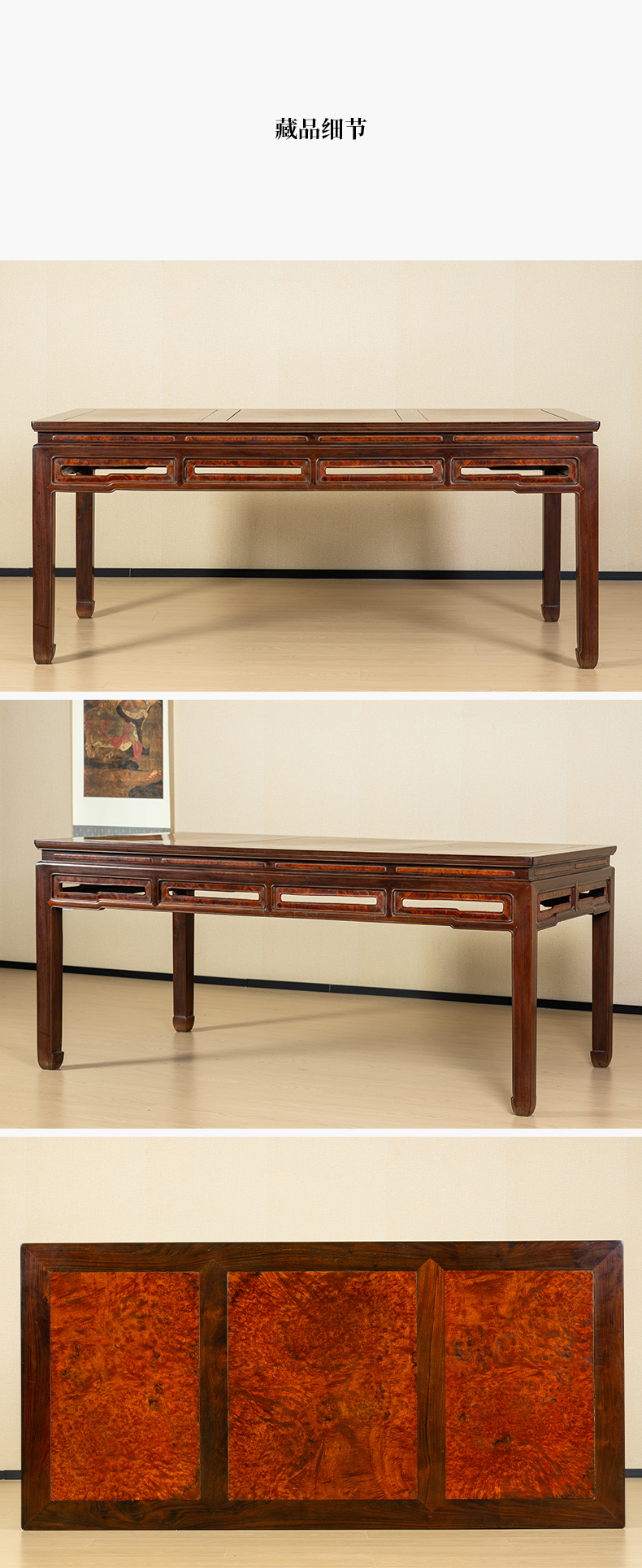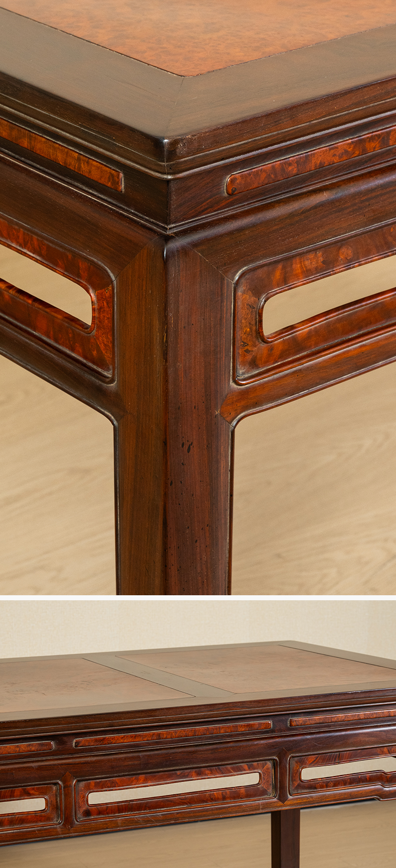 二十世纪 红木三镶瘿木束腰马蹄腿画桌