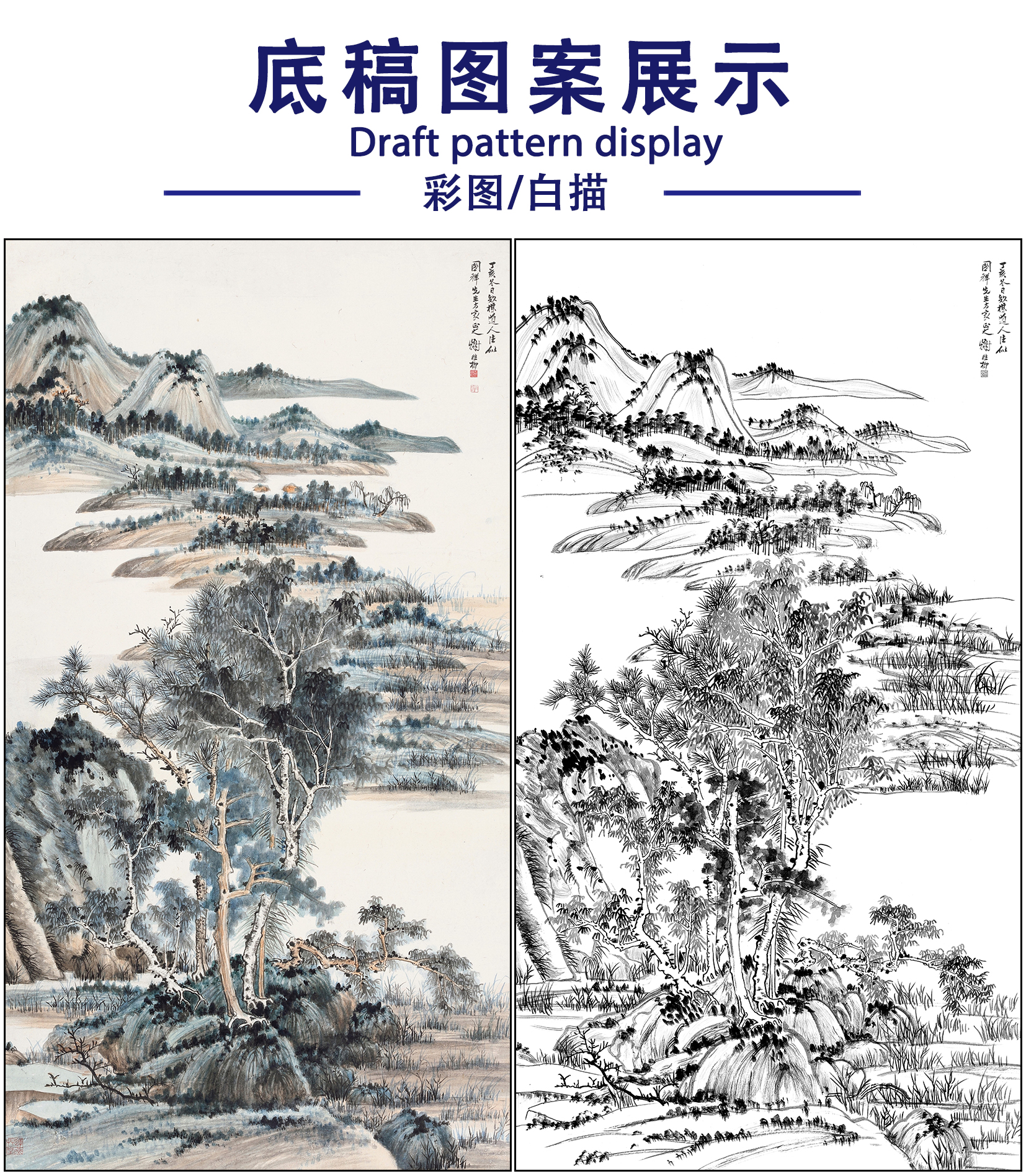 谢稚柳山水工笔画白描底稿《江邨消夏》临摹勾线高清打印稿XZ40