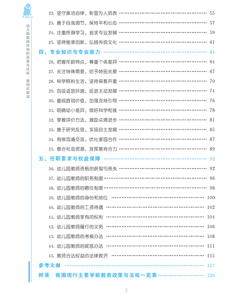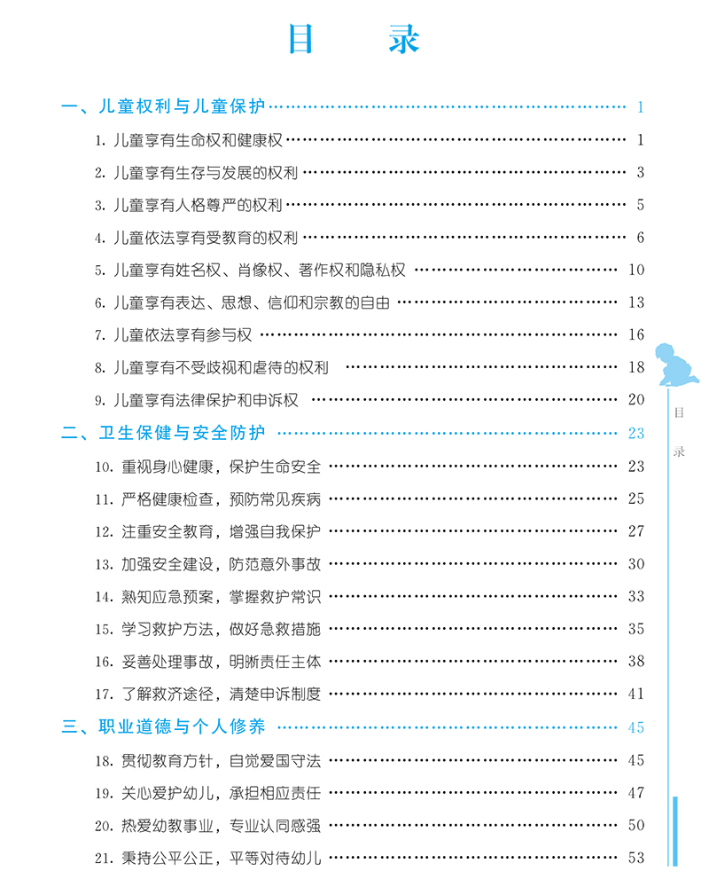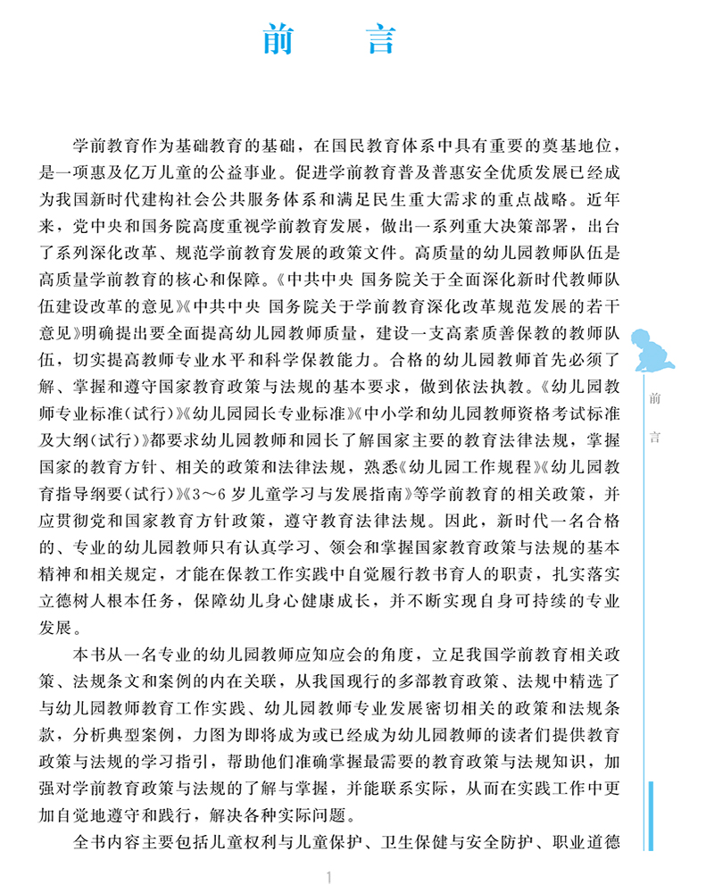 本书从幼儿园教师应知应会的角度出发,从我国现行的诸多教育政策与法规中梳理和精选与幼儿园教育工作实践、教师专业发展密切相关的政策与法规条款,进行阐述和解读,力图为幼儿园教师提供教育政策与法规的学习指引,帮助他们增强对学前教育政策与法规的了解和掌握,在实践工作中更加自觉地遵守和践行,解决各种实际问题。全书内容主要涉及儿童权利与儿童保护、卫生保健与安全防护、职业道德与个人修养、专业知识与专业能力、任职要求与权益保障五方面共45条。为了增强政策法规条文的可读性,使相对枯燥的政策条文变得通俗易懂,使读者不仅能够正确认识必知的相关政策与法规条文的含义,而且能够较好地理解掌握,并在实践中自觉遵守和践行,本书在编写过程中,每一条文的写作均包括三个模块:(1)条文解读——对该条文本身的含义进行解读,摘选列出我国现行相关政策、法规中对该条文的具体规定,帮助老师们了解必知的规范,并指出教师理解和遵守该条文的意义与必要性。(2)案例回放——有针对性地选择幼儿园教师日常工作中与该条文密切相关的典型案例,帮助老师们理解条文在实践中的具体应用和可能出现的各种做法。(3)案例分析——对案例中的情况进行具体的点评,提炼出简洁、明确的建议,力图帮助老师更好地理解条文践行中应特别注意的问题,加强依法执教的意识,了解预防和应对具体问题的策略。