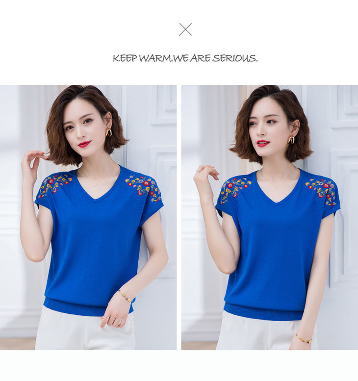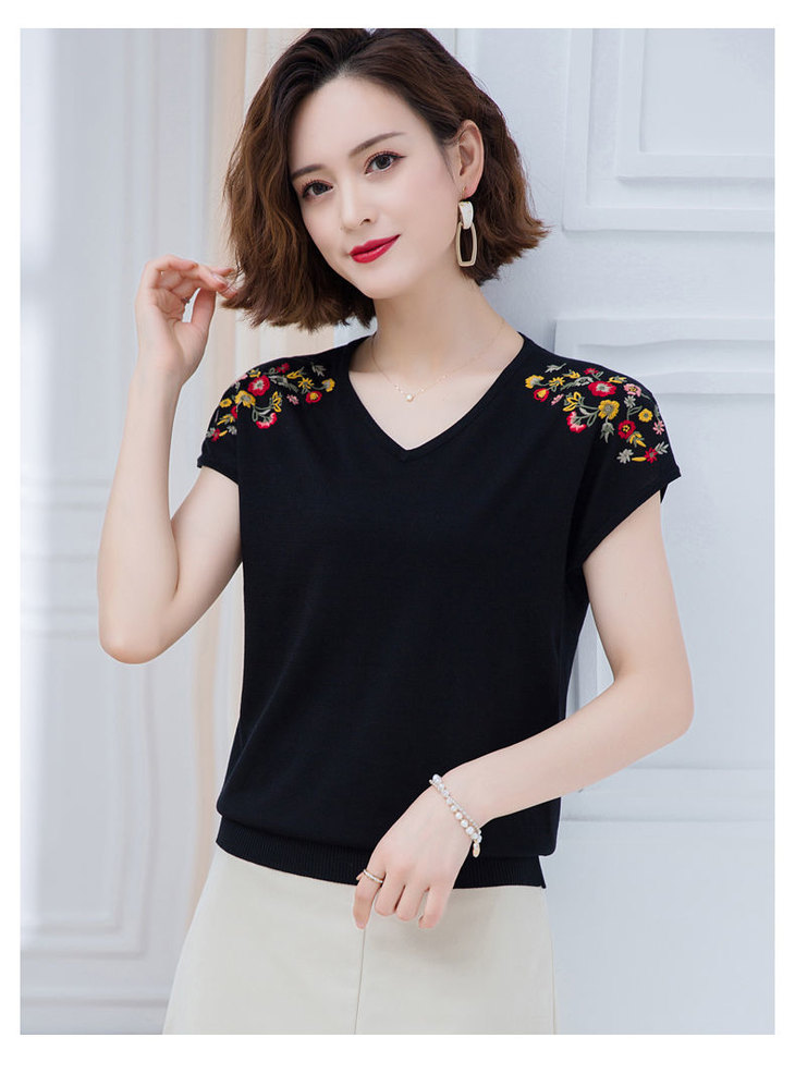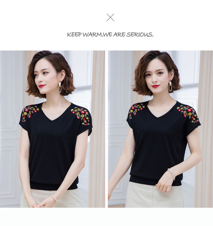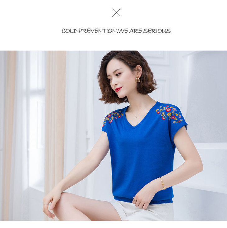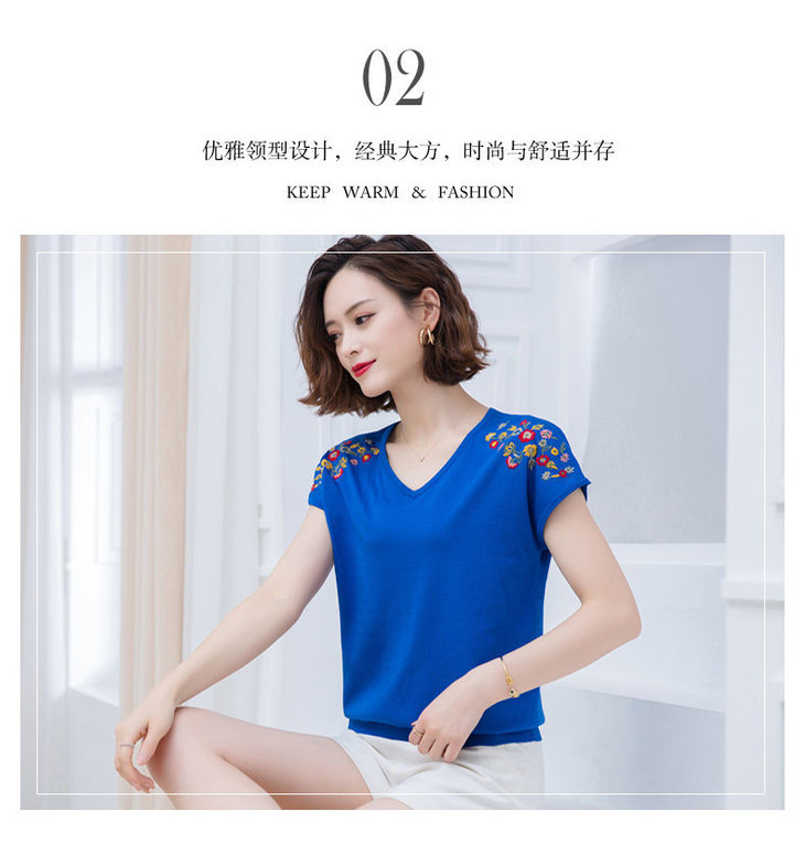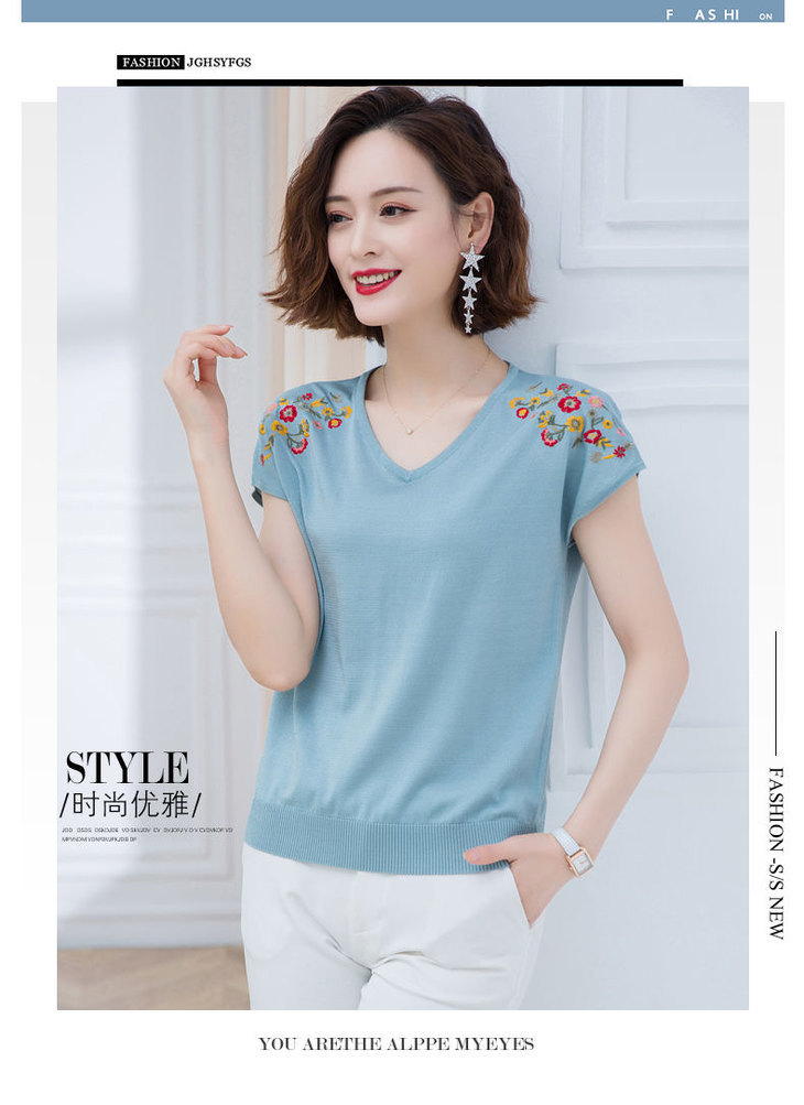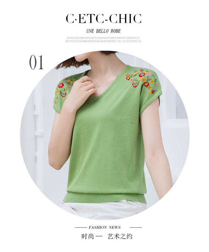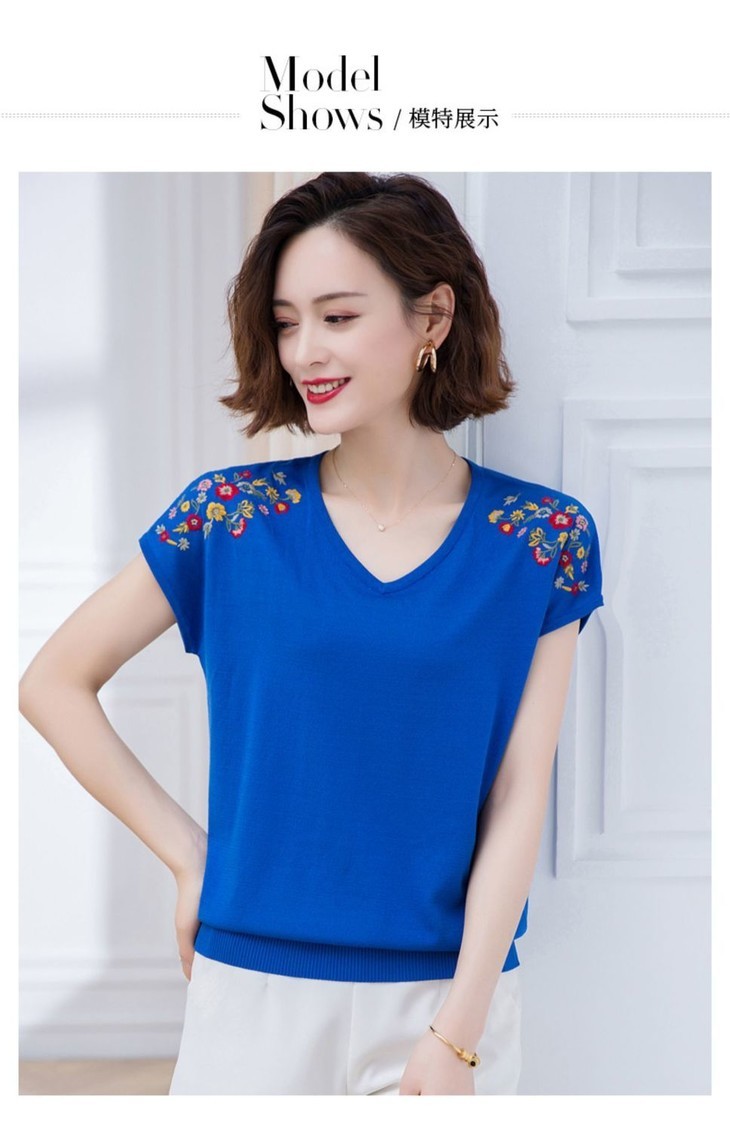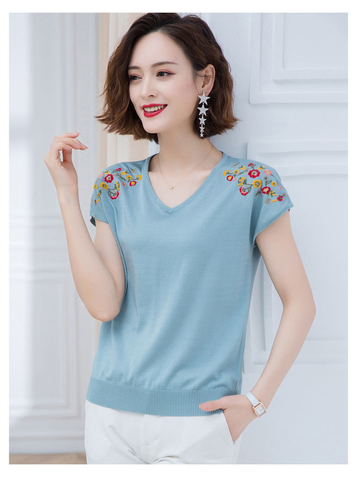 JXG-2021夏季新款妈妈t恤女夏短袖宽松冰丝小衫洋气刺绣V领上衣蝙蝠衫