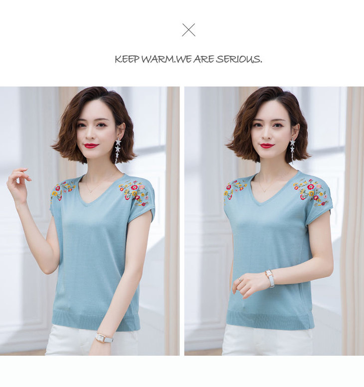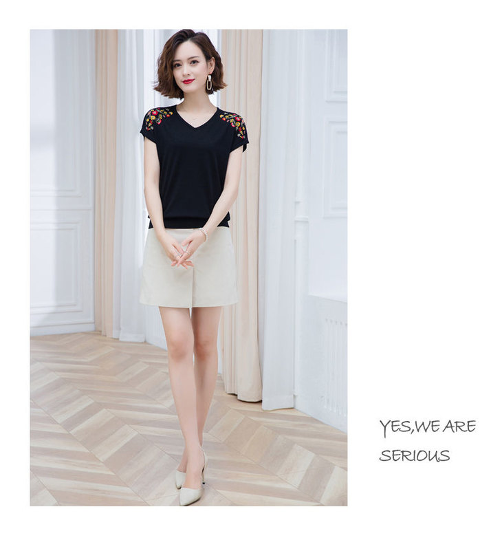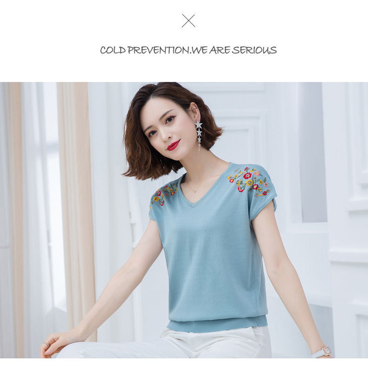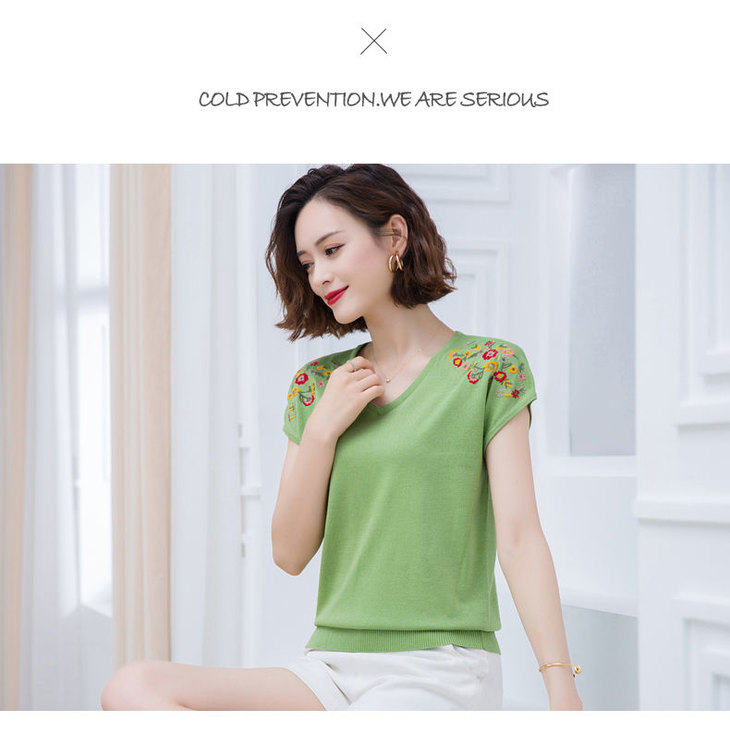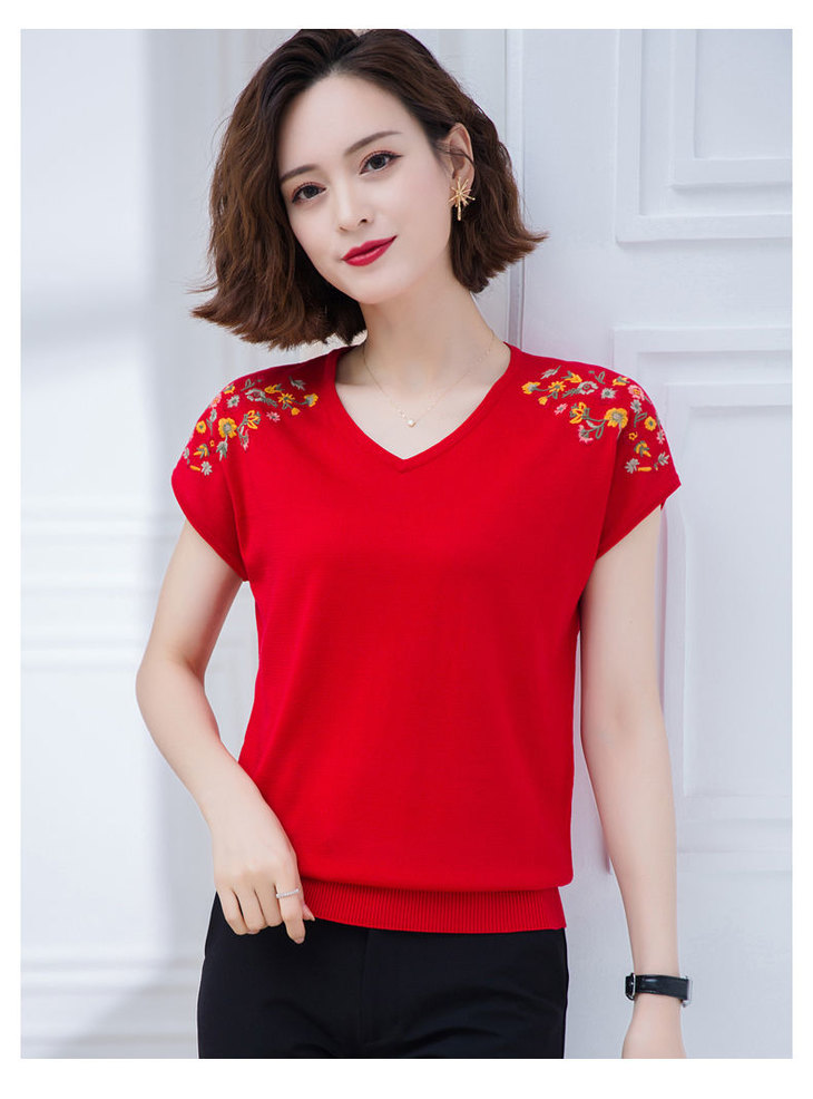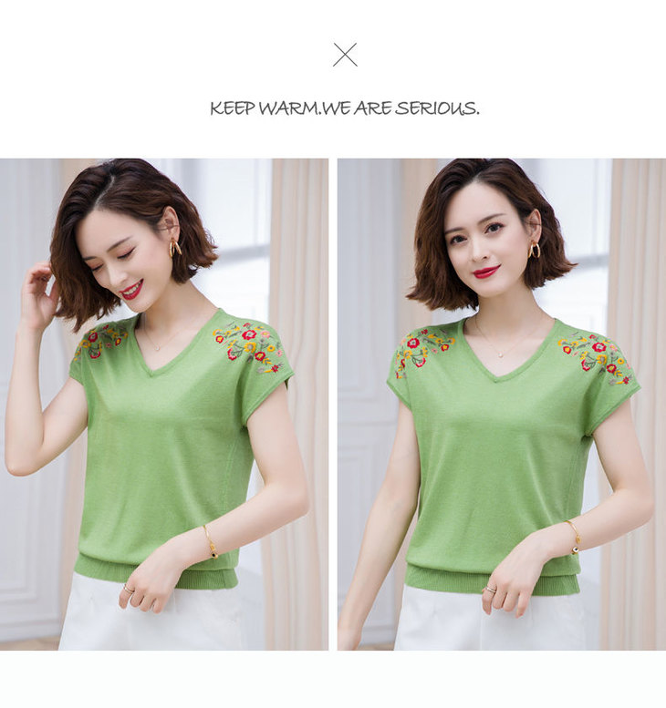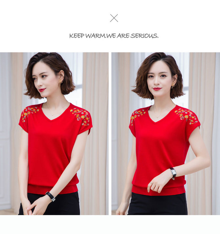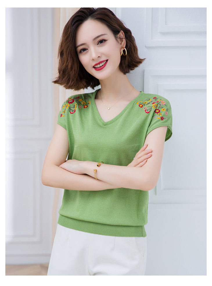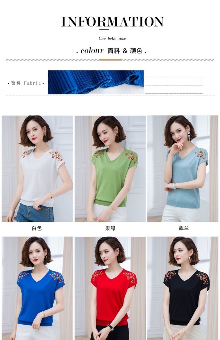 JXG-2021夏季新款妈妈t恤女夏短袖宽松冰丝小衫洋气刺绣V领上衣蝙蝠衫
