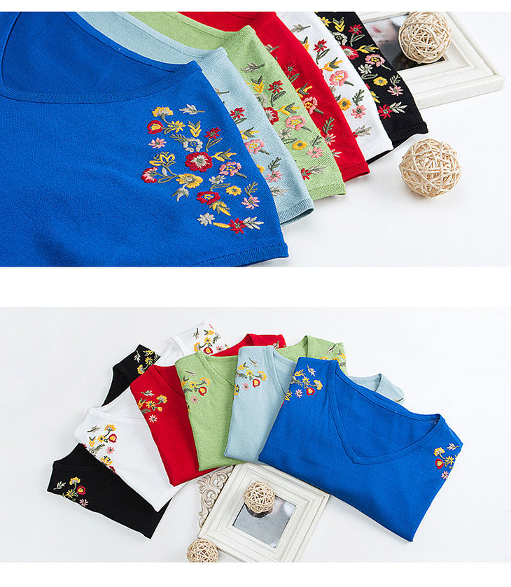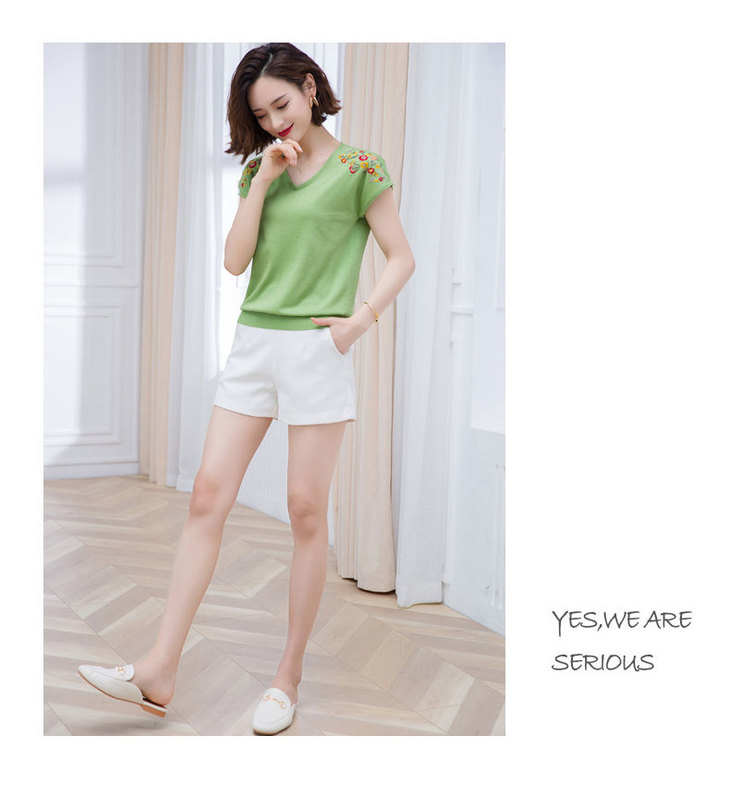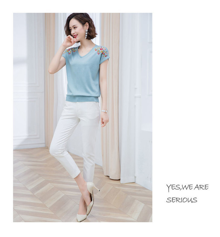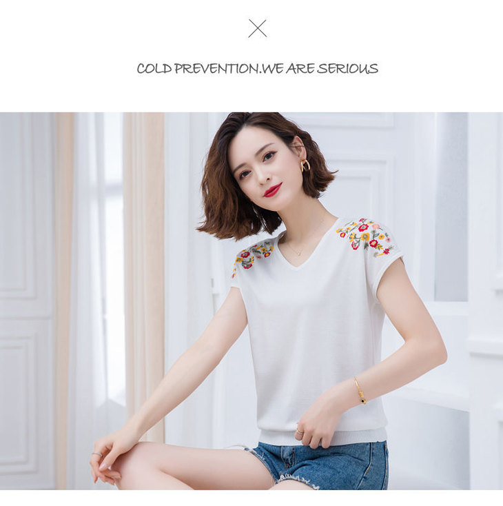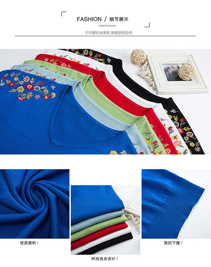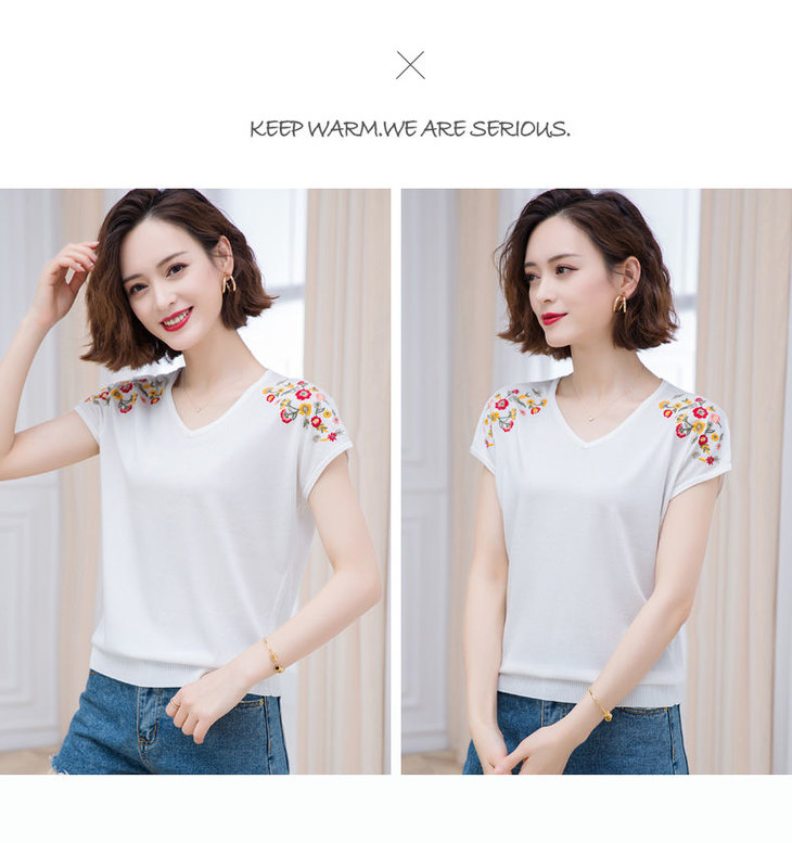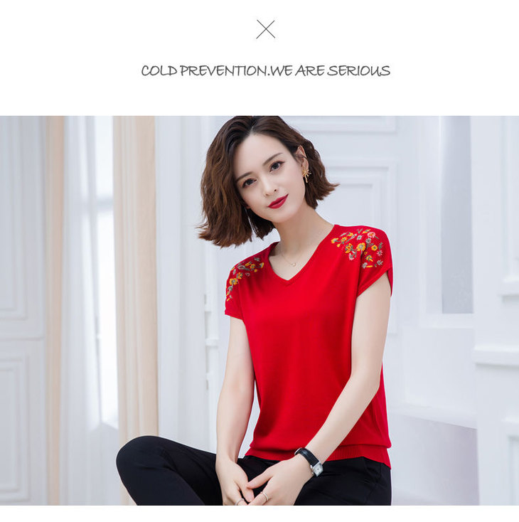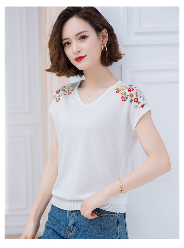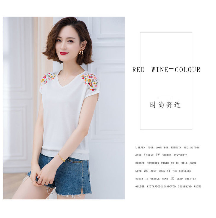 JXG-2021夏季新款妈妈t恤女夏短袖宽松冰丝小衫洋气刺绣V领上衣蝙蝠衫