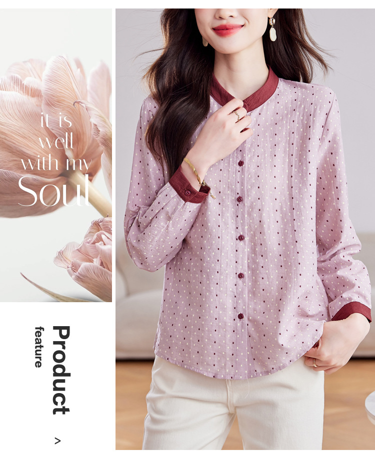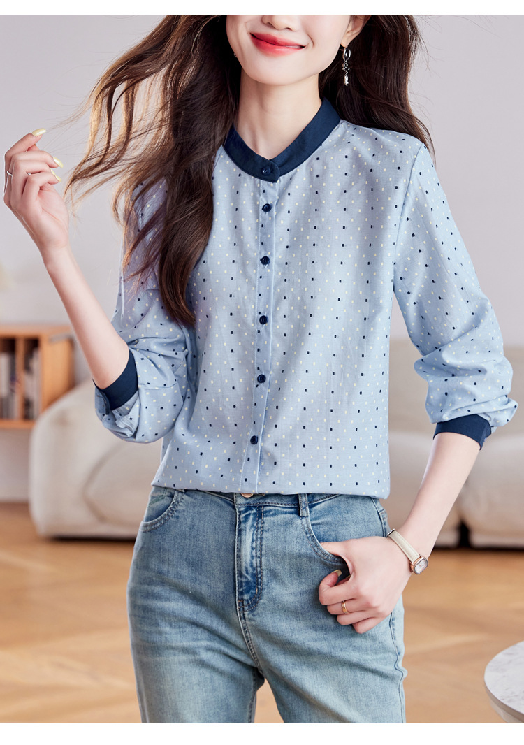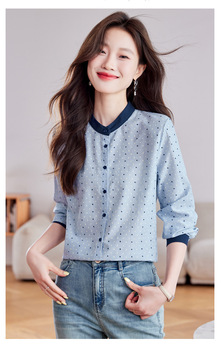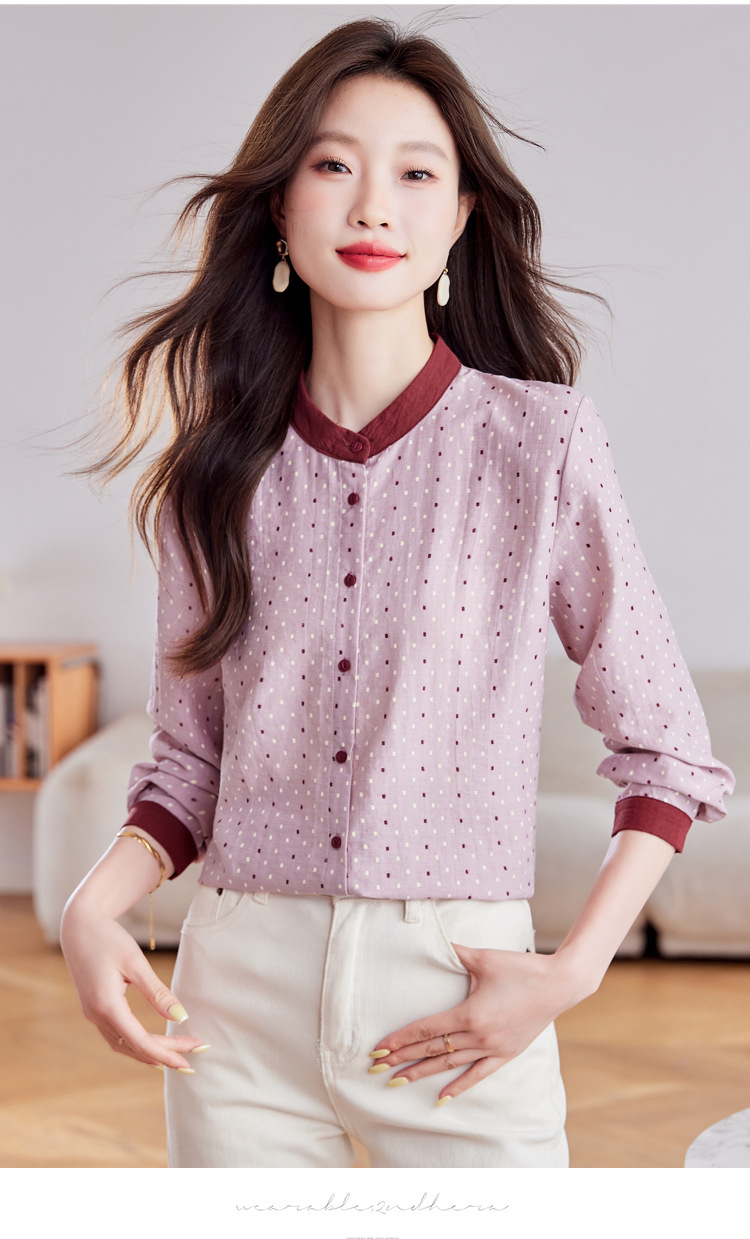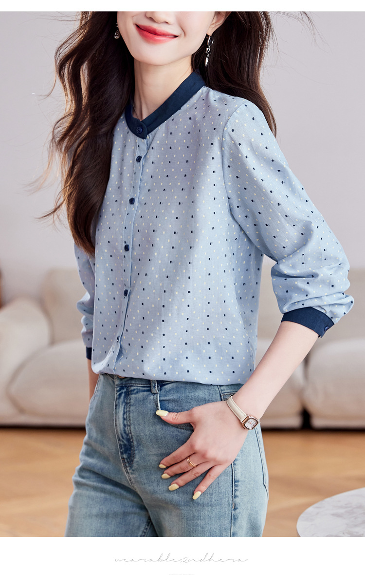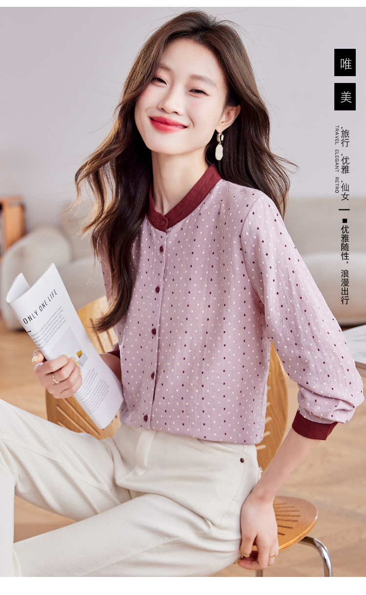 雀说设计感拼色圆点长袖衬衫女减龄百搭亚麻平纹上衣AL9806