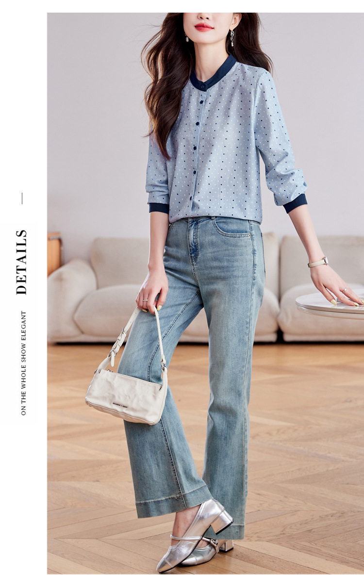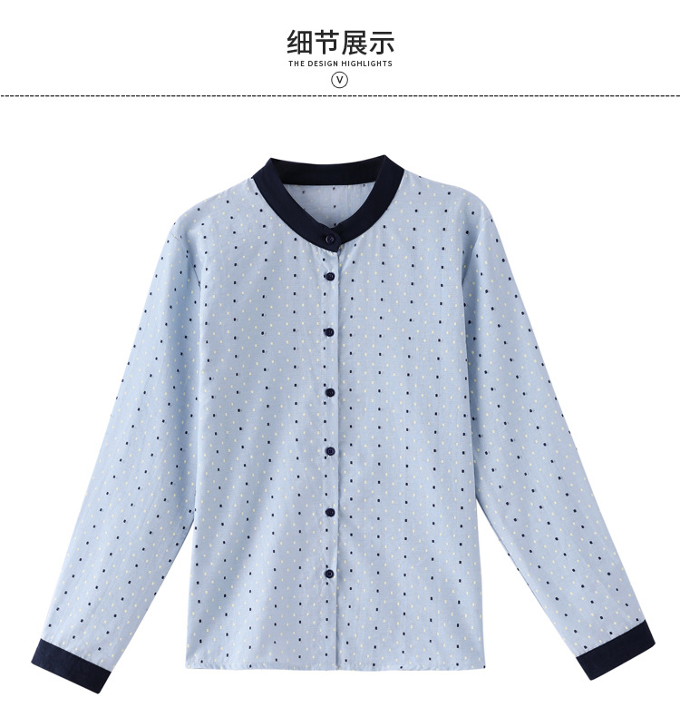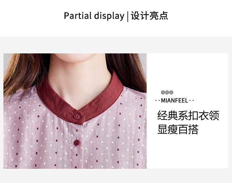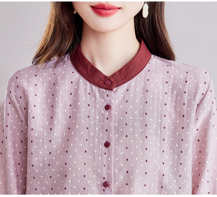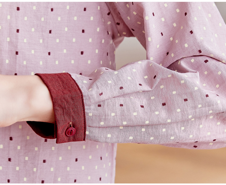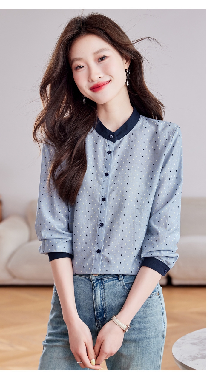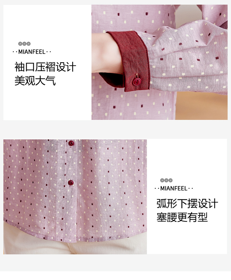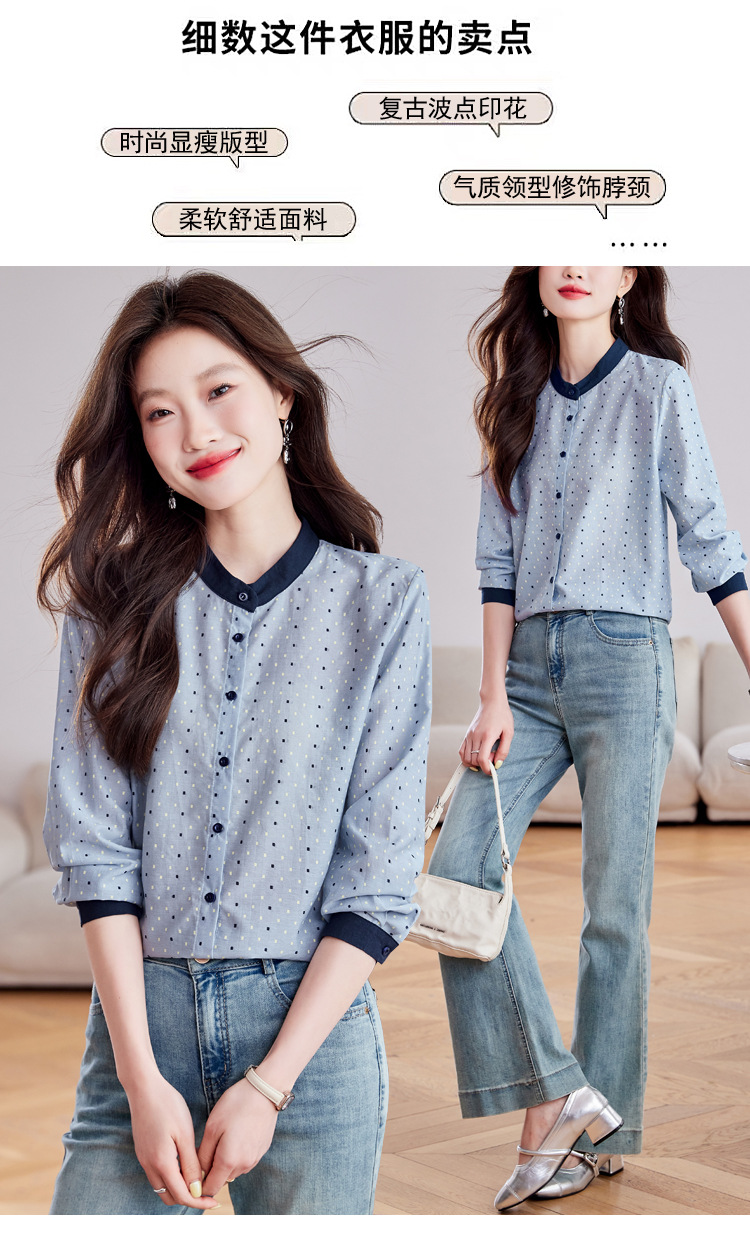 雀说设计感拼色圆点长袖衬衫女减龄百搭亚麻平纹上衣AL9806