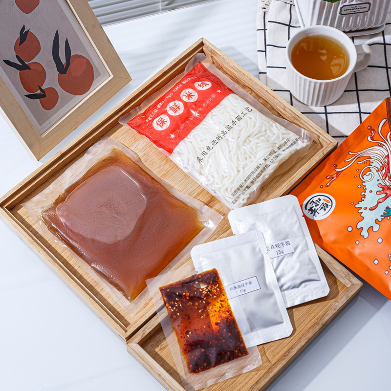 鲜米线包260克*1、松茸牦牛酱15克*1、鸡枞油浸平菇(原味)15克*1、油辣椒包10克*1、米线汁液态调味料200克*1