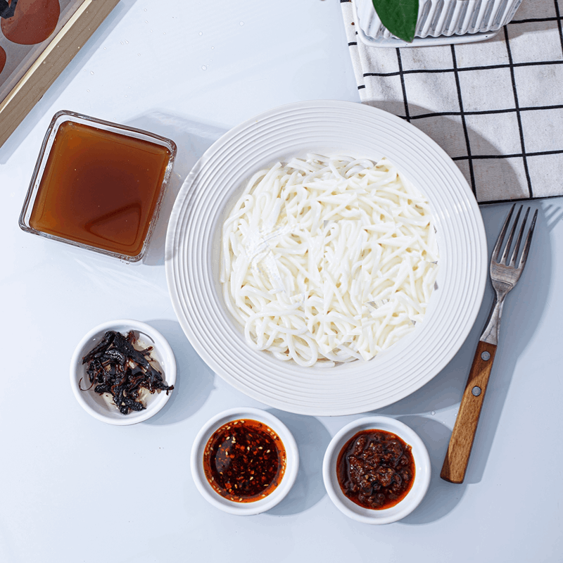 一袋凉拌米线一斤重,为的是让加量到260克的鲜米线完全浸泡在米线汁里,米线汁同步加量,是的,一定要这样泡着吃才好。
