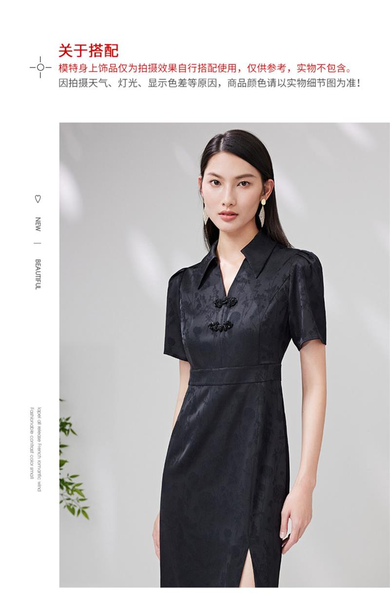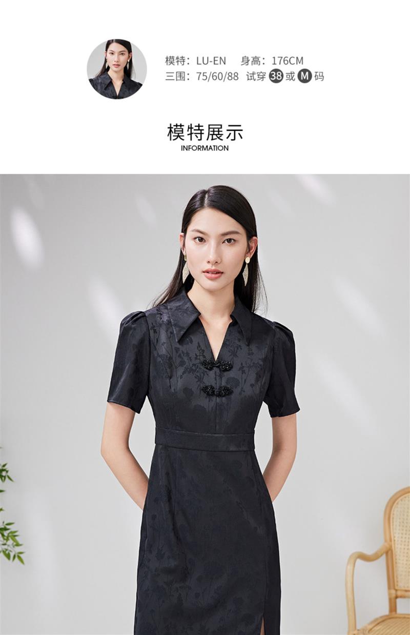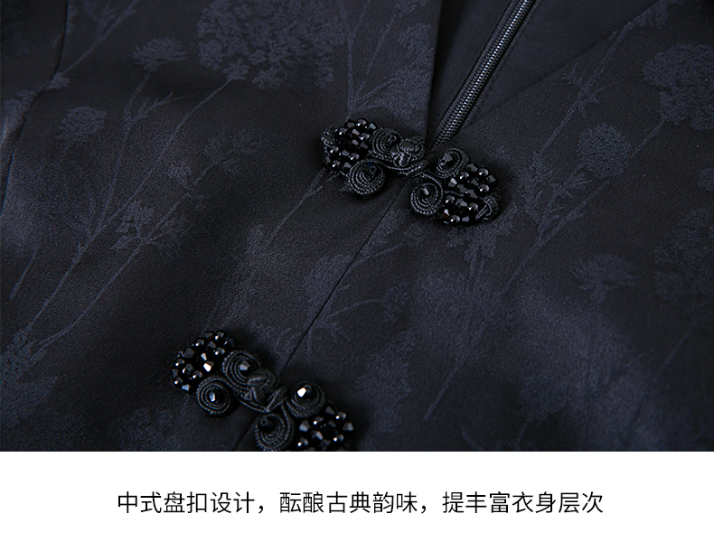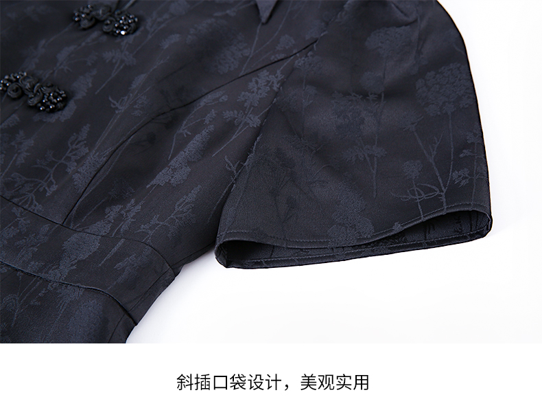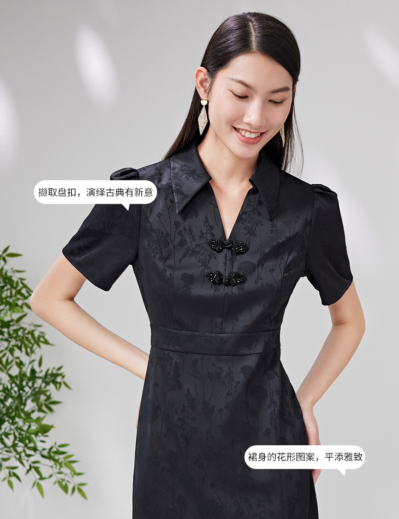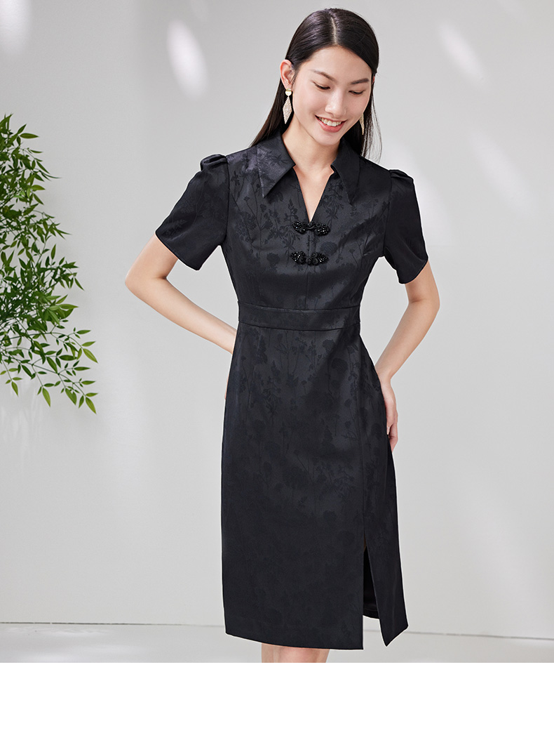 EITIE爱特爱夏新款开叉显瘦时尚中式盘扣暗纹印花黑色连衣裙B2307128