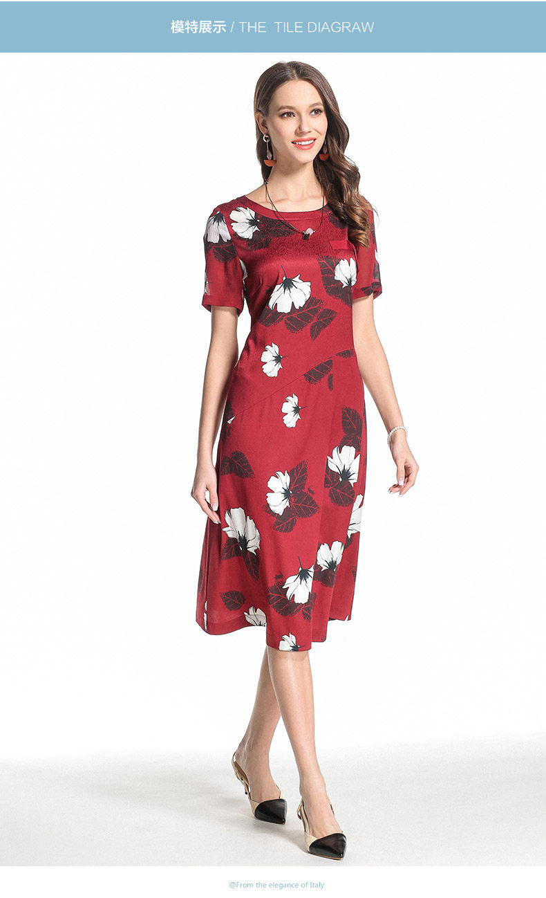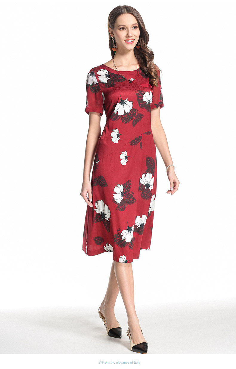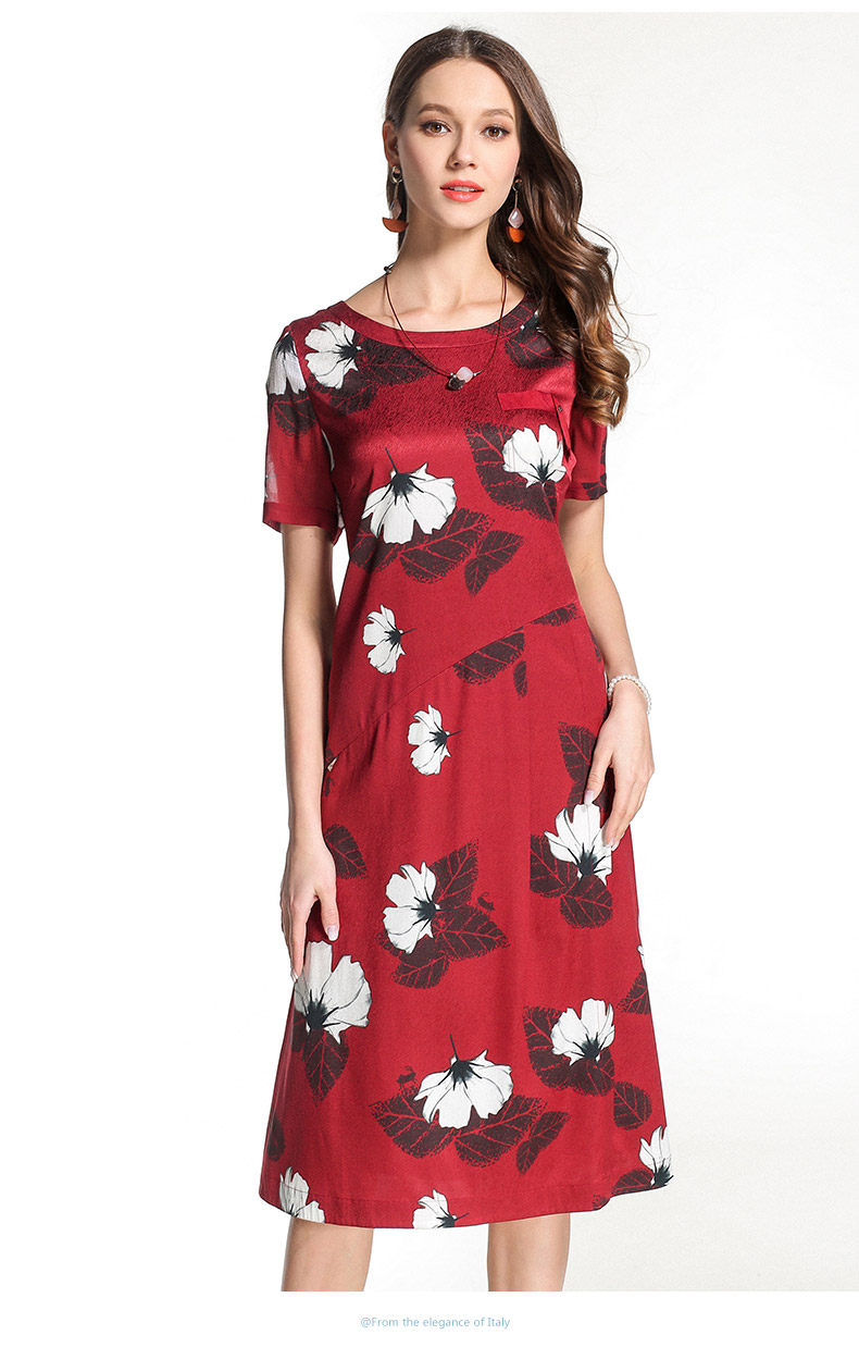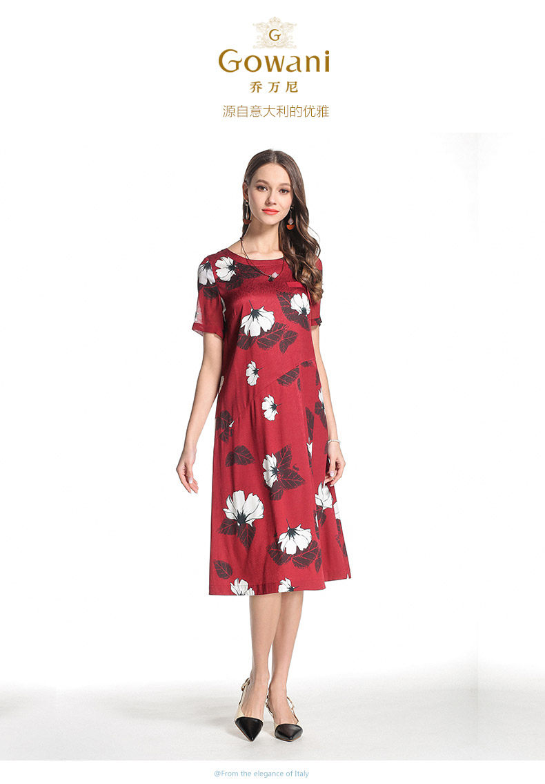 乔万尼夏季桑蚕丝连衣裙红色时尚印花大花真丝宽松a字裙中长EB2E830