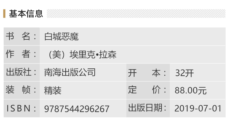 ★《白城恶魔》是一本充满活力的书,融合了历史真相和娱乐元素,让这部非虚构图书有了一部小说的戏剧影响力,它展现的真相远比小说离奇。——《纽约时报》