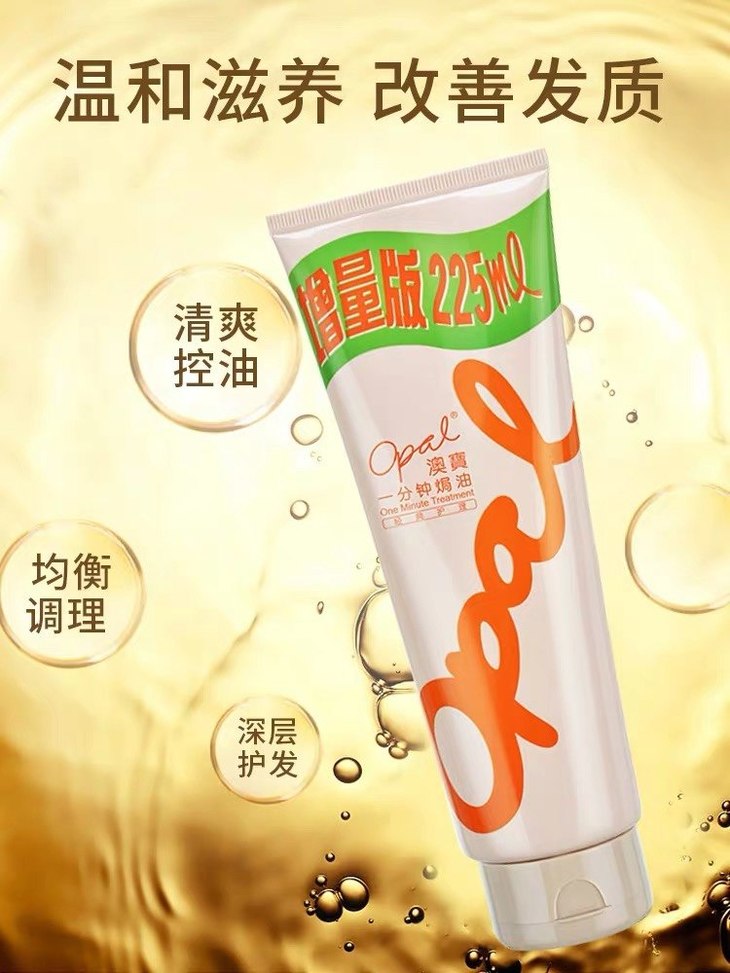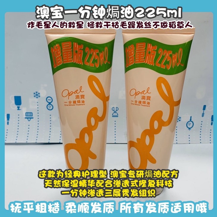澳宝一分钟焗油225ml👍炸毛星人的救星,拯救干枯毛躁发丝不做稻草人🙅!这款为经典护理型,澳宝专研焗油配方👏,天然保湿精华配合渗透式修复科技🕶,一分钟渗透三层秀发组织,补充缺失的营养及水分💦,抚平粗糙,柔顺发质。👉所有发质适用哦,尤其烫染受损发质和干枯毛躁发质。