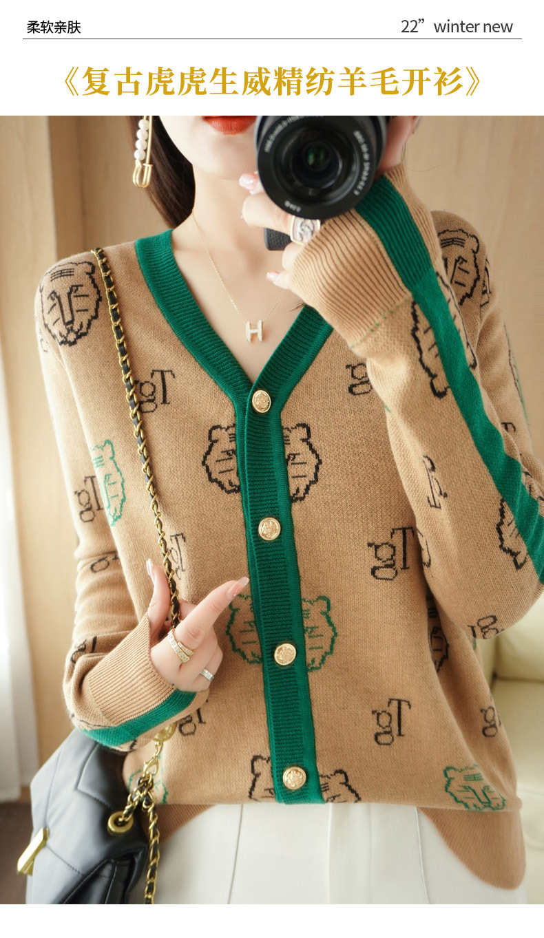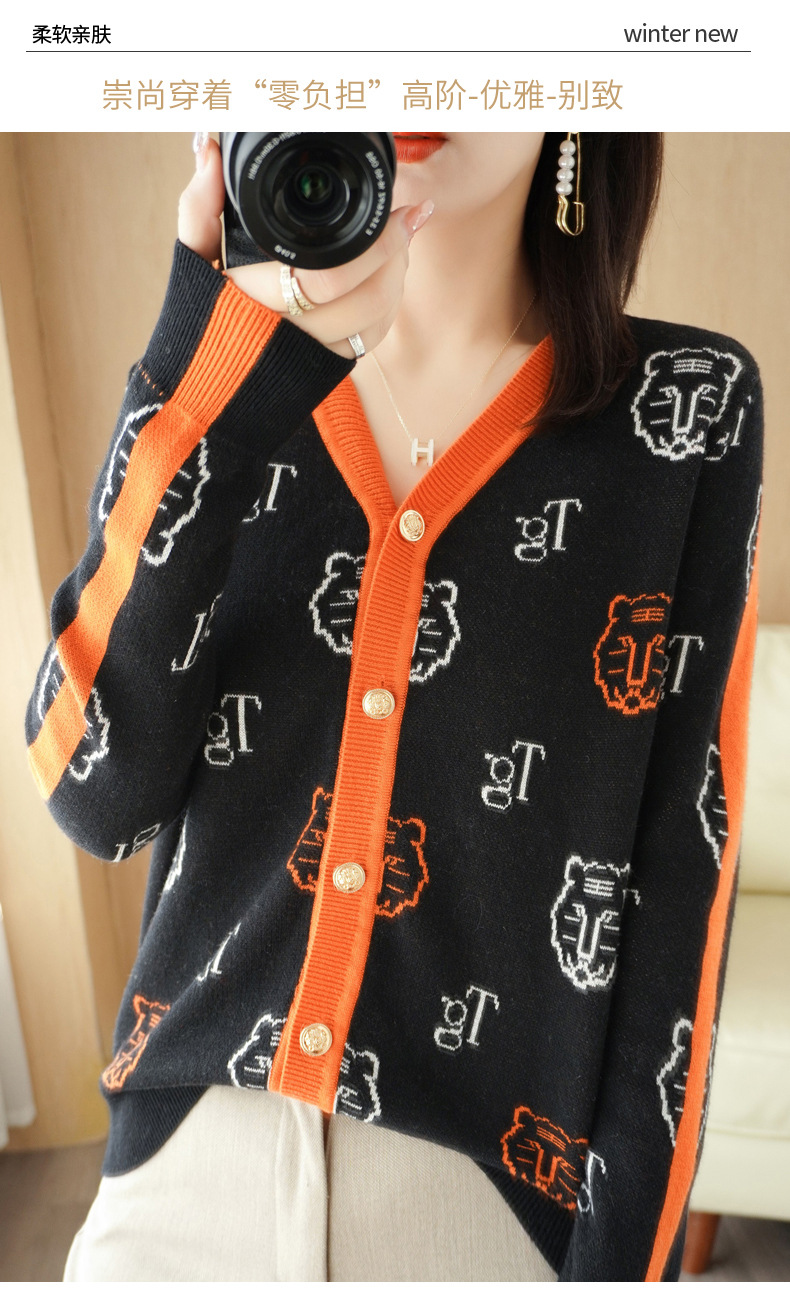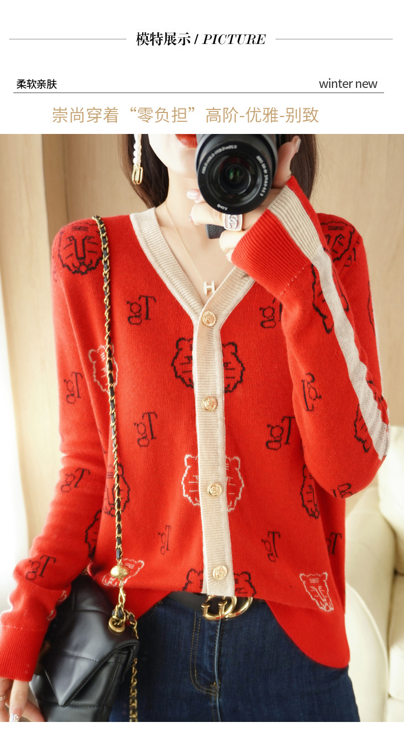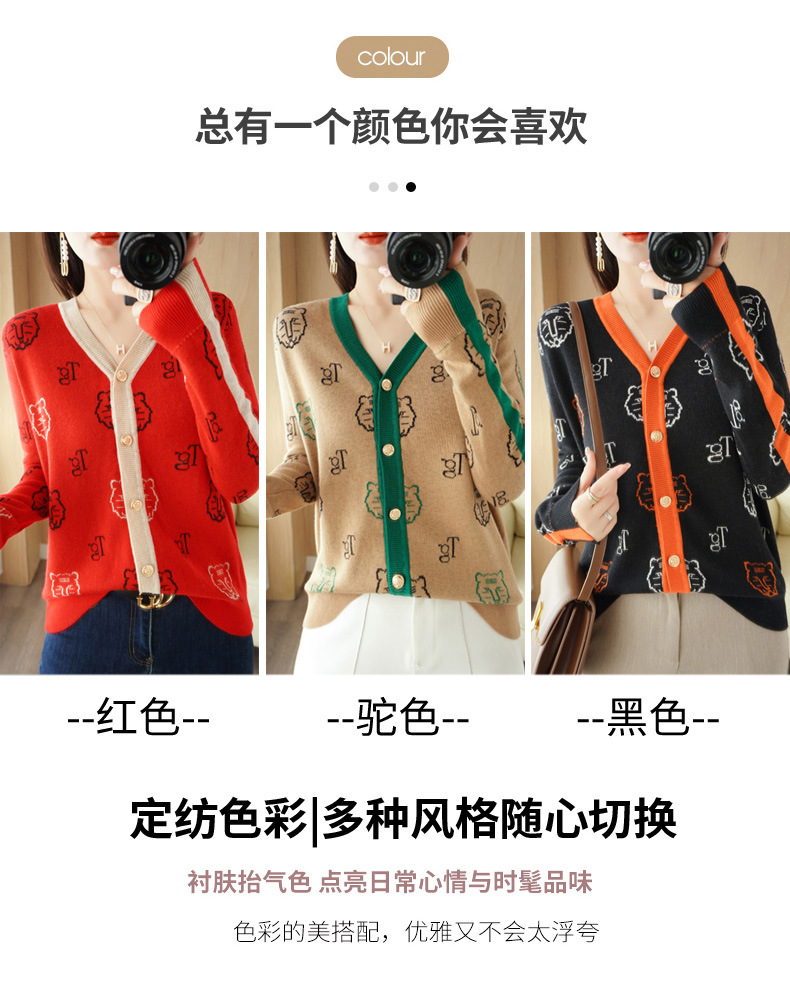 QHJY-JYKS2249秋季新款复古V领针织开衫女虎虎生威提花毛衣外套撞色长袖上衣