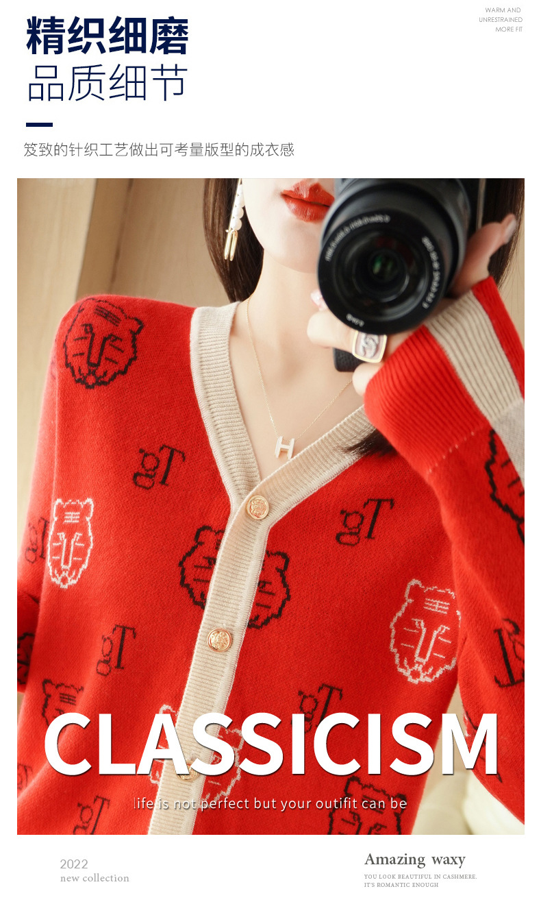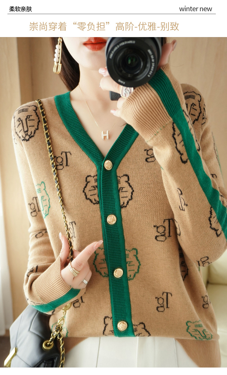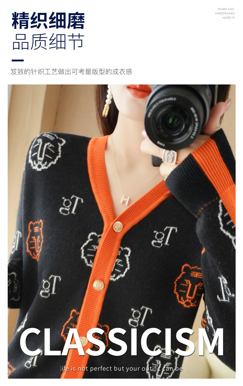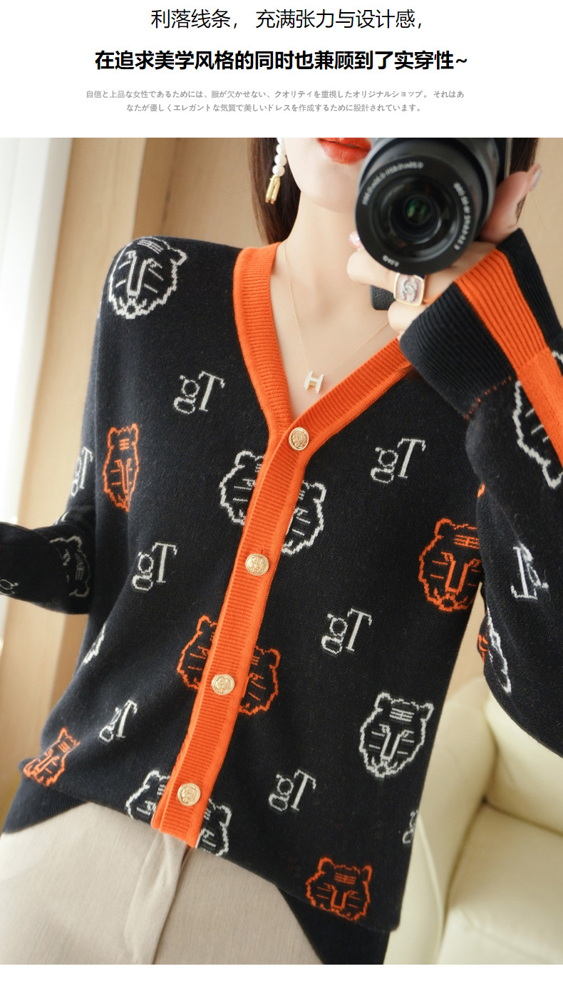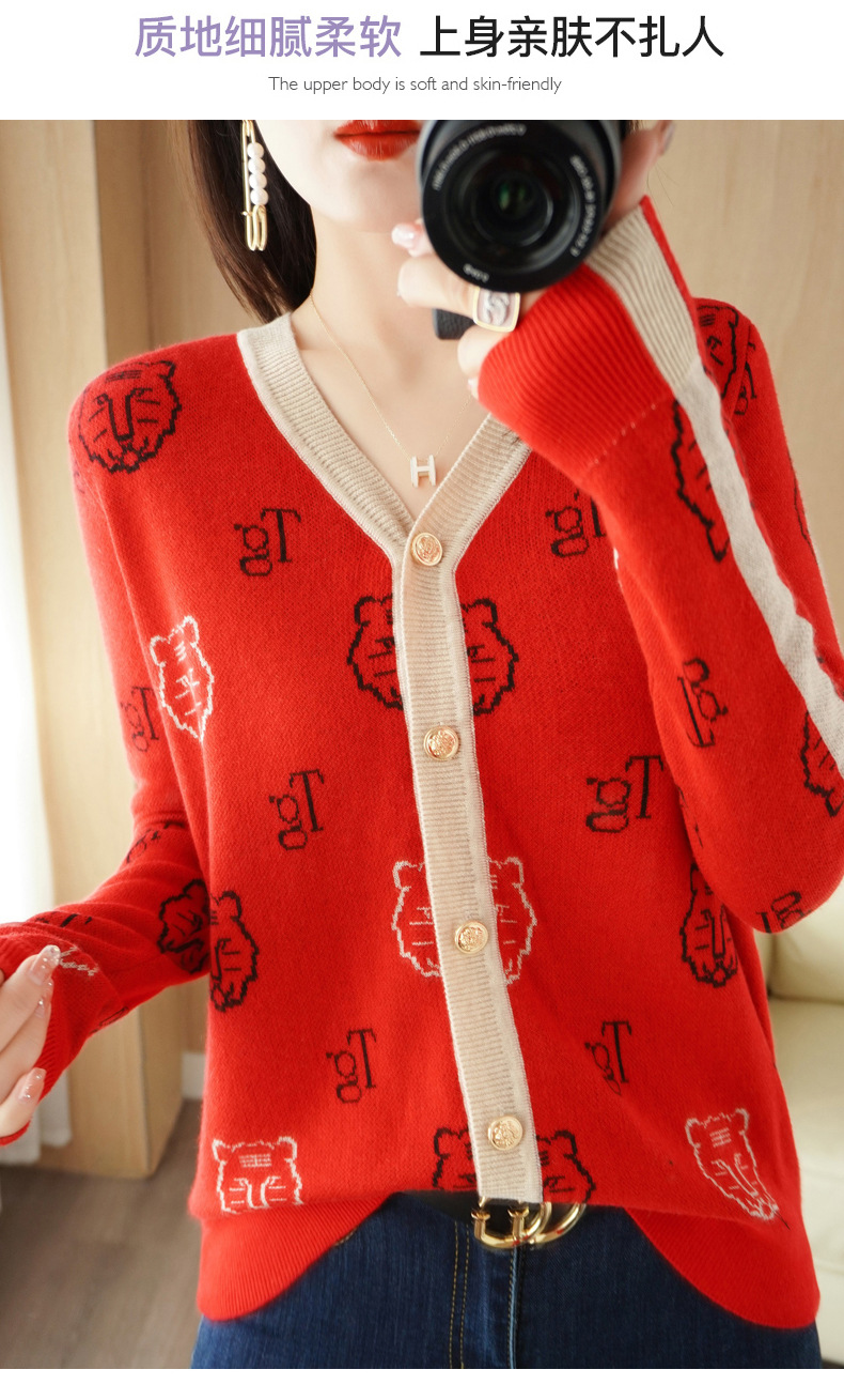 QHJY-JYKS2249秋季新款复古V领针织开衫女虎虎生威提花毛衣外套撞色长袖上衣