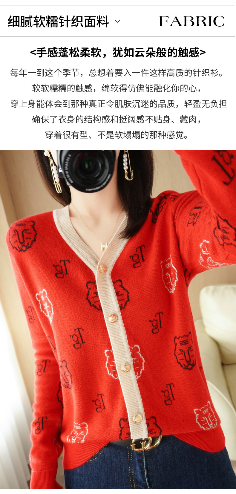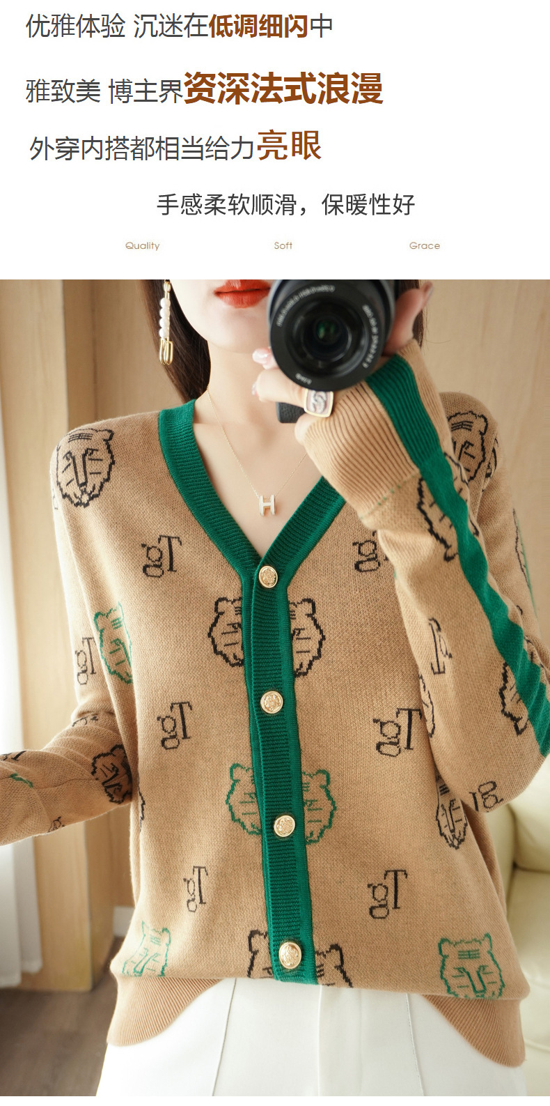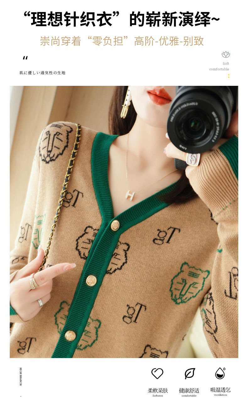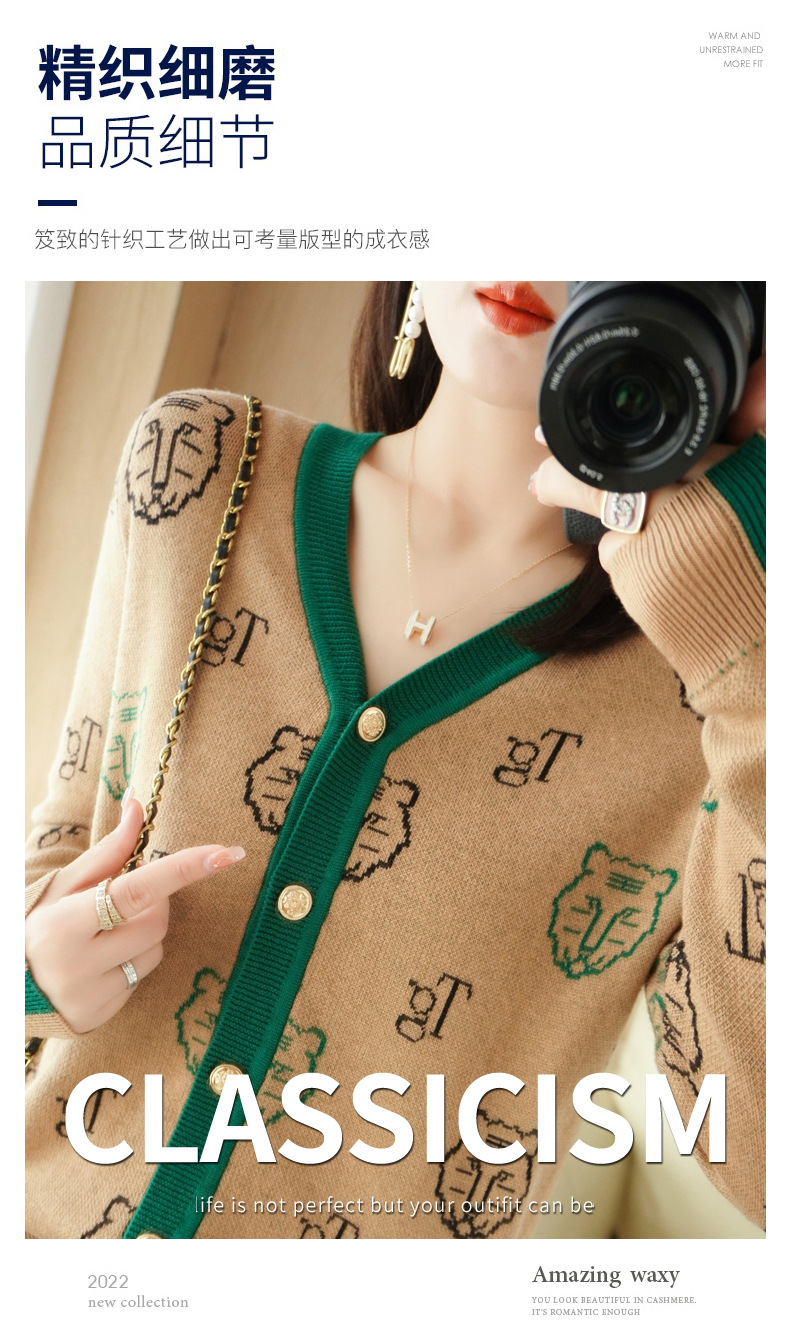 QHJY-JYKS2249秋季新款复古V领针织开衫女虎虎生威提花毛衣外套撞色长袖上衣