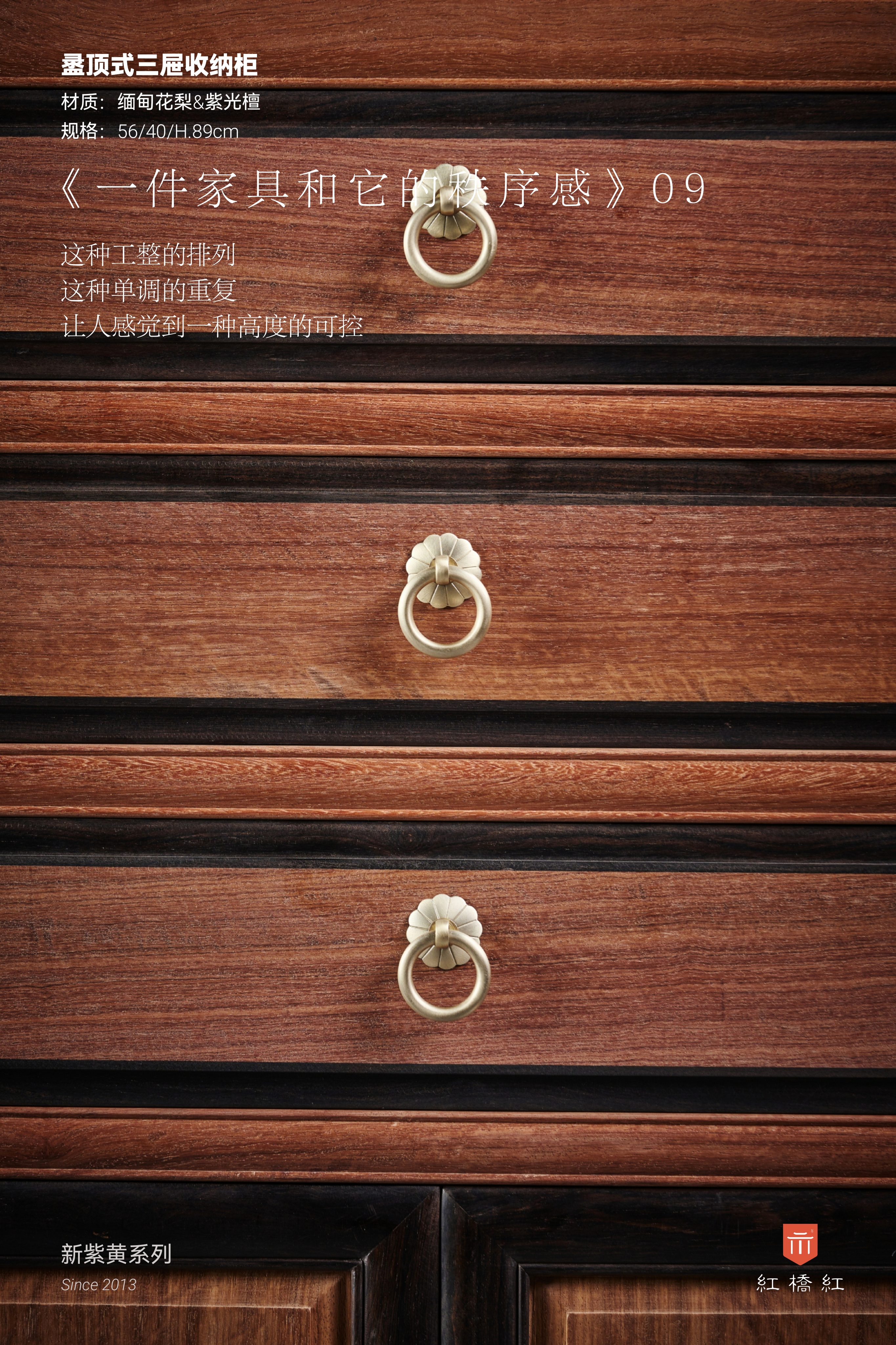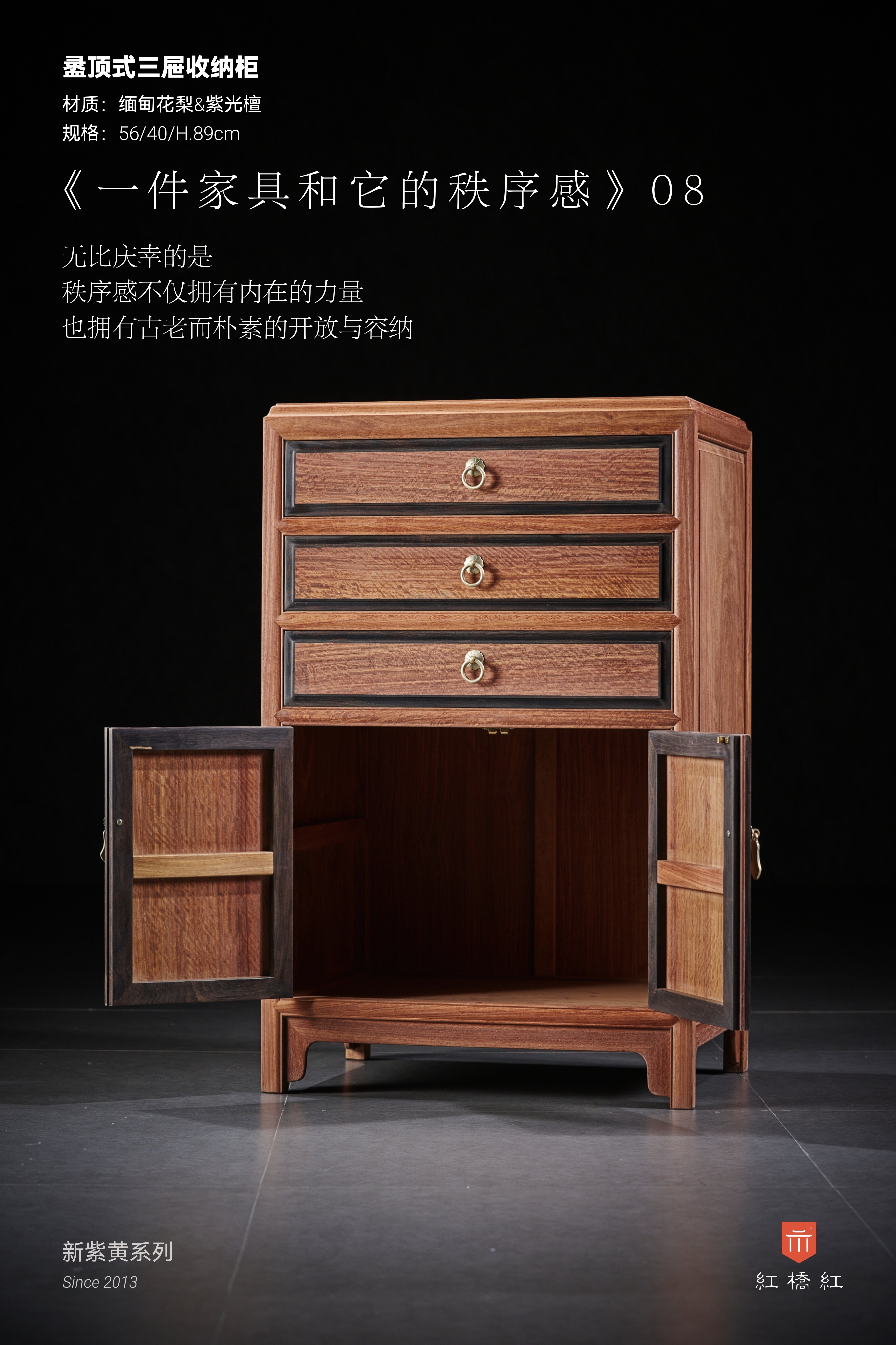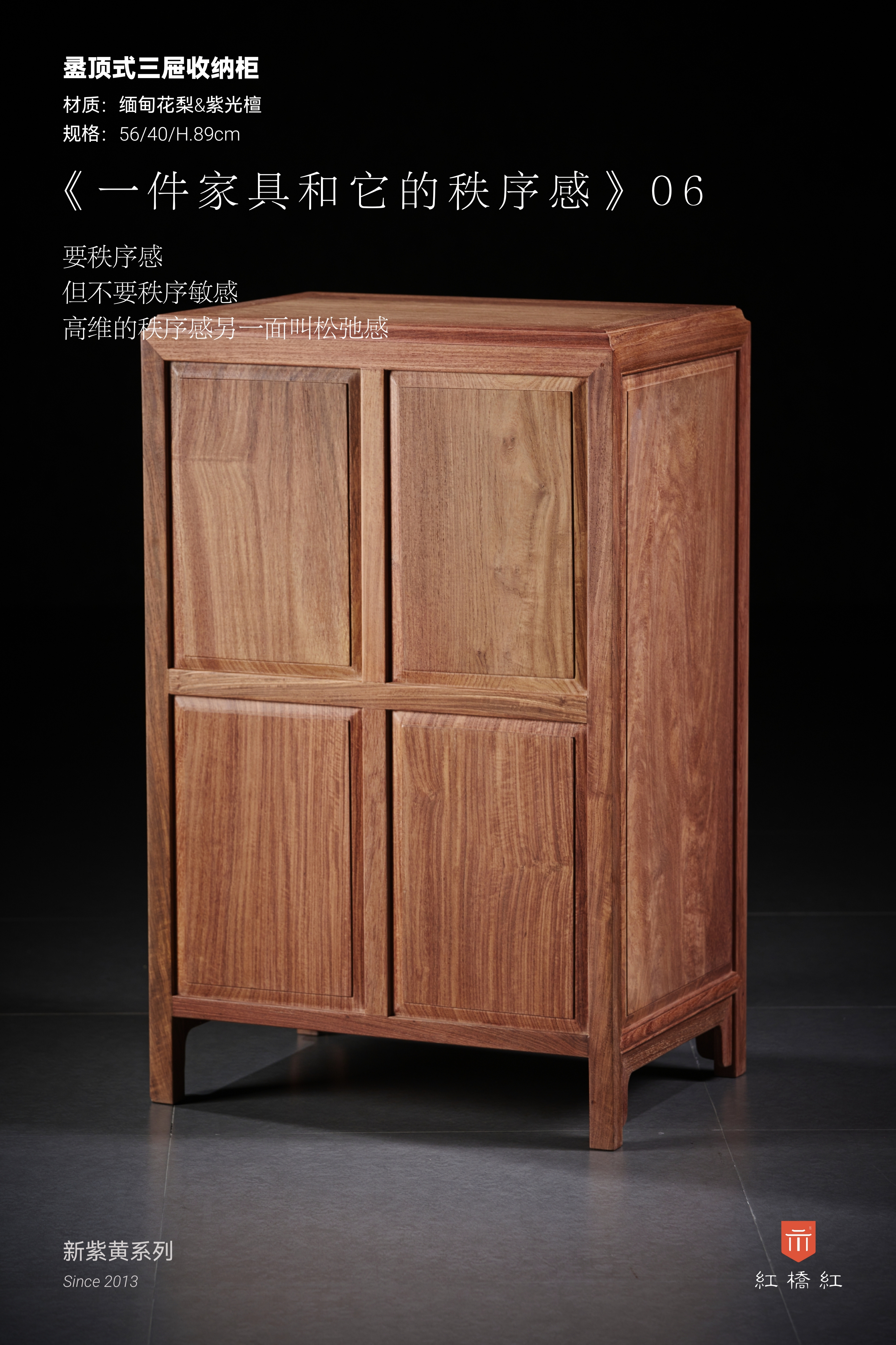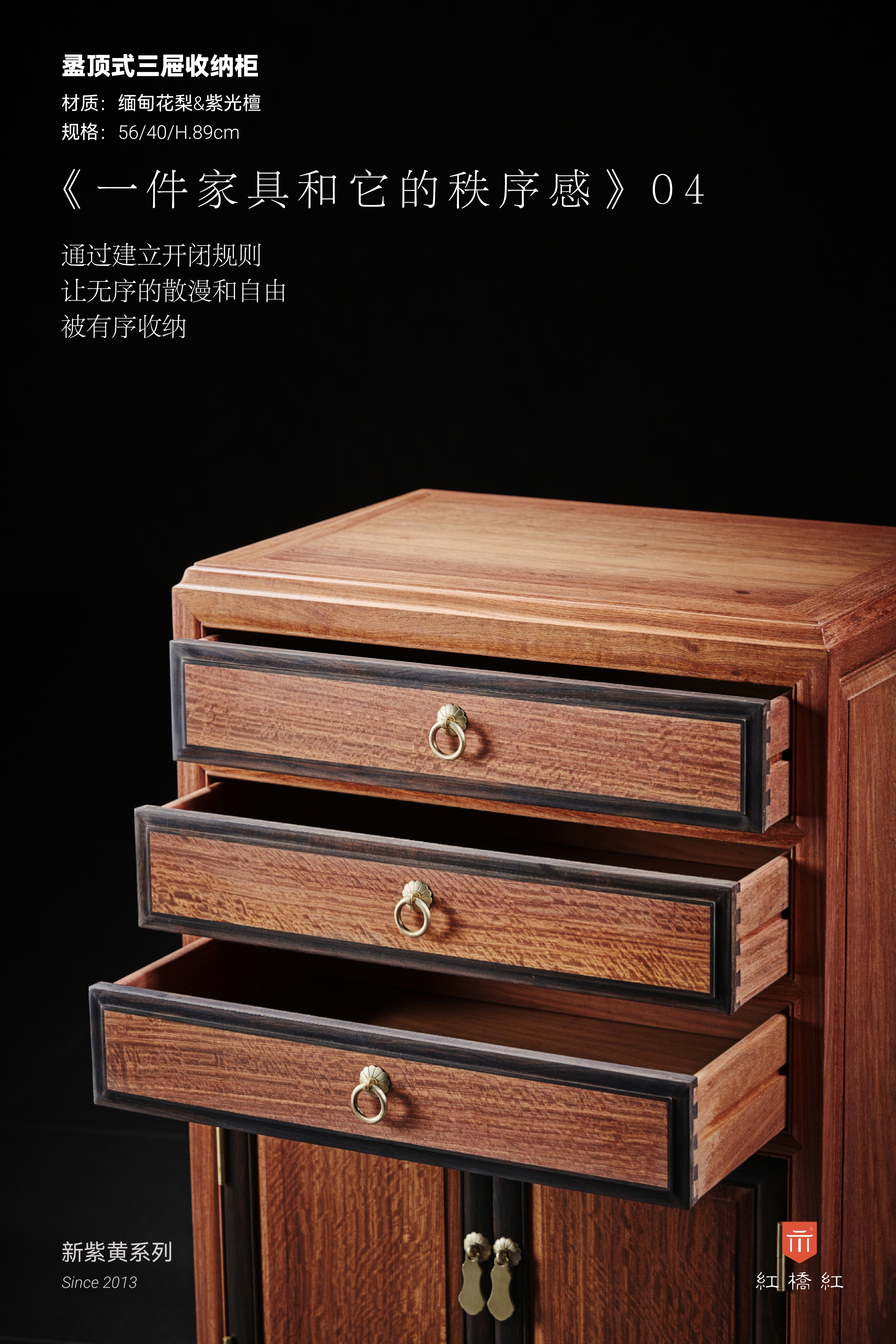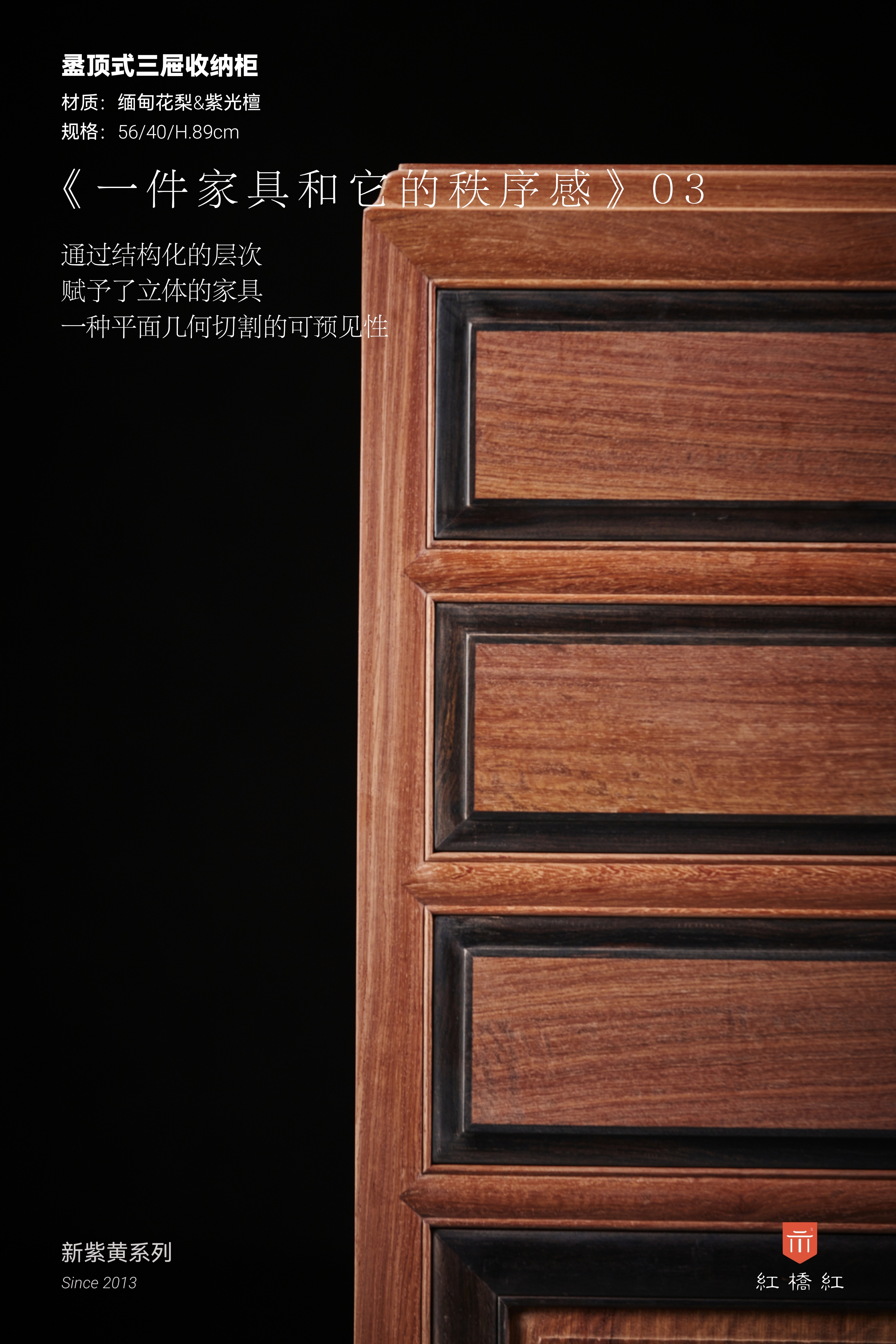 此柜为稳定的大框架,深色的紫光檀围边,这种秩序感让人感到安全;整器设计核心在于,通过主动构建色彩框架,在视觉收缩中找到释放的方向;通过结构化的层次,赋予了立体的家具,一种平面几何切割的可预见性;通过建立开闭规则,让无序的散漫和自由,被有序收纳。