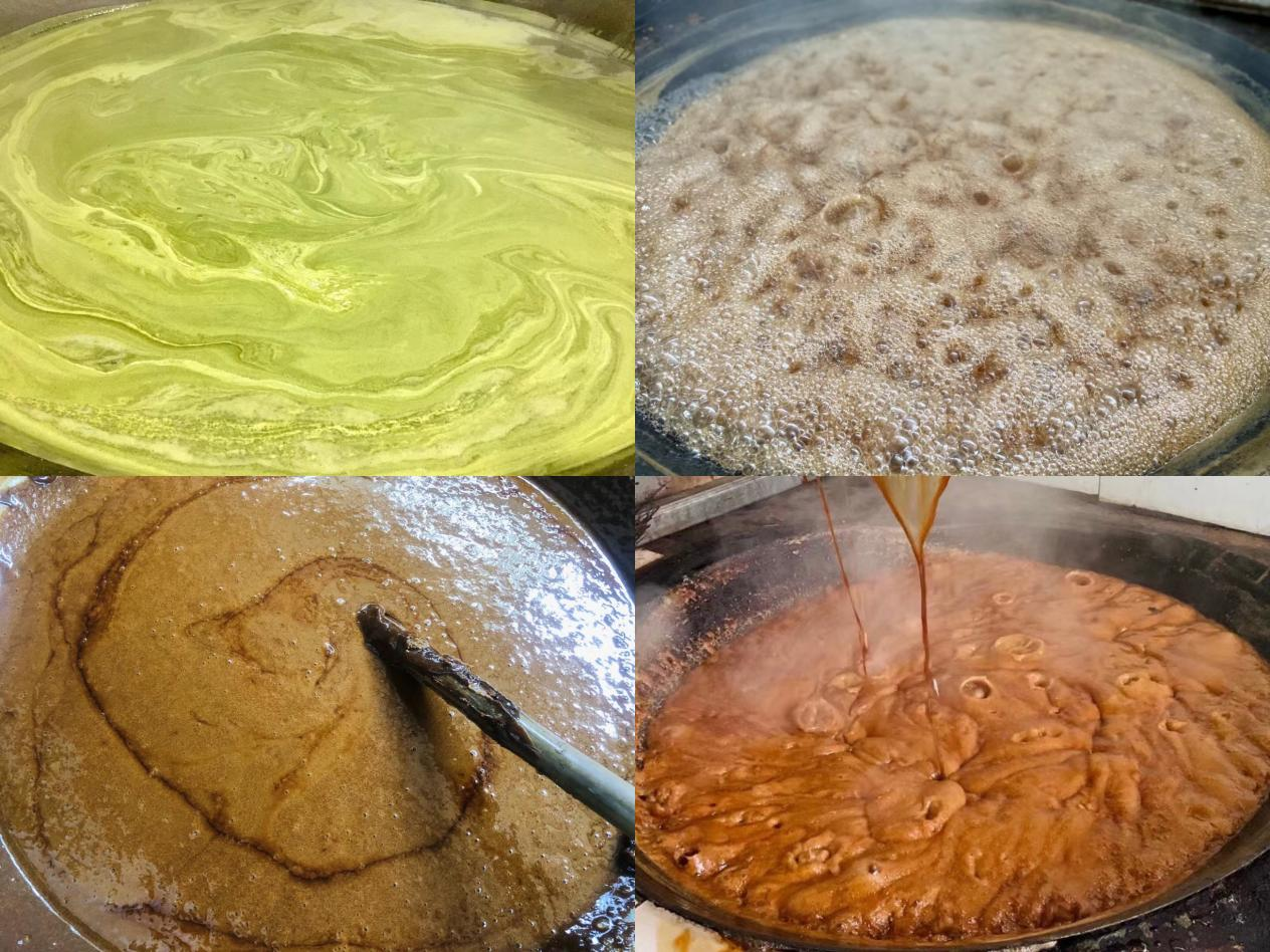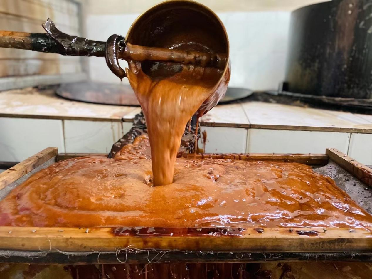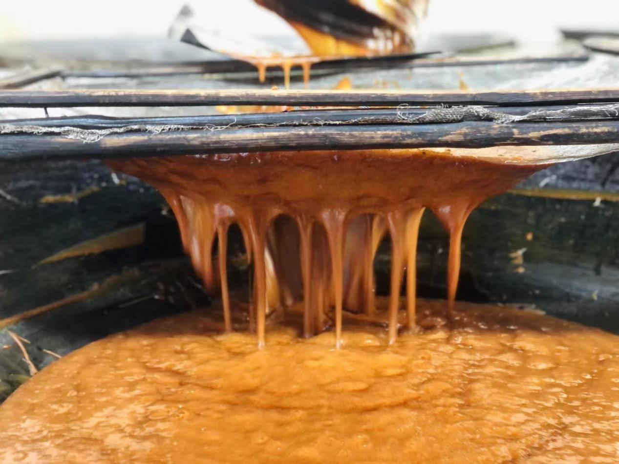 古法红糖工艺繁杂,要经过榨汁、开泡、赶水、过滤、摇瓢、打沙、成型等工序,用大锅熬煮,蒸发掉蔗汁中多余的水分,留下糖分、糖蜜、微量元素及矿物质等诸多成分,这种熬糖方法也叫物理方法。