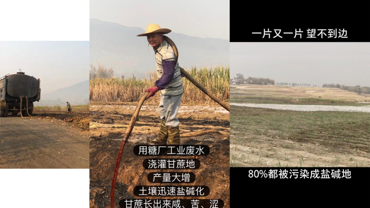 糖厂把工业废水当肥料卖给蔗农,大量浇灌后土地严重盐碱化,实现高产(糖厂废水的味道,闻着就像是死老鼠的味道);