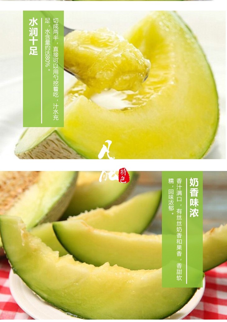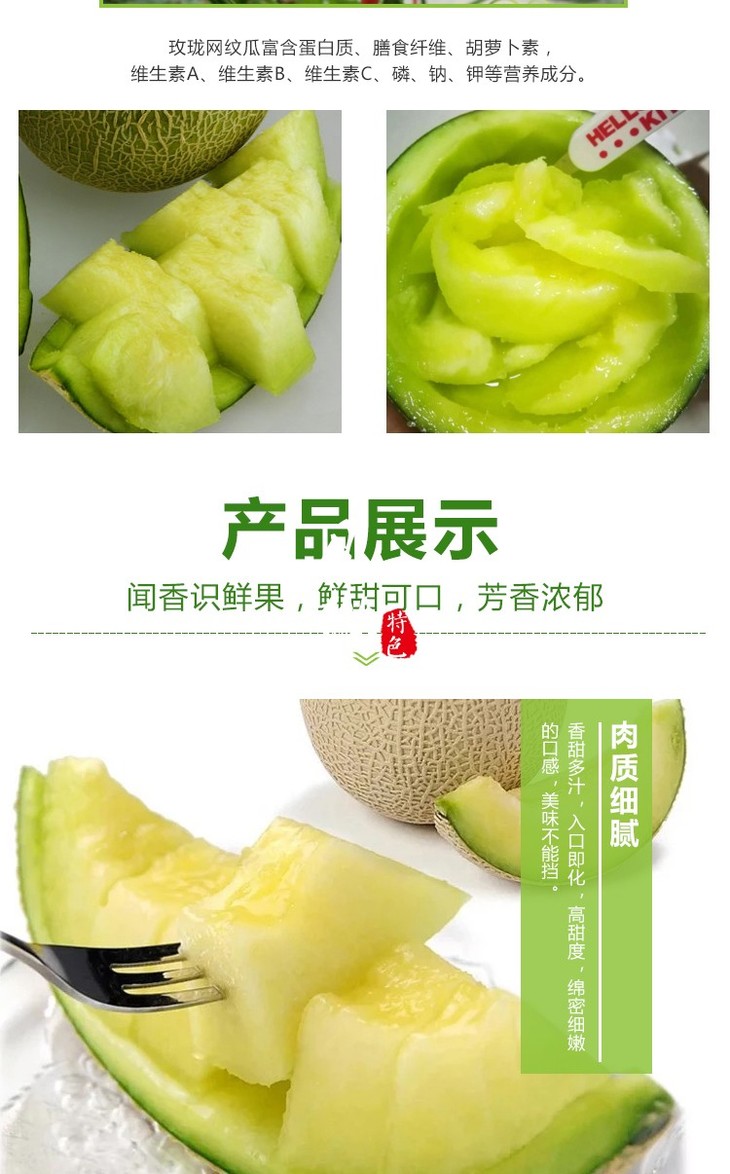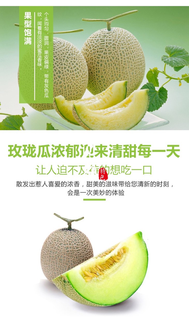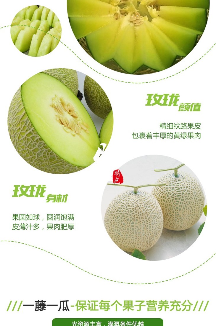 温馨提示:玫珑蜜瓜属于后熟纯软肉果品,高于普通瓜10-15天的孕育期,是玫珑瓜软糯香甜口感得以充分体现。这是一款老少皆宜的果品!