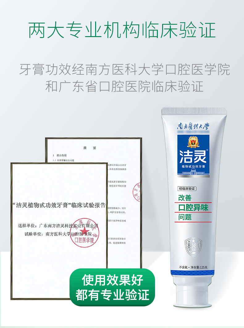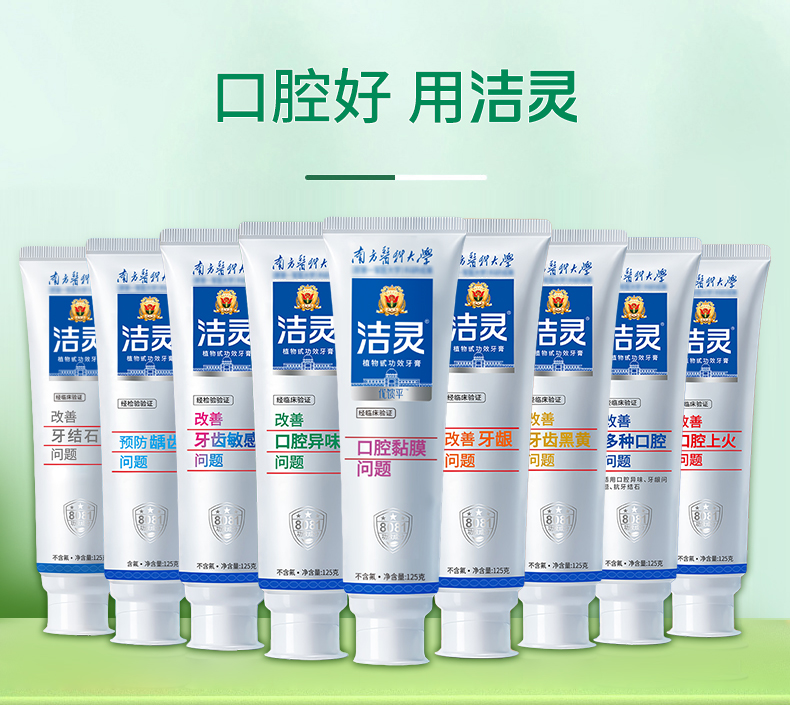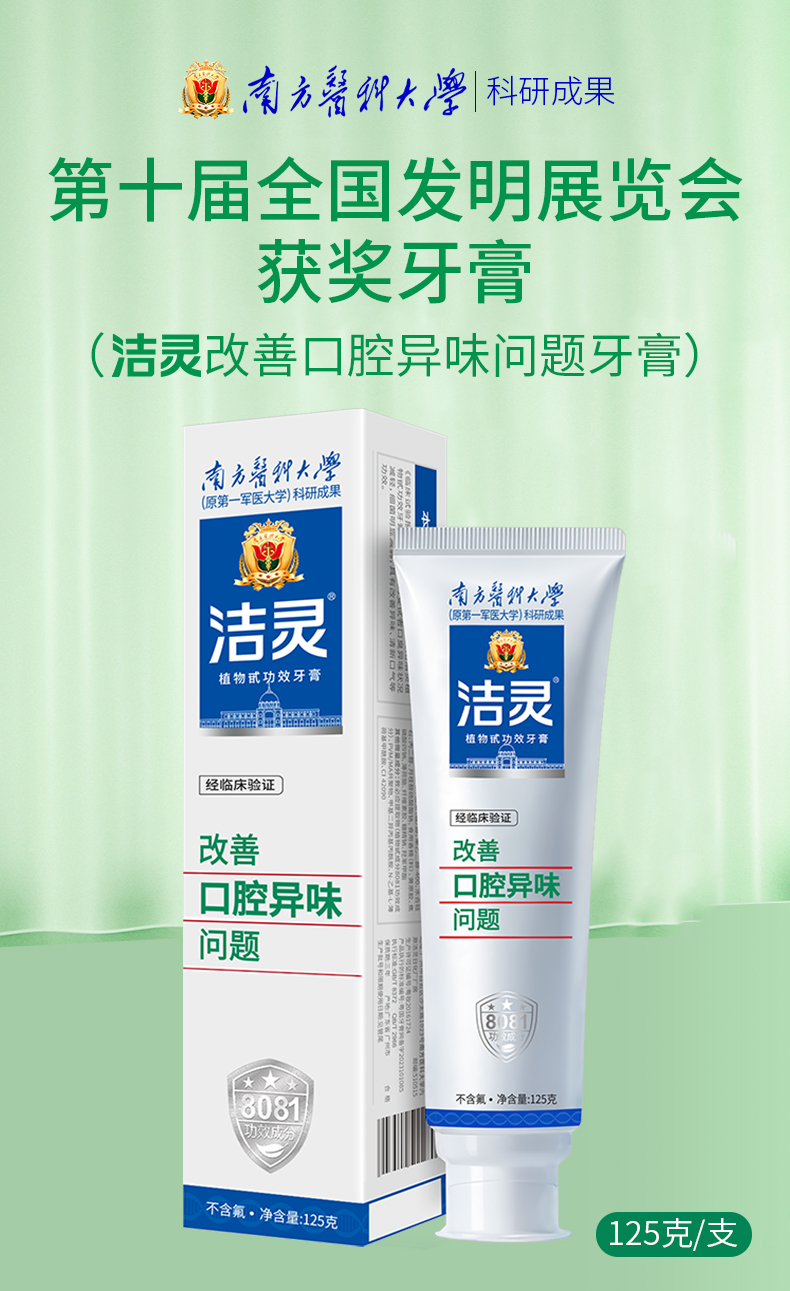 - 洁灵牙膏,由南方医科大学研制,牙膏的核心8081功效成分效果出众,在第十届全国发明展览会成为获奖牙膏。