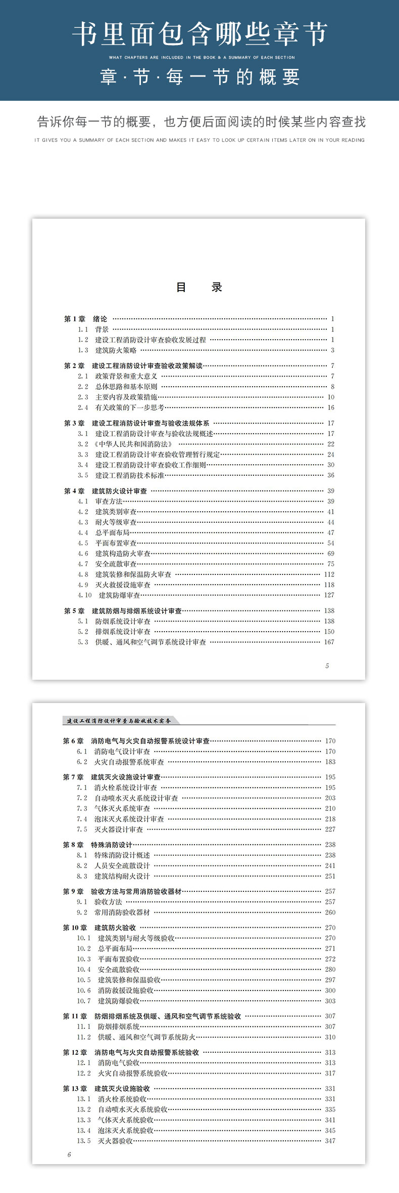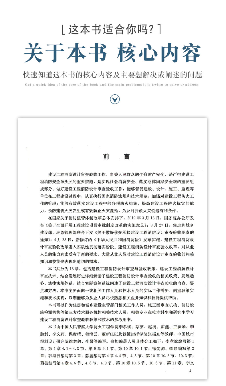 本书从建设工程消防设计审查验收政策、消防技术标准体系、建设工程消防设计审查内容和方法、建设工程消防验收内容和方法、特殊消防设计等方面进行了详细阐述,并附有实际案例,以期能够为从业人员尽快熟悉相关业务知识和技能提供帮助。本书主要为满足一线相关工作人员和技术人员实际工作需要,侧重政策实施和技术实现。 第1篇 建设工程消防设计审查与验收政策:第1章 绪论,第2章 建设工程消防设计审查与验收政策解读,第3章 建设工程消防设计审查与验收法规体系。 第2篇 建设工程消防设计审查技术:第4章 审查方法,第5章 建筑类别与耐火等级审查,第6章 总平面布局审查,第7章 平面布置审查,第8章 建筑构造审查,第9章 安全疏散审查,第10章 建筑装修和保温审查,第11章 灭火救援设施审查,第12章 建筑防爆审查,第13章 防烟排烟系统及供暖、通风和空气调节系统审查,第14章 消防电气审查,第15章 火灾自动报警系统审查,第16章 消火栓系统审查,第17章 自动喷水灭火系统审查,第18章 气体灭火系统审查,第19章 泡沫灭火系统审查,第20章 灭火器审查,第21章 特殊消防设计。 第3篇 建设工程消防验收技术:第22章 验收方法,第23章 建筑类别与耐火等级验收,第24章 总平面布局验收,第25章 平面布置验收,第26章 安全疏散验收,第27章 建筑装修和保温验收,第28章 灭火救援设施验收,第29章 建筑防爆验收,第30章 防烟排烟系统及供暖、通风和空气调节系统验收,第31章 消防电气验收,第32章 火灾自动报警系统验收,第33章 消火栓系统验收,第34章 自动喷水灭火系统验收,第35章 气体灭火系统验收,第36章 泡沫灭火系统验收,第37章 灭火器验收,第38章 常用消防验收器材。