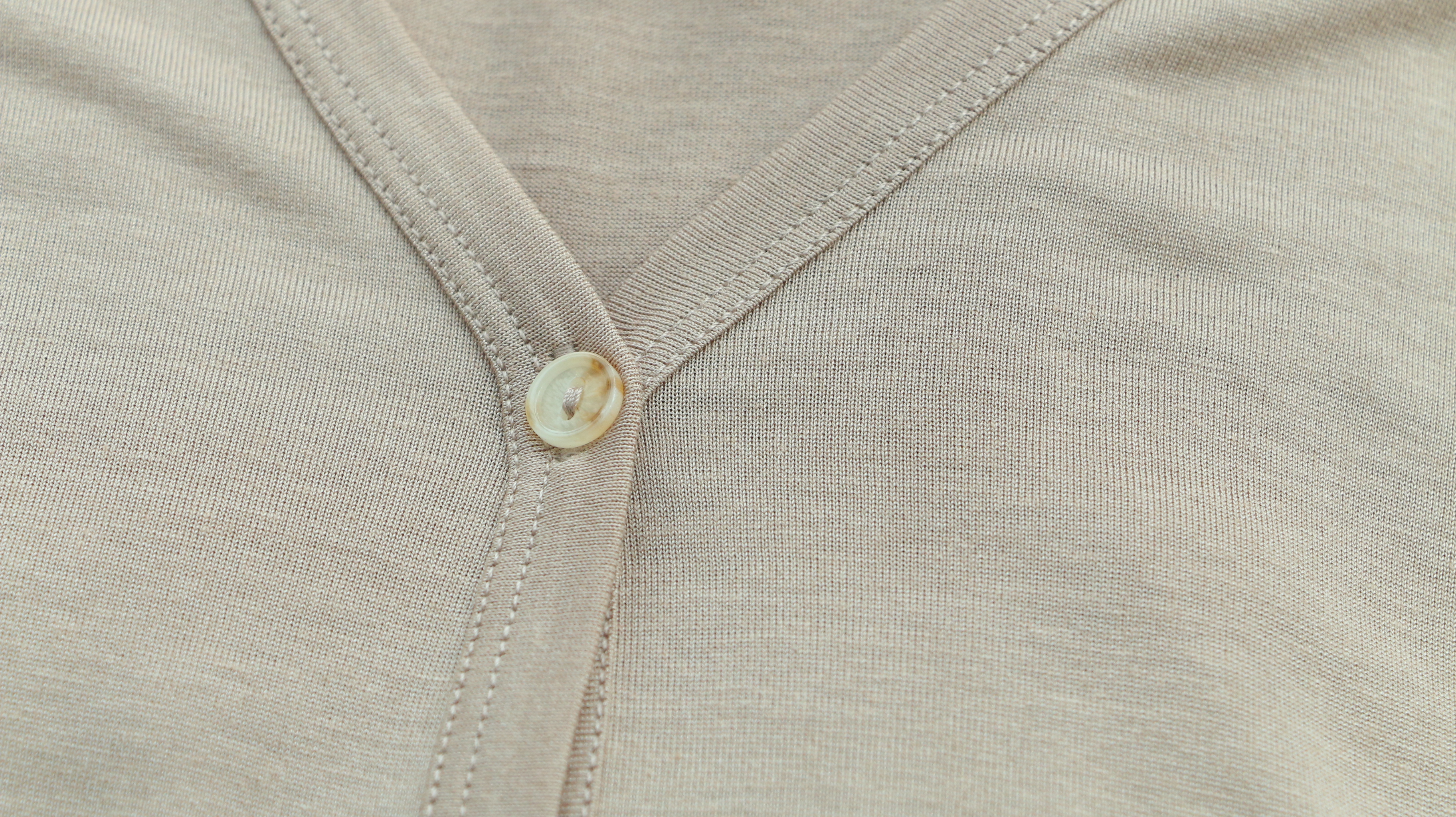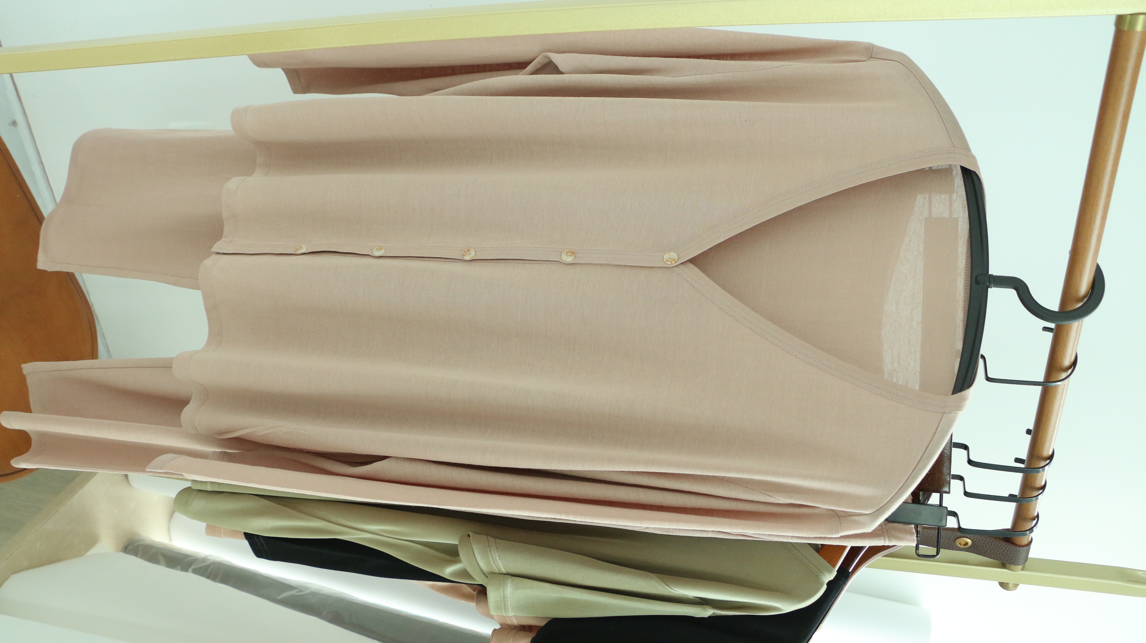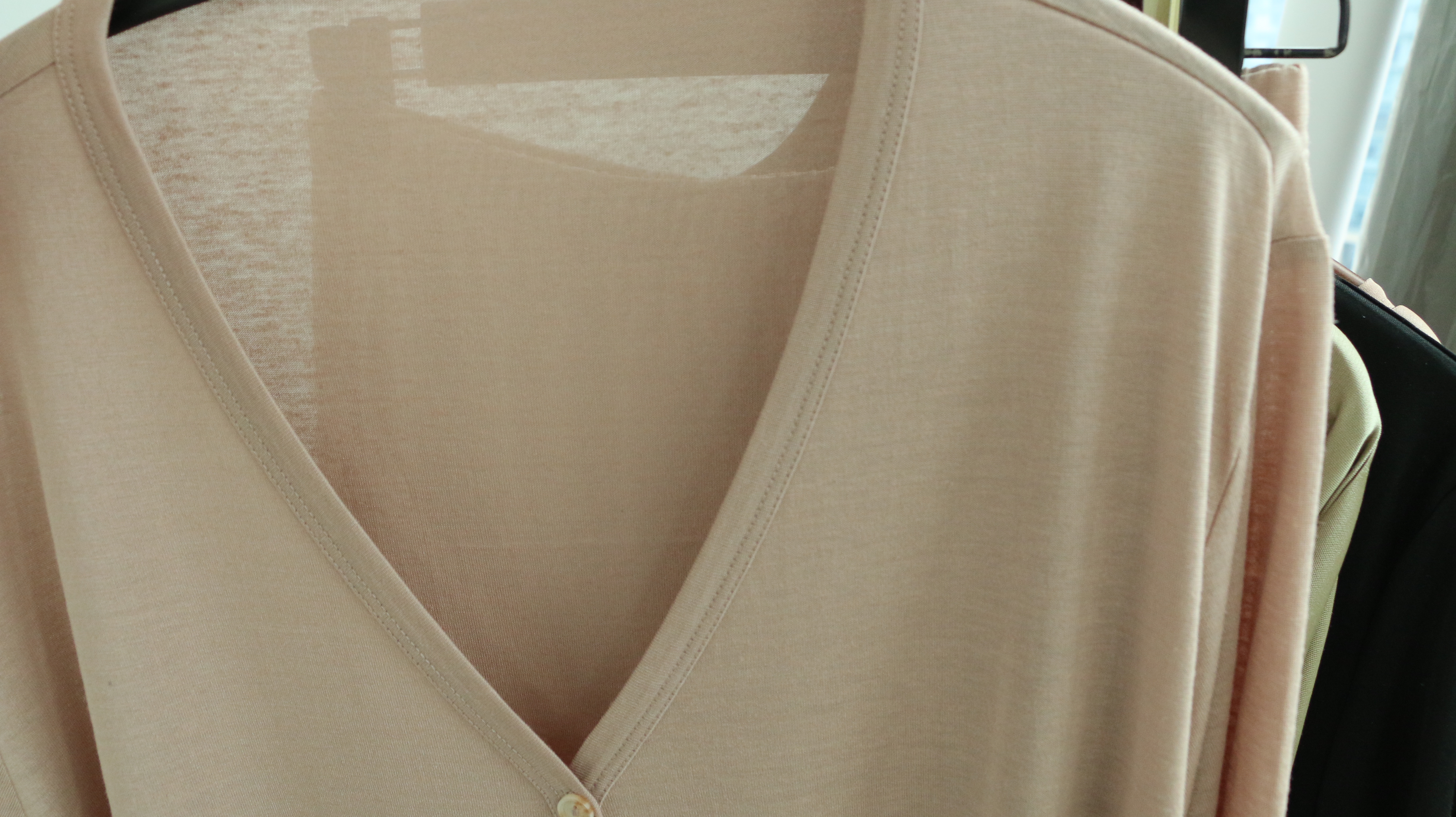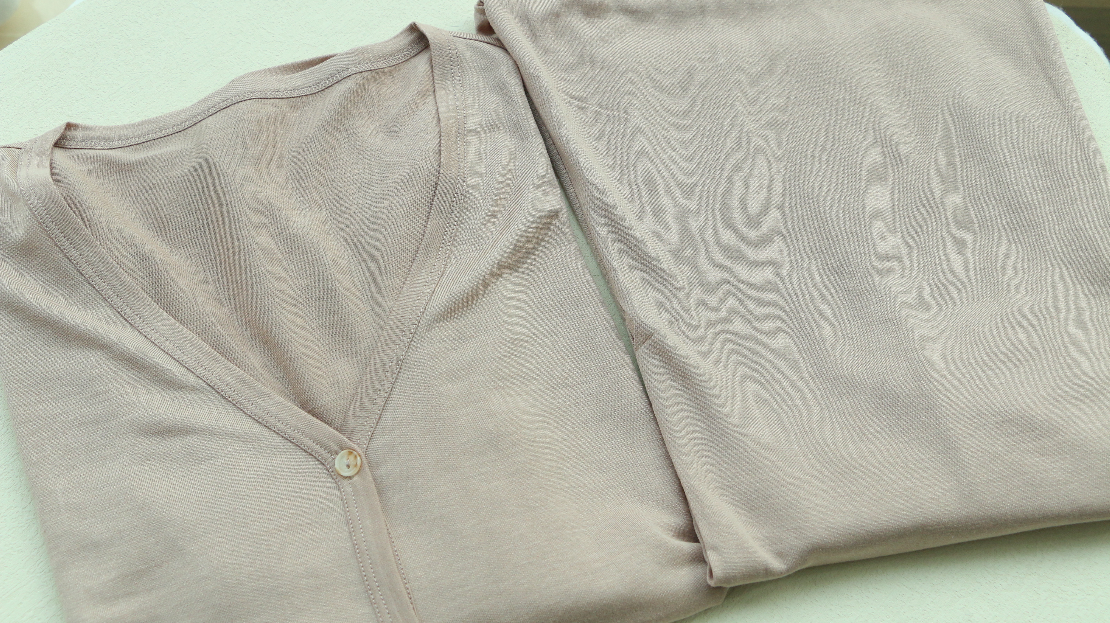 一款是卡其色的真丝+亚麻开衫长裤,适合夏天,透气清凉,抑菌面料,质地细腻又干爽,质朴风格十足,可以一套入,也可以单独入。空调间可以作为保暖的一件,或者室外防晒,都可以的,实用性好,居家穿,室外穿,办公室穿,都行。随身携带也很方便,不太皱的。