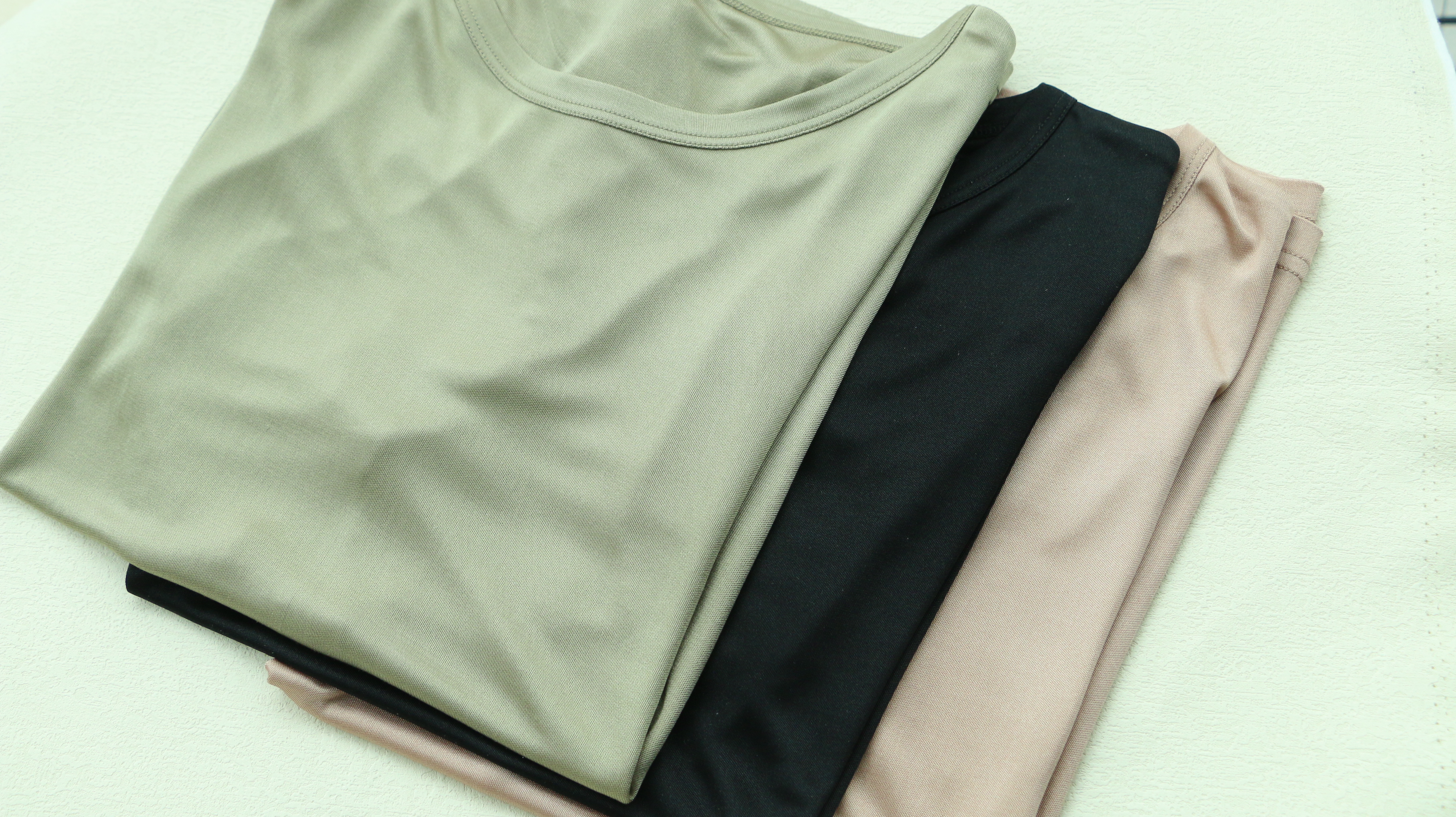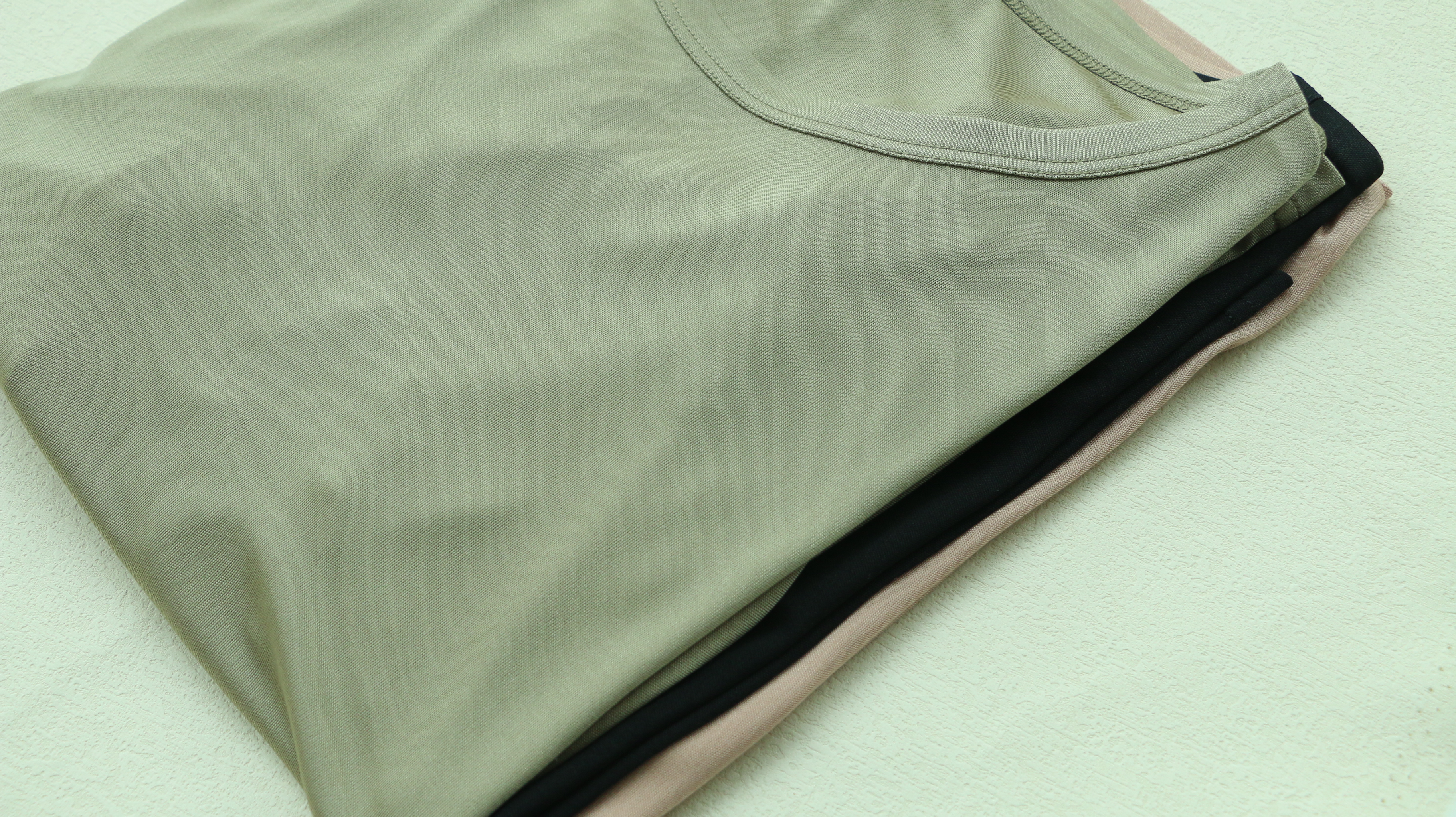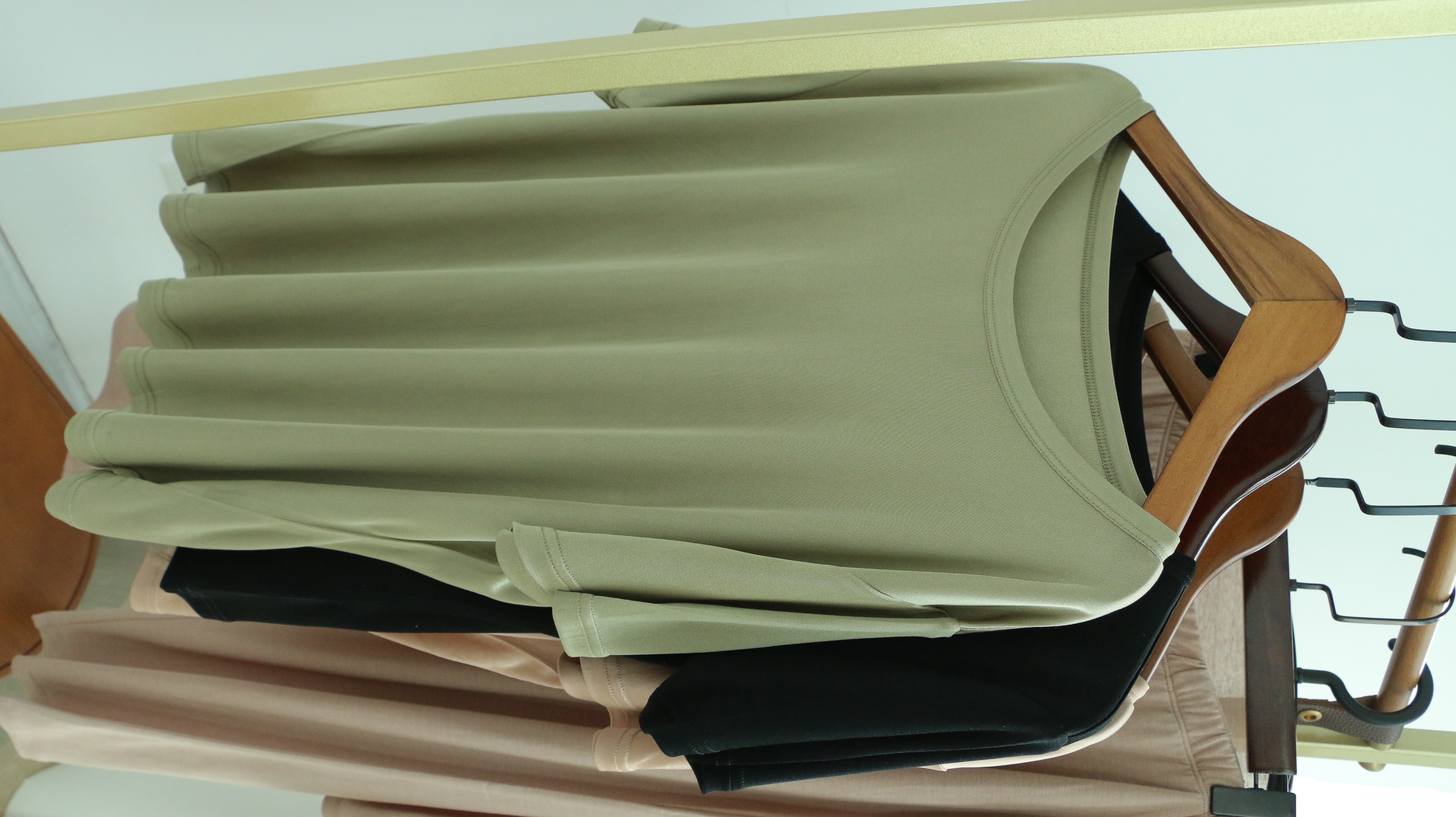 一款是4色的真丝+醋酸面料T恤,现在有绿色,灰色,黑色,卡其色,整体面料轻盈,丝滑,贴肤柔和,另外不是容易皱的质感,丝毫不会感觉邋遢。大圆领,带弹,睡眠时轻薄无量感的一件,适当保温。出门穿,就是一件极简的T,随意搭配下装。