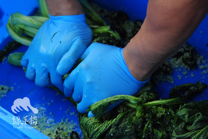 最后,一层菜一层无碘盐码入容器内,加入饮用水没过芥菜,隔绝空气,室温下密封无氧发酵15天以上即可食用。发酵过后,草酸被分解,产生了肽和氨基酸,那是舌头感受到的鲜美风味。