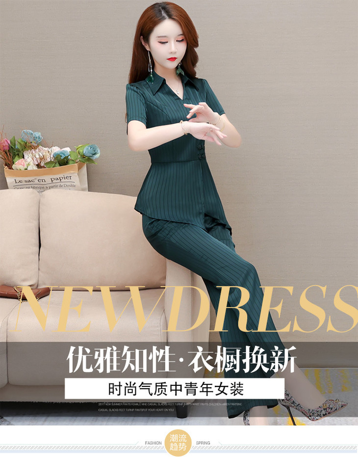 YWE-HG22F41新款时尚气质修身翻领短袖上衣休闲长裤两件套