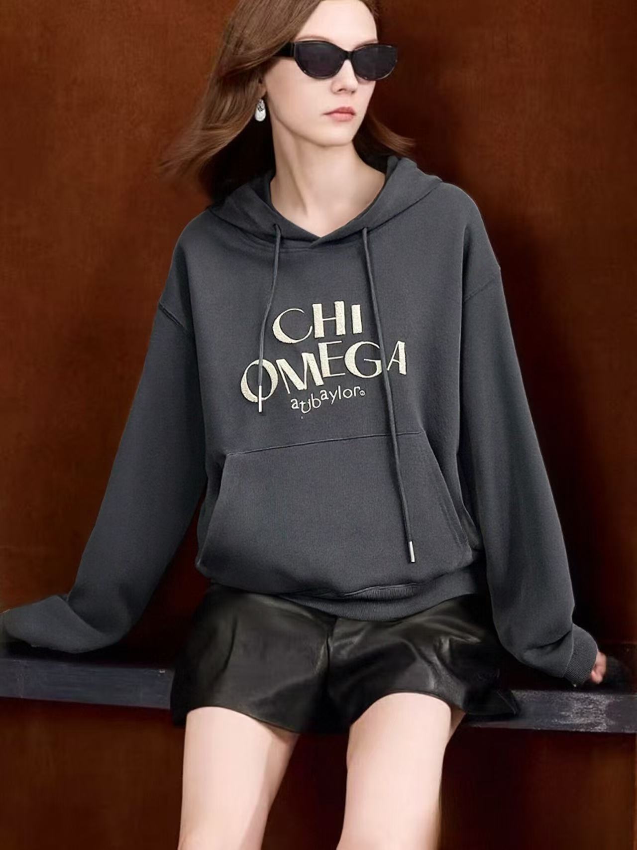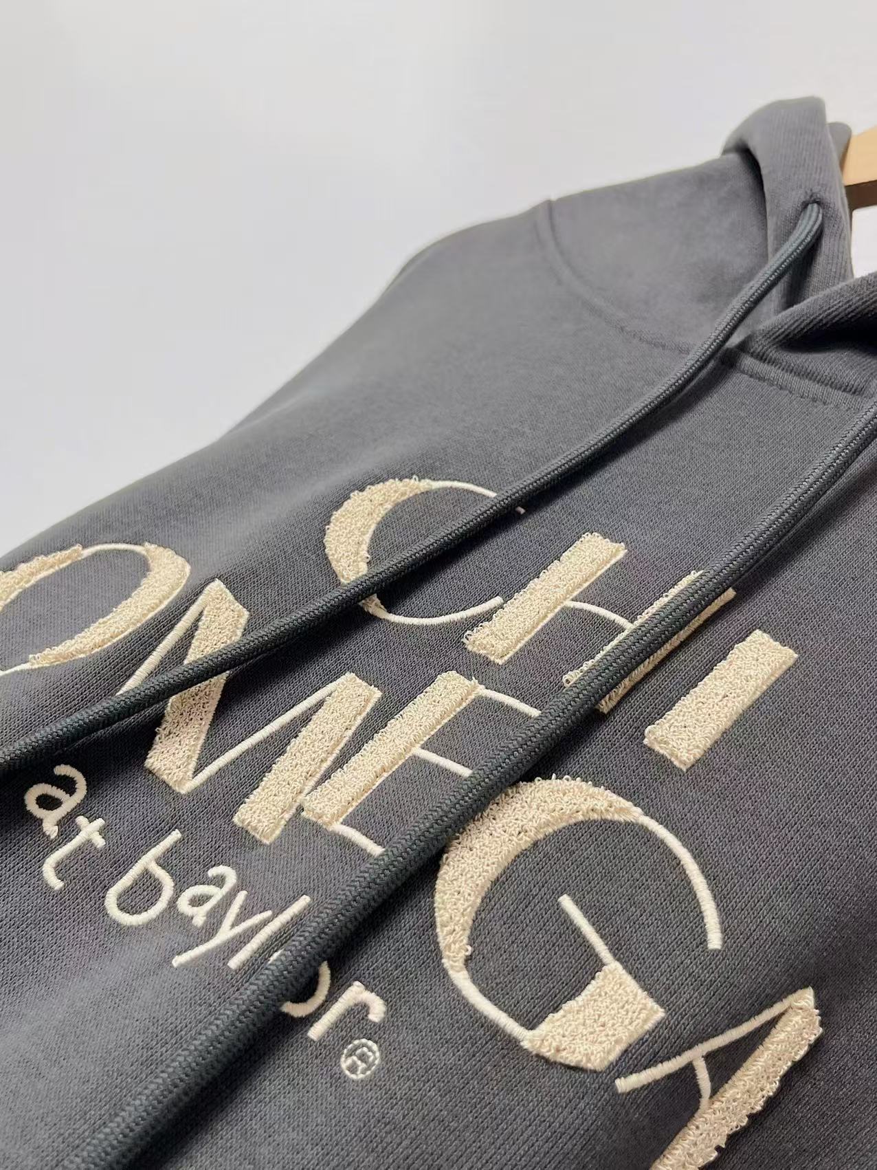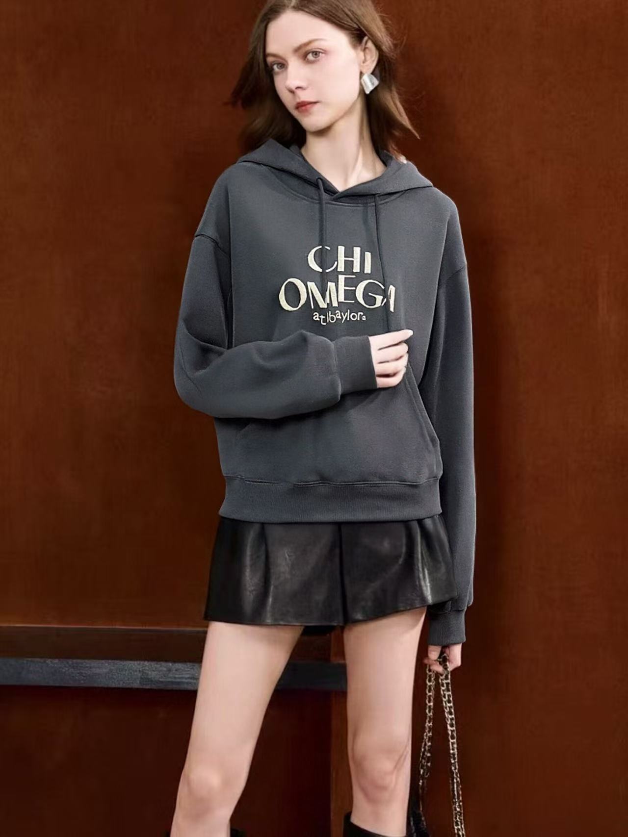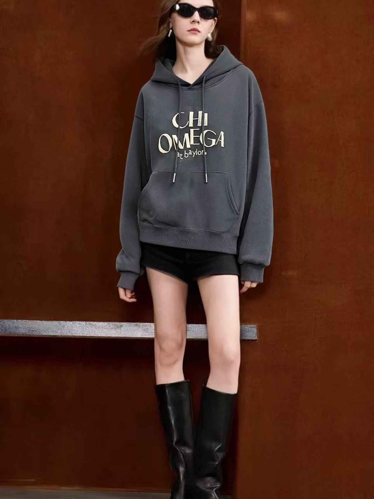 【卫衣系列】工艺系列-刺绣牙刷绣字母灰色短款连帽卫衣-喜出